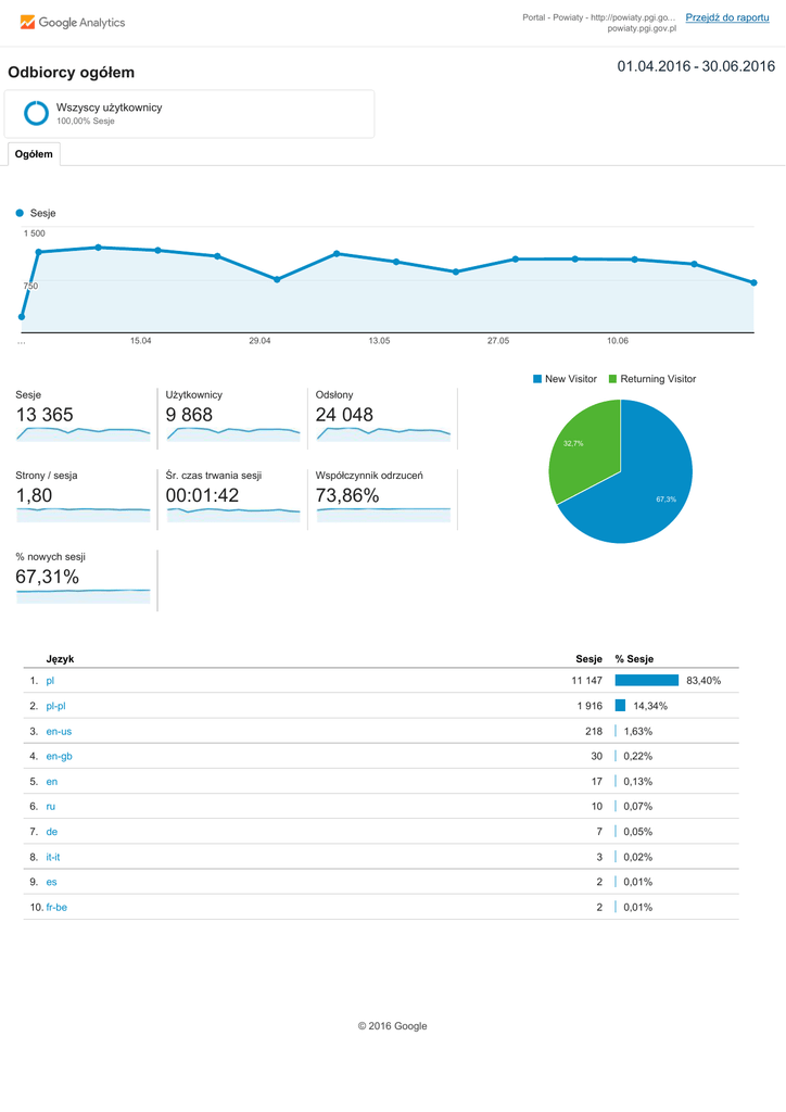 Portal Powiaty http://powiaty.pgi.go… powiaty.pgi.gov.pl Przejdź do raportu 01.04.2016 30.06.2016 Odbiorcy ogółem Wszyscy użytkownicy 100,00% Sesje Ogółem Sesje 1 500 750 … 15.04 29.04 13.05 27.05 10.06 New Visitor Sesje Użytkownicy Odsłony 13 365 9 868 24 048 Returning Visitor 32,7% Strony / sesja Śr. czas trwania sesji Współczynnik odrzuceń 1,80 00:01:42 73,86% 67,3% % nowych sesji 67,31% Język Sesje 1. pl % Sesje 11 147 2. plpl 1 916 83,40% 14,34% 3. enus 218 1,63% 4. engb 30 0,22% 5. en 17 0,13% 6. ru 10 0,07% 7. de 7 0,05% 8. itit 3 0,02% 9. es 2 0,01% 10. frbe 2 0,01% © 2016 Google Portal Powiaty http://powiaty.pgi.go… powiaty.pgi.gov.pl Przejdź do raportu 01.04.2016 30.06.2016 Lokalizacja Wszyscy użytkownicy 100,00% Sesje Nakładka mapy Podsumowanie 1 13 132 Pozyskiwanie Kraj Sesje Zachowanie % nowych sesji 13 365 67,33% Nowi użytkownicy Współczynnik odrzuceń Konwersje Strony / sesja Śr. czas trwania sesji Współczynnik konwersji celu Realizacje celu Wartość celu 8 999 73,86% 1,80 00:01:42 0,00% 0 0,00 USD % całości: 100,00% (13 365) Śr. dla widoku danych: 67,31% (0,03%) % całości: 100,03% (8 996) Śr. dla widoku danych: 73,86% (0,00%) Śr. dla widoku danych: 1,80 (0,00%) Śr. dla widoku danych: 00:01:42 (0,00%) Śr. dla widoku danych: 0,00% (0,00%) % całości: 0,00% (0) % całości: 0,00% (0,00 USD) 13 132 (98,26%) 67,11% 8 813 (97,93%) 73,77% 1,80 00:01:42 0,00% 0 (0,00%) 0,00 USD (0,00%) 1. Poland 2. Germany 60 (0,45%) 71,67% 43 (0,48%) 70,00% 1,83 00:02:01 0,00% 0 (0,00%) 0,00 USD (0,00%) 3. United Kingdom 47 (0,35%) 76,60% 36 (0,40%) 91,49% 1,19 00:00:44 0,00% 0 (0,00%) 0,00 USD (0,00%) 4. United States 13 (0,10%) 76,92% 10 (0,11%) 61,54% 4,15 00:08:17 0,00% 0 (0,00%) 0,00 USD (0,00%) 5. France 12 (0,09%) 100,00% 12 (0,13%) 75,00% 1,42 00:03:03 0,00% 0 (0,00%) 0,00 USD (0,00%) 6. Kenya 12 (0,09%) 91,67% 11 (0,12%) 66,67% 1,50 00:00:24 0,00% 0 (0,00%) 0,00 USD (0,00%) 12 (0,09%) 100,00% 12 (0,13%) 100,00% 1,00 00:00:00 0,00% 0 (0,00%) 0,00 USD (0,00%) 7. (not set) 8. Czech Republic 7 (0,05%) 71,43% 5 (0,06%) 71,43% 1,71 00:00:26 0,00% 0 (0,00%) 0,00 USD (0,00%) 9. Sweden 7 (0,05%) 85,71% 6 (0,07%) 85,71% 1,14 00:02:22 0,00% 0 (0,00%) 0,00 USD (0,00%) 10. Austria 6 (0,04%) 100,00% 6 (0,07%) 66,67% 1,33 00:02:27 0,00% 0 (0,00%) 0,00 USD (0,00%) Wiersze 110 z 27 © 2016 Google Portal Powiaty http://powiaty.pgi.gov.pl powiaty.pgi.gov.pl Przejdź do raportu 01.04.2016 30.06.2016 Lokalizacja WSZYSTKIE » KRAJ: Poland Wszyscy użytkownicy 98,26% Sesje Nakładka mapy Podsumowanie 1 3 119 Pozyskiwanie Region Sesje Zachowanie % nowych sesji 13 132 67,11% Nowi użytkownicy 8 813 Współczynnik odrzuceń Konwersje Strony / sesja Śr. czas trwania sesji Współczynnik konwersji celu 73,77% 1,80 00:01:42 Realizacje celu Wartość celu 0,00% 0 0,00 USD % całości: 98,26% (13 365) Śr. dla widoku danych: 67,31% (0,30%) % całości: 97,97% (8 996) Śr. dla widoku danych: 73,86% (0,12%) Śr. dla widoku danych: 1,80 (0,18%) Śr. dla widoku danych: 00:01:42 (0,09%) Śr. dla widoku danych: 0,00% (0,00%) % całości: 0,00% (0) % całości: 0,00% (0,00 USD) 1. Masovian Voivodeship 3 119 (23,75%) 68,64% 2 141 (24,29%) 76,08% 1,74 00:01:37 0,00% 0 (0,00%) 0,00 USD (0,00%) 2. Lesser Poland Voivodeship 2 215 (16,87%) 62,53% 1 385 (15,72%) 74,22% 1,69 00:01:28 0,00% 0 (0,00%) 0,00 USD (0,00%) 3. Silesian Voivodeship 1 362 (10,37%) 72,03% 981 (11,13%) 72,98% 1,74 00:01:31 0,00% 0 (0,00%) 0,00 USD (0,00%) 4. Lower Silesian Voivodeship 1 086 (8,27%) 69,71% 757 (8,59%) 71,36% 1,85 00:02:01 0,00% 0 (0,00%) 0,00 USD (0,00%) 5. Greater Poland Voivodeship 1 030 (7,84%) 66,70% 687 (7,80%) 72,23% 1,92 00:01:36 0,00% 0 (0,00%) 0,00 USD (0,00%) 6. Pomeranian Voivodeship 631 (4,81%) 73,85% 466 (5,29%) 74,33% 1,93 00:01:53 0,00% 0 (0,00%) 0,00 USD (0,00%) 7. Lublin Voivodeship 517 (3,94%) 61,90% 320 (3,63%) 70,60% 2,00 00:02:28 0,00% 0 (0,00%) 0,00 USD (0,00%) 8. Lodz Voivodeship 516 (3,93%) 63,95% 330 (3,74%) 72,09% 1,98 00:02:21 0,00% 0 (0,00%) 0,00 USD (0,00%) 9. Podkarpackie Voivodeship 505 (3,85%) 65,54% 331 (3,76%) 68,71% 1,90 00:01:49 0,00% 0 (0,00%) 0,00 USD (0,00%) 10. KuyavianPomeranian Voivodeship 449 (3,42%) 68,60% 308 (3,49%) 73,27% 1,77 00:01:49 0,00% 0 (0,00%) 0,00 USD (0,00%) 11. Swietokrzyskie 368 (2,80%) 58,70% 216 (2,45%) 76,63% 1,71 00:01:20 0,00% 0 (0,00%) 0,00 USD (0,00%) 12. WarmianMasurian Voivodeship 355 (2,70%) 77,18% 274 (3,11%) 77,46% 1,67 00:01:53 0,00% 0 (0,00%) 0,00 USD (0,00%) 13. Podlaskie Voivodeship 344 (2,62%) 48,84% 168 (1,91%) 79,07% 1,73 00:01:18 0,00% 0 (0,00%) 0,00 USD (0,00%) 14. West Pomeranian Voivodeship 342 (2,60%) 80,12% 274 (3,11%) 76,32% 1,74 00:01:18 0,00% 0 (0,00%) 0,00 USD (0,00%) 15. Lubusz Voivodeship 152 (1,16%) 51,32% 78 (0,89%) 60,53% 2,22 00:02:22 0,00% 0 (0,00%) 0,00 USD (0,00%) 16. Opole Voivodeship 140 (1,07%) 68,57% 96 (1,09%) 67,14% 2,41 00:02:34 0,00% 0 (0,00%) 0,00 USD (0,00%) 17. (not set) 1 (0,01%) 100,00% 1 (0,01%) 0,00% 6,00 00:02:48 0,00% 0 (0,00%) 0,00 USD (0,00%) Wiersze 117 z 17 © 2016 Google