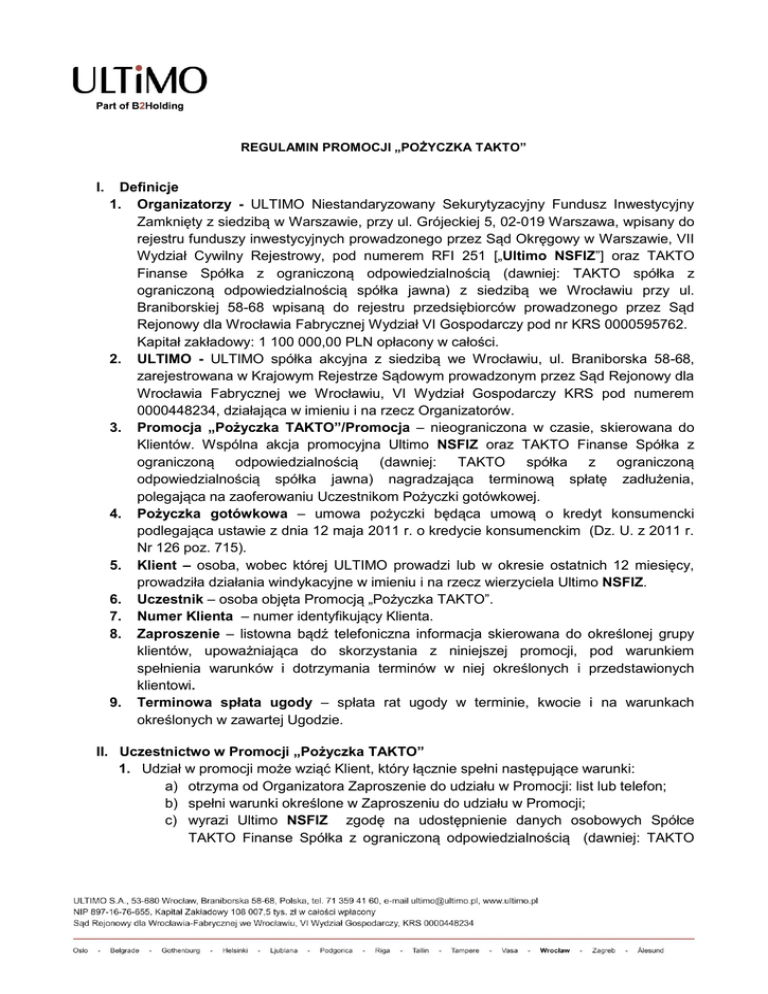 REGULAMIN PROMOCJI „POŻYCZKA TAKTO” I. Definicje 1. Organizatorzy - ULTIMO Niestandaryzowany Sekurytyzacyjny Fundusz Inwestycyjny Zamknięty z siedzibą w Warszawie, przy ul. Grójeckiej 5, 02-019 Warszawa, wpisany do rejestru funduszy inwestycyjnych prowadzonego przez Sąd Okręgowy w Warszawie, VII Wydział Cywilny Rejestrowy, pod numerem RFI 251 [„Ultimo NSFIZ”] oraz TAKTO Finanse Spółka z ograniczoną odpowiedzialnością (dawniej: TAKTO spółka z ograniczoną odpowiedzialnością spółka jawna) z siedzibą we Wrocławiu przy ul. Braniborskiej 58-68 wpisaną do rejestru przedsiębiorców prowadzonego przez Sąd Rejonowy dla Wrocławia Fabrycznej Wydział VI Gospodarczy pod nr KRS 0000595762. Kapitał zakładowy: 1 100 000,00 PLN opłacony w całości. 2. ULTIMO - ULTIMO spółka akcyjna z siedzibą we Wrocławiu, ul. Braniborska 58-68, zarejestrowana w Krajowym Rejestrze Sądowym prowadzonym przez Sąd Rejonowy dla Wrocławia Fabrycznej we Wrocławiu, VI Wydział Gospodarczy KRS pod numerem 0000448234, działająca w imieniu i na rzecz Organizatorów. 3. Promocja „Pożyczka TAKTO”/Promocja – nieograniczona w czasie, skierowana do Klientów. Wspólna akcja promocyjna Ultimo NSFIZ oraz TAKTO Finanse Spółka z ograniczoną odpowiedzialnością (dawniej: TAKTO spółka z ograniczoną odpowiedzialnością spółka jawna) nagradzająca terminową spłatę zadłużenia, polegająca na zaoferowaniu Uczestnikom Pożyczki gotówkowej. 4. Pożyczka gotówkowa – umowa pożyczki będąca umową o kredyt konsumencki podlegająca ustawie z dnia 12 maja 2011 r. o kredycie konsumenckim (Dz. U. z 2011 r. Nr 126 poz. 715). 5. Klient – osoba, wobec której ULTIMO prowadzi lub w okresie ostatnich 12 miesięcy, prowadziła działania windykacyjne w imieniu i na rzecz wierzyciela Ultimo NSFIZ. 6. Uczestnik – osoba objęta Promocją „Pożyczka TAKTO”. 7. Numer Klienta – numer identyfikujący Klienta. 8. Zaproszenie – listowna bądź telefoniczna informacja skierowana do określonej grupy klientów, upoważniająca do skorzystania z niniejszej promocji, pod warunkiem spełnienia warunków i dotrzymania terminów w niej określonych i przedstawionych klientowi. 9. Terminowa spłata ugody – spłata rat ugody w terminie, kwocie i na warunkach określonych w zawartej Ugodzie. II. Uczestnictwo w Promocji „Pożyczka TAKTO” 1. Udział w promocji może wziąć Klient, który łącznie spełni następujące warunki: a) otrzyma od Organizatora Zaproszenie do udziału w Promocji: list lub telefon; b) spełni warunki określone w Zaproszeniu do udziału w Promocji; c) wyrazi Ultimo NSFIZ zgodę na udostępnienie danych osobowych Spółce TAKTO Finanse Spółka z ograniczoną odpowiedzialnością (dawniej: TAKTO spółka z ograniczoną odpowiedzialnością spółka jawna)w celu zaoferowania Pożyczki gotówkowej; d) na dzień złożenia wniosku o Pożyczkę gotówkową wszystkie wierzytelności Ultimo NSFIZ będące w obsłudze windykacyjnej ULTIMO będą przez Klienta terminowo spłacane, spłacone, bądź gdy wskutek wypełnienia warunków ugody ULTIMO zaniechała wobec Klienta czynności windykacyjnych. 2. Organizator zastrzega sobie prawo do wyboru Uczestników objętych Promocją. III. Zasady Promocji „Pożyczka TAKTO” Każdemu Uczestnikowi, spełniającemu wymagania określone w pkt. II, zostanie zaoferowana przez TAKTO Finanse Spółka z ograniczoną odpowiedzialnością (dawniej: TAKTO spółka z ograniczoną odpowiedzialnością spółka jawna) Pożyczka gotówkowa na warunkach określonych w Zaproszeniu do udziału w Promocji. IV. Tryb Składania i Rozpatrywania Reklamacji 1. 2. 3. Każdemu Uczestnikowi Promocji przysługuje prawo wniesienia reklamacji w zakresie niezgodności przeprowadzenia Promocji z niniejszym Regulaminem w terminie do 60 dni kalendarzowych, licząc od dnia dostarczenia listu. Reklamacja powinna być złożona w jeden z następujących sposobów: 1) w formie pisemnej wysłanej listem na adres: ULTIMO z o.o. z siedzibą we Wrocławiu przy ul. Braniborskiej 58-68 z dopiskiem: >>Reklamacja Promocji: „Pożyczka TAKTO”<<. 2) faxem na numer (71) 35941170. 3) pocztą elektroniczną na adres: [email protected]. Złożona reklamacja, wraz z opisem powodu reklamacji, powinna zawierać dane umożliwiające jednoznaczną identyfikację Uczestnika, w tym wskazanie Numeru Klienta. W treści reklamacji należy podać imię i nazwisko oraz PESEL Uczestnika jak również adres do korespondencji. W przypadku pisemnych reklamacji, pismo powinno być opatrzone podpisem osoby zgłaszającej reklamację. Reklamacje będą rozpatrywane w terminie 14 dni roboczych (liczonych od daty otrzymania reklamacji) przy uwzględnieniu zasad określonych w niniejszym Regulaminie oraz obowiązujących przepisów prawa. ULTIMO udzieli odpowiedzi w formie pisemnej - listownie na wskazany w reklamacji adres korespondencyjny lub pocztą elektroniczna na wskazany adres mailowy pod warunkiem otrzymania uprzedniej zgody na prowadzenie korespondencji mailowej. V. Postanowienia końcowe 1. 2. Organizatorzy zapewniają ochronę danych osobowych Uczestników i oświadczają, że przetwarzanie danych osobowych będzie zgodne z ustawą z dnia 29 sierpnia 1997 r. o ochronie danych osobowych (Dz. U. z 2002 r. Nr 101, poz. 926 z późn. zm.). Administratorem danych osobowych Uczestników będzie Ultimo NSFIZ oraz Spółka TAKTO Finanse Spółka z ograniczoną odpowiedzialnością (dawniej: TAKTO spółka z ograniczoną odpowiedzialnością spółka jawna) po wyrażeniu przez Klienta zgody na przekazanie Spółce danych osobowych Klienta. Dane osobowe Uczestników będą przetwarzane w celu realizacji Promocji „Pożyczka TAKTO”. Uczestnikowi przysługuje 3. 4. prawo dostępu do własnych danych osobowych i ich poprawiania. Uczestnictwo w Promocji, a tym samym podanie danych osobowych w celu jej realizacji, jest dobrowolne. Udział Uczestnika w Promocji oznacza akceptację zasad Promocji zawa
