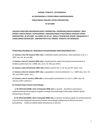 ZARZĄD POWIATU SZTUMSKIEGO W UZGODNIENIU Z DYREKTOREM SAMODZIELNEGO PUBLICZNEGO ZAKŁADU OPIEKI ZDROWOTNEJ W SZTUMIE OGŁASZA PRZETARG NIEOGRANICZONY/ PISEMNY/NA DZIERŻAWĘ NIERUCHOMOŚCI ORAZ SPRZĘTU MEDYCZNEGO I WYPOSAŻENIA SAMODZIELNEGO PUBLICZNEGO ZAKŁADU OPIEKI ZDROWOTNEJ W SZTUMIE NA OKRES DO 20 LAT WRAZ Z PRZEJĘCIEM ZADAŃ ZWIĄZANYCH Z UDZIELANIEM ŚWIADCZEŃ ZDROWOTNYCH NA TERENIE POWIATU SZTUMSKIEGO. PODSTAWĄ PRAWNĄ DO WSZCZĘCIA POSTĘPOWANIA PRZETARGOWEGO JEST : 1/ Ustawa z dnia 30 sierpnia 1991 roku o zakładach opieki zdrowotnej /tekst jednolity w Dz.U. z 2007 roku, Nr 14, poz.89/, 2/ Ustawa z dnia 27 sierpnia 2004 roku o świadczeniach opieki zdrowotnej finansowanych ze środków publicznych /tj. z 2008 roku ,Dz.U. Nr 164, poz.1027/, 3/ Ustawa z dnia 23 kwietnia 1964 roku Kodeks cywilny /Dz. U. Nr 16, poz.93 z późn. zm/, 4/ Ustawa z dnia 21 sierpnia 1997 roku o gospodarce nieruchomościami / t.j. z 2004 roku, Dz.U. Nr 261, poz.2603 z późn. zm./, 5/ Ustawa z dnia 5 czerwca 1998 roku o samorządzie powiatowym /t.j. Dz.U.z 2001 roku, Nr 142,poz.1592 z późnym./ 6/ Uchwała Rady Powiatu Sztumskiego : a/ Nr XXVI/161/2008 z dnia 4 listopada 2008 roku w sprawie określenia zasad zbycia, wydzierżawienia lub wynajęcia majątku trwałego Samodzielnego Publicznego Zakładu Opieki Zdrowotnej w Sztumie, b/ Nr XXVI/163/2008 z dnia 4 listopada 2008 roku w sprawie wyrażenia zgody na wydzierżawienie nieruchomości będących własnością Powiatu Sztumskiego użytkowanych dotychczas przez Samodzielny Publiczny Zakład Opieki Zdrowotnej w Sztumie. 1 WARUNKI PRZETARGU I. Opis przedmiotu przetargu : Wydzierżawienie na okres 15 lat, z możliwością przedłużenia dzierżawy na okres dodatkowych 5 lat, na rzecz wybranego w wyniku przetargu Oferenta, nieruchomości przewidzianego do likwidacji Samodzielnego Publicznego Zakładu Opieki Zdrowotnej w Sztumie, przeznaczonych do prowadzenia działalności związanej z udzielaniem świadczeń zdrowotnych na terenie Powiatu Sztumskiego pod warunkiem: I.1. Kontynuacji udzielania przez Oferenta świadczeń zdrowotnych w zakresie dotychczasowej działalności Samodzielnego Publicznego Zakładu Opieki Zdrowotnej w Sztumie oferowanych w sposób ciągły, nieprzerwany z zachowaniem co najmniej dotychczasowego zakresu, rozmiaru, profilu , jakości, dostępności i warunków udzielania oraz kontynuacji pełnionych i wykonywanych przez Samodzielny Publiczny Zakład Opieki Zdrowotnej w Sztumie zadań wynikających z wojewódzkich planów związanych z ratownictwem medycznym, obroną cywilną ,działań na wypadek wystąpienia epidemii, przygotowań publicznej i niepublicznej służby zdrowia Województwa Pomorskiego na potrzeby obronne państwa oraz ewentualnie innych zadań obejmujących ten przedmiot- w zakresie uzgodnionym z Powiatem Sztumskim. I.2. Prowadzenia działalności medycznej w szczególności na rzecz osób objętych ubezpieczeniem na podstawie ustawy z dnia 27 sierpnia 2004 roku o świadczeniach opieki zdrowotnej finansowanej ze środków publicznych /Dz.U. Nr 210, poz.2135 z późn. zm./ lub innych przepisów gwarantujących osobom ubezpieczonym bezpłatne udzielanie świadczeń zdrowotnych w oparciu o umowy zawierane z Narodowym Funduszem Zdrowia lub inną tego rodzaju instytucją uprawnioną zgodnie z obowiązującym prawem do zawierania umów w ramach ubezpieczenia zdrowotnego. I.3. Dostosowania budynków, budowli i pomieszczeń wchodzących w skład przedmiotu dzierżawy do wymogów zawartych w Rozporządzeniu Ministra Zdrowia z dnia 10 listopada 2006 roku w sprawie wymagań , jakim powinny odpowiadać pod względem fachowym, i sanitarnym pomieszczenia i urządzenia zakładu opieki zdrowotnej /Dz.U. Nr 213, poz. 1568/ oraz Programu Dostosowawczego Samodzielnego Publicznego Zakładu Opieki Zdrowotnej zaopiniowanego pozytywnie postanowieniem Państwowego Wojewódzkiego Inspektora Sanitarnego w Gdańsku z dnia 22 czerwca 2007 roku, znak SE.NS-20/420/50/WS/2007 oraz do przeprowadzenia działań inwestycyjno-modernizacyjnych w odniesieniu do budynków , budowli , pomieszczeń i zachowanie standardów zgodnych z obowiązującymi przepisami prawa. I.4. Przejęcia pracowników Samodzielnego Publicznego Zakładu Opieki Zdrowotnej w Sztumie w trybie art. 23 1 Kodeksu pracy według stanu na dzień tego przejęcia- w terminie do dnia poprzedzającego dzień rozpoczęcia przez wybranego w przetargu Oferenta działalności medycznej w miejsce Samodzielnego Publicznego Zakładu Opieki Zdrowotnej w Sztumie na podstawie umowy dzierżawy, której projekt stanowi załącznik Nr 1 do niniejszego ogłoszenia oraz zapewnienia im pakietu socjalnego. I.5.Nabycia sprzętu i materiałów jednorazowego użytku, leków znajdujących w aptece i komórkach organizacyjnych SP ZOZ oraz zapasów magazynowych 2 Możliwość przedłużenia umowy dzierżawy na kolejne 5 lat /po upływie 15 lat na jakie umowa zostanie zawarta/ uzależniona będzie od łącznego spełnienia niżej wymienionych warunków przez wybranego w przetargu Oferenta; 1.Należytego wykonywania świadczeń opisanych w punkcie : I.1. i I.2. , 2.Należytego i terminowego wykonania zobowiązań opisanych w punkcie I.3./ocena stanu i standardów dokonana będzie przez Powiat Sztumski na koniec roku 2012 i na 6 miesięcy przed zakończeniem 15-letniego okresu dzierżawy/, 3.Terminowego uiszczania czynszu dzierżawnego, chyba ,że strony umowy dzierżawy postanowią inaczej o płatności czynszu i wywiązywania się z pozostałych warunków określonych umową dzierżawy, II. PRZEDMIOT DZIERŻAWY II.1. Przedmiot dzierżawy składa się z : II.2. Nieruchomości zabudowanych położonych w Sztumie przy ulicy Reja 12, o powierzchni łącznej 4,2887 ha składających się z działek oznaczonych w ewidencji gruntów i budynków numerami : a/403/11 o pow. 0,0387 ha , b/403/16 o pow. 4,2500 ha położonych w obrębie II Miasta Sztum, objętych księgą wieczystą KW Nr 1449 prowadzoną przez Sąd Rejon