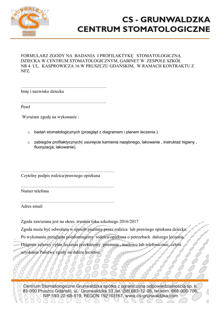 FORMULARZ ZGODY NA BADANIA I PROFILAKTYKĘ STOMATOLOGICZNĄ DZIECKA W CENTRUM STOMATOLOGICZNYM, GABINET W ZESPOLE SZKÓŁ NR 4 UL. KASPROWICZA 16 W PRUSZCZU GDAŃSKIM, W RAMACH KONTRAKTU Z NFZ. …………………………………………………. Imię i nazwisko dziecka …………………………………………………. Pesel Wyrażam zgodę na wykonanie : o badań stomatologicznych (przegląd z diagramem i planem leczenia ). o zabiegów profilaktycznych( usunięcie kamienia nazębnego, lakowanie , instruktaż higieny , fluoryzacja, lakowanie). ……………………………………………………… Czytelny podpis rodzica/prawnego opiekuna ……………………………………………………… Numer telefonu ……………………………………………………… Adres email Zgoda zawierana jest na okres trwania roku szkolnego 2016/2017 Zgoda może być odwołana w sposób pisemny przez rodzica lub prawnego opiekuna dziecka. Po wykonaniu przeglądu poinformujemy rodzica/opiekuna o potrzebach dalszego leczenia. Diagram zębowy i plan leczenia przekażemy pisemnie , mailowo lub telefonicznie, celem uzyskania Państwa zgody na dalsze leczenie.