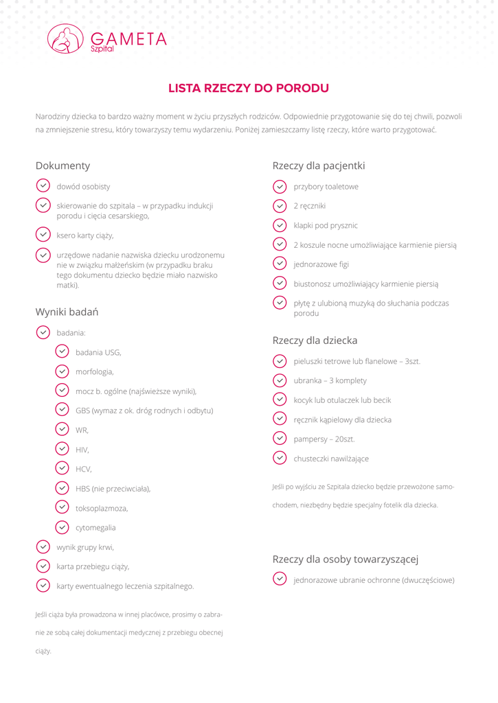 LISTA RZECZY DO PORODU Narodziny dziecka to bardzo ważny moment w życiu przyszłych rodziców. Odpowiednie przygotowanie się do tej chwili, pozwoli na zmniejszenie stresu, który towarzyszy temu wydarzeniu. Poniżej zamieszczamy listę rzeczy, które warto przygotować. Dokumenty Rzeczy dla pacjentki dowód osobisty przybory toaletowe skierowanie do szpitala – w przypadku indukcji porodu i cięcia cesarskiego, 2 ręczniki klapki pod prysznic ksero karty ciąży, 2 koszule nocne umożliwiające karmienie piersią urzędowe nadanie nazwiska dziecku urodzonemu nie w związku małżeńskim (w przypadku braku tego dokumentu dziecko będzie miało nazwisko matki). jednorazowe figi biustonosz umożliwiający karmienie piersią płytę z ulubioną muzyką do słuchania podczas porodu Wyniki badań badania: badania USG, morfologia, mocz b. ogólne (najświeższe wyniki), GBS (wymaz z ok. dróg rodnych i odbytu) WR, HIV, HCV, HBS (nie przeciwciała), Jeśli po wyjściu ze Szpitala dziecko będzie przewożone samo- toksoplazmoza, chodem, niezbędny będzie specjalny fotelik dla dziecka. cytomegalia wynik grupy krwi, karta przebiegu ciąży, karty ewentualnego leczenia szpitalnego. Jeśli ciąża była prowadzona w innej placówce, prosimy o zabranie ze sobą całej dokumentacji medycznej z przebiegu obecnej ciąży. Rzeczy dla dziecka pieluszki tetrowe lub flanelowe – 3szt. ubranka – 3 komplety kocyk lub otulaczek lub becik ręcznik kąpielowy dla dziecka pampersy – 20szt. chusteczki nawilżające Rzeczy dla osoby towarzyszącej jednorazowe ubranie ochronne (dwuczęściowe)