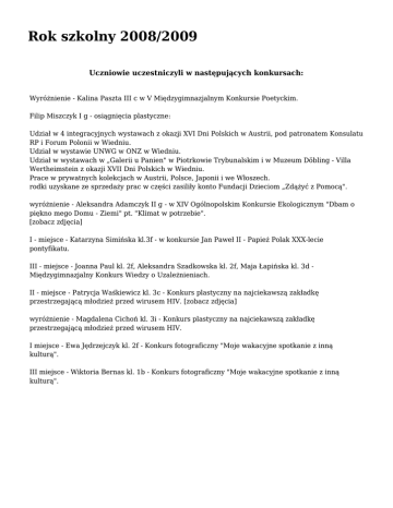 Rok szkolny 2008/2009 Uczniowie uczestniczyli w następujących konkursach: Wyróżnienie - Kalina Paszta III c w V Międzygimnazjalnym Konkursie Poetyckim. Filip Miszczyk I g - osiągnięcia plastyczne: Udział w 4 integracyjnych wystawach z okazji XVI Dni Polskich w Austrii, pod patronatem Konsulatu RP i Forum Polonii w Wiedniu. Udział w wystawie UNWG w ONZ w Wiedniu. Udział w wystawach w „Galerii u Panien" w Piotrkowie Trybunalskim i w Muzeum Döbling - Villa Wertheimstein z okazji XVII Dni Polskich w Wiedniu. Prace w prywatnych kolekcjach w Austrii, Polsce, Japonii i we Włoszech. rodki uzyskane ze sprzedaży prac w części zasiliły konto Fundacji Dzieciom „Zdążyć z Pomocą". wyróżnienie - Aleksandra Adamczyk II g - w XIV Ogólnopolskim Konkursie Ekologicznym "Dbam o piękno mego Domu - Ziemi" pt. "Klimat w potrzebie". [zobacz zdjęcia] I - miejsce - Katarzyna Simińska kl.3f - w konkursie Jan Paweł II - Papież Polak XXX-lecie pontyfikatu. III - miejsce - Joanna Paul kl. 2f, Aleksandra Szadkowska kl. 2f, Maja Łapińska kl. 3d Międzygimnazjalny Konkurs Wiedzy o Uzależnieniach. II - miejsce - Patrycja Waśkiewicz kl. 3c - Konkurs plastyczny na najciekawszą zakładkę przestrzegającą młodzież przed wirusem HIV. [zobacz zdjęcia] wyróżnienie - Magdalena Cichoń kl. 3i - Konkurs plastyczny na najciekawszą zakładkę przestrzegającą młodzież przed wirusem HIV. I miejsce - Ewa Jędrzejczyk kl. 2f - Konkurs fotograficzny "Moje wakacyjne spotkanie z inną kulturą". III miejsce - Wiktoria Bernas kl. 1b - Konkurs fotograficzny "Moje wakacyjne spotkanie z inną kulturą".