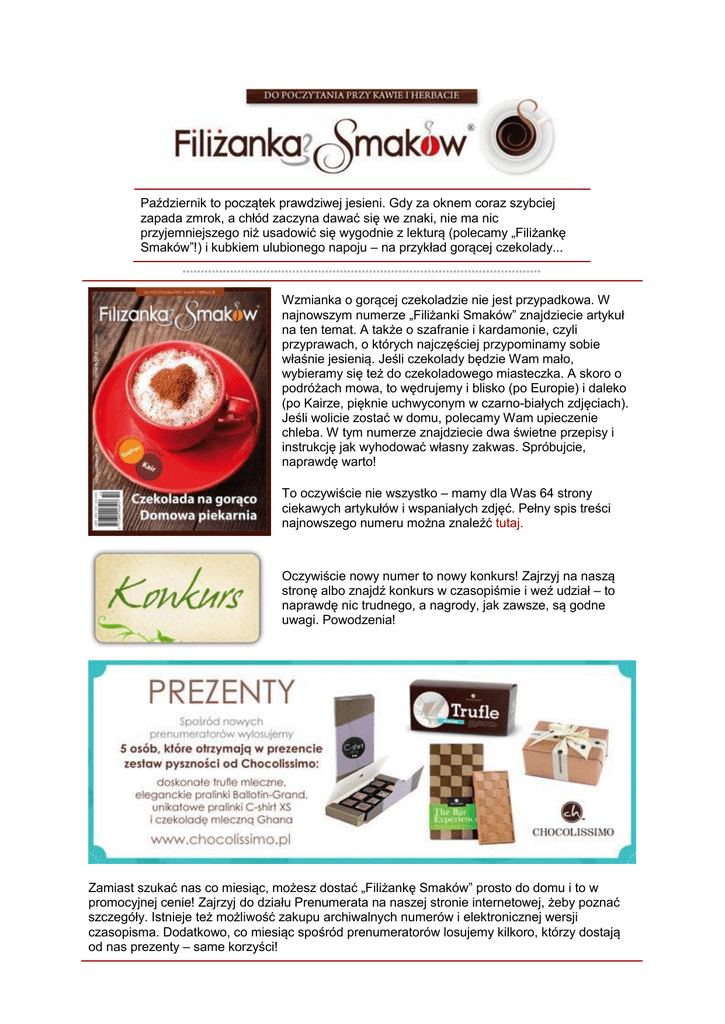 Październik to początek prawdziwej jesieni. Gdy za oknem coraz szybciej zapada zmrok, a chłód zaczyna dawać się we znaki, nie ma nic przyjemniejszego niż usadowić się wygodnie z lekturą (polecamy „Filiżankę Smaków”!) i kubkiem ulubionego napoju – na przykład gorącej czekolady... Wzmianka o gorącej czekoladzie nie jest przypadkowa. W najnowszym numerze „Filiżanki Smaków” znajdziecie artykuł na ten temat. A także o szafranie i kardamonie, czyli przyprawach, o których najczęściej przypominamy sobie właśnie jesienią. Jeśli czekolady będzie Wam mało, wybieramy się też do czekoladowego miasteczka. A skoro o podróżach mowa, to wędrujemy i blisko (po Europie) i daleko (po Kairze, pięknie uchwyconym w czarno-białych zdjęciach). Jeśli wolicie zostać w domu, polecamy Wam upieczenie chleba. W tym numerze znajdziecie dwa świetne przepisy i instrukcję jak wyhodować własny zakwas. Spróbujcie, naprawdę warto! To oczywiście nie wszystko – mamy dla Was 64 strony ciekawych artykułów i wspaniałych zdjęć. Pełny spis treści najnowszego numeru można znaleźć tutaj. Oczywiście nowy numer to nowy konkurs! Zajrzyj na naszą stronę albo znajdź konkurs w czasopiśmie i weź udział – to naprawdę nic trudnego, a nagrody, jak zawsze, są godne uwagi. Powodzenia! Zamiast szukać nas co miesiąc, możesz dostać „Filiżankę Smaków” prosto do domu i to w promocyjnej cenie! Zajrzyj do działu Prenumerata na naszej stronie internetowej, żeby poznać szczegóły. Istnieje też możliwość zakupu archiwalnych numerów i elektronicznej wersji czasopisma. Dodatkowo, co miesiąc spośród prenumeratorów losujemy kilkoro, którzy dostają od nas prezenty – same korzyści!