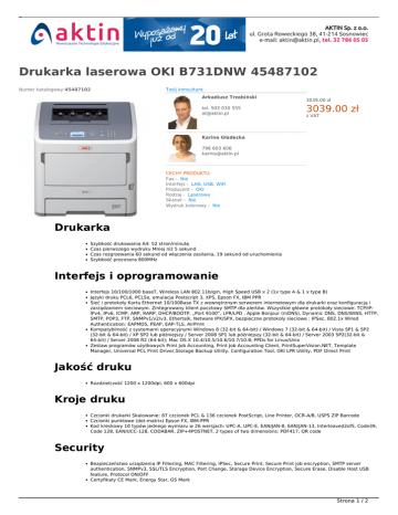 Drukarka laserowa OKI B731DNW 45487102 Numer katalogowy:45487102 Twój konsultant Arkadiusz Trzebiński tel. 503 030 555 [email protected] NOWOŚĆ W OFERCIE 3039.00 zł 3039.00 zł z VAT Karina Gładecka 796 603 606 [email protected] CECHY PRODUKTU: Fax - Nie Interfejs - LAN, USB, WiFi Producent - OKI Rodzaj - Laserowa Skaner - Nie Wydruk kolorowy - Nie Drukarka Szybkość drukowania A4: 52 stron/minutę Czas pierwszego wydruku Mniej niż 5 sekund Czas rozgrzewania 60 sekund od włączenia zasilania, 19 sekund od uruchomienia Szybkość procesora 800MHz Interfejs i oprogramowanie Interfejs 10/100/1000 baseT, Wireless LAN 802.11b/g/n, High Speed USB x 2 (1x type A & 1 x type B) Języki druku PCL6, PCL5e, emulacja Postscript 3, XPS, Epson FX, IBM PPR Sieć i protokoły Karta Ethernet 10/100Base TX z wewnętrznym serwerem internetowym dla drukarki oraz konfiguracją i zarządzaniem sieciowym. Zintegrowany klient pocztowy SMTP dla alertów. Wszystkie główne protokoły sieciowe: TCP/IP: IPv4, IPv6, ICMP, ARP, RARP, DHCP/BOOTP, „Port 9100”, LPR/LPD , Apple Bonjour (mDNS), Dynamic DNS, DNS/WINS, HTTP, SMTP, POP3, FTP, SNMPv1/v2/v3, Ethertalk, Netware IPX/SPX, bezpieczne protokoły sieciowe : IPSec, 802.1x Wired Authentication: EAPMD5, PEAP, EAP-TLS, AirPrint Kompatybilność z systemami operacyjnymi Windows 8 (32-bit & 64-bit) / Windows 7 (32-bit & 64-bit) / Vista SP1 & SP2 (32-bit & 64-bit) / XP SP2 lub późniejszy / Server 2008 SP1 lub późniejszy (32-bit & 64-bit) / Server 2003 SP2(32-bit & 64-bit) / Server 2008 R2 (64-bit); Mac OS X 10.4/10.5/10.6/10.7/10.8; PPDs for Linux/Unix Zestaw programów użytkowych Print Job Accounting, Print Job Accounting Client, PrintSuperVision.NET, Template Manager, Universal PCL Print Driver,Storage Backup Utility, Configuration Tool, OKI LPR Utility, PDF Direct Print Jakość druku Rozdzielczość 1200 x 1200dpi, 600 x 600dpi Kroje druku Czcionki drukarki Skalowanie: 87 czcionek PCL & 136 czcionek PostScript, Line Printer, OCR-A/B, USPS ZIP Barcode Czcionki punktowe (dot-matrix) Epson FX, IBM-PPR Kod kreskowy 10 typów jednego wymiaru w 26 wersjach: UPC-A, UPC-E, EAN/JAN-8, EAN/JAN-13, Interleaved2of5, Code39, Code 128, EAN/UCC-128, CODABAR, ZIP+4POSTNET, 2 types of two dimensions: PDF417, QR code Security Bezpieczeństwo urządzenia IP Filtering, MAC Filtering, IPSec, Secure Print, Secure Print job encryption, SMTP server authentication, SNMPv3, SSL/TLS Encryption, Port Change, Storage Device Encryption, Secure Erase, Disable Host USB feature, Protocol ON/OFF Certyfikaty CE Mark, Energy Star, GS Mark Strona 1 / 2 Podawanie papieru Pojemność papieru Podajnik 1: 530 arkuszy 80 g/m2; Podajnik wielofunkcyjny 100 arkuszy 80 g/m2 Pojemność opcjonalnego podajnika papieru Podajnik 2: 530 arkuszy 80 g/m2; Podajnik 3: 530 arkuszy 80 g/m2; Podajnik 4: 530 arkuszy 80 g/m2; Podajnik o dużej pojemności: 2 000 arkuszy 80 g/m2 Maksymalna pojemność papieru 3 160 arkuszy 80 g/m2 Formaty papieru Podajnik 1: A4, A5, B5; Tray 2/3/4: A4, A5, B5; Podajnik o dużej pojemności: A4; Podajnik wielofunkcyjny: A4, B5, A5, A6. Koperty (Com-9, Com10, DL, C5). Wsparcie niestandardowych rozmiarów: Szerokość 76-216mm, Długość 127-1321mm; Dupleks: A4, B5. Wsparcie niestandardowych rozmiarów: Szerokość 148-216mm Długość: 210-356mm Gramatura papieru Podajnik 1/2/3/4: 64 arkusze 220 g/m2; Podajnik o dużej pojemności: 64 arkusze o gramaturze 220 g/m2; Podajnik wielofunkcyjny: 64 arkusze o gramaturze 253g/m2; Dupleks: 64 arkusze o gramaturze 220g/m2 Zespół drukowania dwustronnego Standard Pojemność tacy odbiorczej Zadrukiem do dołu: 100 arkuszy 80 g/m2; Zadrukiem do góry: 500 arkuszy 80 g/m2 Główne cechy Pamięć Standard: 256MB; Maksymalnie: 768MB Dysk twardy Opcjonalnie: 160GB Środowisko pracy (praca) 10°C do 32°C /wilgotność względna 20% do 80% RH (bez skraplania) Środowisko pracy (przechowywanie) -10°C do 43°C / wilgotność względna 10% do 90% (bez skraplania) Zasilanie Jedna faza 220–240VAC, częstotliwość 50/60Hz +/- 2% Zużycie energii Tryb pracy: 850W; Maks.: 1400W; Tryb oszczędzania energii: 22W; Tryb głębokiego uśpienia: 3,9W lub mniej Poziom hałasu Tryb pracy: 57dB(A) lub mniej; Tryb cichy: 53dB(A); Tryb oczekiwania: 30dB(A) lub mniej; Tryb oszczędności energii: Poziom tła Wymiary (wys. x szer. x głęb.) 410 x 435 x 498mm Waga 27kg Obciążenie (maksymalne) 200 000 stron/miesiąc Obciążenie (zalecane) Do 30 000 stron/miesiąc Gwarancja Rozszerzona gwarancja 3-letnia po zarejestrowaniu przed upływem 30 dni od daty zakupu. Symbol producenta 45487102 Waga (transport) 35.00 kg Podana cena jest dla edukacji - VAT 0% Strona 2 / 2 Powered by TCPDF (www.tcpdf.org)
