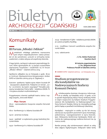 Nr 46 (53) • 14 listopada 2014 Komunikaty 20.35 - świadectwo P. Żyłki - redaktora portalu DEON. pl, autora projektu faceBóg 21.15 - modlitwa i koncert uwielbienia zespołu Kierunek Niebo III Forum „Młodzi i Miłość” M entalność młodego pokolenia naznaczona jest silnym indywidualizmem. Łatwo prowadzi on do samotności, ucieczki w wirtualny świat, uzależnień, a także odrywa od wspólnoty Kościoła. Centrum Informacyjne Archidiecezji Gdańskiej www.gdansk.gosc.pl ISSN 2083-4403 22.15 - zakończenie /-/ Ks. Stefan Pasternak Kanclerz Kurii Z tego tytułu, zachęceni sukcesem poprzedniego forum, które zgromadziło ok. 1,5 tysiąca uczestników zapraszamy licealistów i studentów na III Forum „Młodzi i Miłość” - Gdańsk Letnica 2014. W imieniu organizatorów /-/ ks. Zbigniew Drzał Proboszcz Parafii w Gdańsku Letnicy ►►AMBER EXPO Gdańsk Letnica - 20 listopada 2014 Spotkanie odbędzie się 20 listopada o godz. 18.00 w Centrum Wystawienniczo-Kongresowym Amber EXPO w Gdańsku Letnicy przy ul. Żaglowej 11. Studium przygotowawcze dla kandydatów na Nadzwyczajnych Szafarzy Komunii Świętej Gościem spotkania będzie ojciec Adam Szustak OP - duszpasterz akademicki. Podejmie on temat: „Ja i Ty – co zmienić, by razem zwyciężyć?” Ponadto usłyszymy świadectwo Piotra Żyłki - redaktora DEON. PL i inicjatora działań multimedialnych. A Plan Forum 18.00 - wprowadzenie muzyczne zespołu Kierunek Niebo 18.10 - konferencja I o. Adama Szustaka OP Kandydaci - mężczyźni w wieku 25–60 lat muszą odznaczać się wysokim poziomem życia moralnego, pobożnością i zaangażowaniem w życiu Kościoła. (por. Wskazania Konferencji Episkopatu Polski odnośnie do nadzwyczajnego szafarza Komunii św. (9 marca 2006). 19.00 - przerwa na kawę 19.30 - spektakl w wykonaniu grupy teatralnej Kierunek Niebo 19.50 - konferencja II o. Adama Szustaka OP Bardzo proszę, aby zainteresowani zabrali ze sobą dwa zdjęcia legitymacyjne. Dołączam także kartę 1 Biuletyn Archidiecezji Gdańskiej 14 listopada 2014 rchidiecezjalna Komisja Liturgiczna informuje, że w sobotę, 29 listopada 2014 r. O godz. 12.00 w parafii Najświętszej Maryi Panny Królowej Polski w Gdyni rozpocznie się kolejne Studium Przygotowawcze dla kandydatów na Nadzwyczajnych Szafarzy Komunii Świętej, którzy tę niezwykłą posługę pełnić będą w parafiach Archidiecezji Gdańskiej. Przygotowano również spektakl teatru tańca i występ zespołu „Kierunek Niebo”. Centrum Informacyjne Archidiecezji Gdańskiej www.gdansk.gosc.pl nr 46 (303) zgłoszenia, która należy oddać w dniu rozpoczęcia kursu. - szczególne zasługi uzasadniające przyznanie odznaczenia, - opinię proboszcza dotyczącą postawy moralnej kandydata. Wniosek należy złożyć w nieprzekraczalnym terminie do 8.12.2014 r. w Fundacji Klub Przyjaciół Ludzkiego Życia, ul. Jaśkowa Dolina 47/2, 80-287 Gdańsk (tel.58-3411911) /-/ Ks. Stefan Pasternak Kanclerz Kurii /-/ Ks. Edmund Skalski Przewodniczący Archidiecezjalnej Komisji Liturgicznej Antoni Szymański Przewodniczący Kapituły Pro Ecclesia et Populo Adwentowy Dzień Skupienia dla Nadzwyczajnych Szafarzy Komunii Świętej Komunikat o święcie patronalnym Archidiecezjalnego Instytutu Akcji Katolickiej w Uroczystość Jezusa Chrystusa Króla Wszechświata W sobotę, dnia 29 listopada br. O godz. 12.00, w kościele Najświętszej Maryi Panny w Gdyni, odbędzie się adwentowy dzień skupienia dla wszystkich Nadzwyczajnych Szafarzy Komunii św., którzy dotąd zostali wprowadzeni do tej posługi. /-/ Ks. Stefan Pasternak Kanclerz Kurii W Uroczystość Jezusa Chrystusa Króla Wszechświata, w święto patronalne Akcji Katolickiej, zapraszamy wszystkich członków i sympatyków Akcji Katolickiej z Archidiecezji Gdańskiej na spotkanie, które rozpocznie się Mszą św. w niedzielę 23 listopada 2014 r. o godz. 1000 w Bazylice Archikatedralnej w Gdańsku-Oliwie. /-/ Ks. Edmund Skalski Przewodniczący Archidiecezjalnej Komisji Liturgicznej Komunikat Kapituły Nagrody Pro Ecclesia et Populo Archidiecezji Gdańskiej dotyczy składania wniosków o przyznanie nagrody za 2014 r. Po uroczystej liturgii odbędzie się koncert i druga część spotkania w auli Jana Pawła II, obok katedry. /-/ Jerzy Karpiński Prezes Akcji Katolickiej AG /-/ Ks. Piotr Toczek Asystent Kościelny Biuletyn Archidiecezji Gdańskiej 14 listopada 2014 Z bliża się 17 edycja przyznania odznaczeń Pro Ecclesia et Populo (Dla Kościoła i Narodu) osobom świeckim, za szczególnie wyróżniające się, wieloletnie zaangażowanie na rzecz Kościoła i społeczeństwa w ruchach i organizacjach katolickich Archidiecezji Gdańskiej. ►►23 listopada 2014 r. Komunikat o Adwentowym Dniu Skupienia dla członków Akcji Katolickiej Archidiecezji Gdańskiej Zapraszamy do składania formalnych wniosków o odznaczenie takich osób, z których Kapituła wybierze do uhonorowania 6 osób. Wręczenie odznaczeń nastąpi podczas uroczystego spotkania w Dworze Artusa w Gdańsku w styczniu 2015 r. Z apraszamy Członków Akcji Katolickiej na Adwentowy Dzień Skupienia, który odbędzie się w sobotę, 6 grudnia 2014 r. w Centrum Ekumenicznym u Sióstr Brygidek w Gdańsku-Oliwie, ul. Polanki 124. Wniosek może zostać złożony przez stowarzyszenie, fundację lub ruch katolicki i powinien zawierać: - życiorys osoby rekomendowanej, - opis jej działań, 2 nr 46 (303) Kurs liturgiczny dla fotografów zawodowych i operatorów kamer filmowych Z Termin zgłoszeń: 30 listopada 2014 r. e względu na dalsze zainteresowanie Księży Proboszczów, jak również osób świeckich zajmujących się fotografowaniem i filmowaniem, Archidiecezjalna Komisja Liturgiczna organizuje kolejny specjalny kurs liturgiczny dla fotografów i operatorów kamer. /-/ Jerzy Karpiński Prezes Akcji Katolickiej AG /-/ Ks. Piotr Toczek Asystent Kościelny Osoby chętne do fotografowania i filmowania w kościołach na terenie Archidiecezji Gdańskiej proszone s
