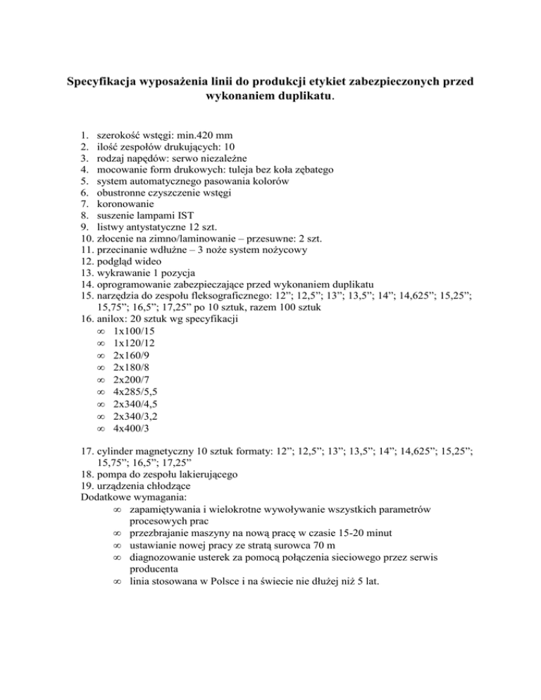 Specyfikacja wyposażenia linii do produkcji etykiet zabezpieczonych przed wykonaniem duplikatu. 1. szerokość wstęgi: min.420 mm 2. ilość zespołów drukujących: 10 3. rodzaj napędów: serwo niezależne 4. mocowanie form drukowych: tuleja bez koła zębatego 5. system automatycznego pasowania kolorów 6. obustronne czyszczenie wstęgi 7. koronowanie 8. suszenie lampami IST 9. listwy antystatyczne 12 szt. 10. złocenie na zimno/laminowanie – przesuwne: 2 szt. 11. przecinanie wdłużne – 3 noże system nożycowy 12. podgląd wideo 13. wykrawanie 1 pozycja 14. oprogramowanie zabezpieczające przed wykonaniem duplikatu 15. narzędzia do zespołu fleksograficznego: 12”; 12,5”; 13”; 13,5”; 14”; 14,625”; 15,25”; 15,75”; 16,5”; 17,25” po 10 sztuk, razem 100 sztuk 16. anilox: 20 sztuk wg specyfikacji • 1x100/15 • 1x120/12 • 2x160/9 • 2x180/8 • 2x200/7 • 4x285/5,5 • 2x340/4,5 • 2x340/3,2 • 4x400/3 17. cylinder magnetyczny 10 sztuk formaty: 12”; 12,5”; 13”; 13,5”; 14”; 14,625”; 15,25”; 15,75”; 16,5”; 17,25” 18. pompa do zespołu lakierującego 19. urządzenia chłodzące Dodatkowe wymagania: • zapamiętywania i wielokrotne wywoływanie wszystkich parametrów procesowych prac • przezbrajanie maszyny na nową pracę w czasie 15-20 minut • ustawianie nowej pracy ze stratą surowca 70 m • diagnozowanie usterek za pomocą połączenia sieciowego przez serwis producenta • linia stosowana w Polsce i na świecie nie dłużej niż 5 lat.