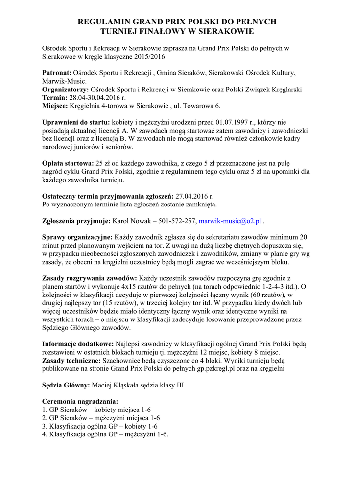 REGULAMIN GRAND PRIX POLSKI DO PEŁNYCH TURNIEJ FINAŁOWY W SIERAKOWIE Ośrodek Sportu i Rekreacji w Sierakowie zaprasza na Grand Prix Polski do pełnych w Sierakowoe w kręgle klasyczne 2015/2016 Patronat: Ośrodek Sportu i Rekreacji , Gmina Sieraków, Sierakowski Ośrodek Kultury, Marwik-Music. Organizatorzy: Ośrodek Sportu i Rekreacji w Sierakowie oraz Polski Związek Kręglarski Termin: 28.04-30.04.2016 r. Miejsce: Kręgielnia 4-torowa w Sierakowie , ul. Towarowa 6. Uprawnieni do startu: kobiety i mężczyźni urodzeni przed 01.07.1997 r., którzy nie posiadają aktualnej licencji A. W zawodach mogą startować zatem zawodnicy i zawodniczki bez licencji oraz z licencją B. W zawodach nie mogą startować również członkowie kadry narodowej juniorów i seniorów. Opłata startowa: 25 zł od każdego zawodnika, z czego 5 zł przeznaczone jest na pulę nagród cyklu Grand Prix Polski, zgodnie z regulaminem tego cyklu oraz 5 zł na upominki dla każdego zawodnika turnieju. Ostateczny termin przyjmowania zgłoszeń: 27.04.2016 r. Po wyznaczonym terminie lista zgłoszeń zostanie zamknięta. Zgłoszenia przyjmuje: Karol Nowak – 501-572-257, [email protected] . Sprawy organizacyjne: Każdy zawodnik zgłasza się do sekretariatu zawodów minimum 20 minut przed planowanym wejściem na tor. Z uwagi na dużą liczbę chętnych dopuszcza się, w przypadku nieobecności zgłoszonych zawodniczek i zawodników, zmiany w planie gry wg zasady, że obecni na kręgielni uczestnicy będą mogli zagrać we wcześniejszym bloku. Zasady rozgrywania zawodów: Każdy uczestnik zawodów rozpoczyna grę zgodnie z planem startów i wykonuje 4x15 rzutów do pełnych (na torach odpowiednio 1-2-4-3 itd.). O kolejności w klasyfikacji decyduje w pierwszej kolejności łączny wynik (60 rzutów), w drugiej najlepszy tor (15 rzutów), w trzeciej kolejny tor itd. W przypadku kiedy dwóch lub więcej uczestników będzie miało identyczny łączny wynik oraz identyczne wyniki na wszystkich torach – o miejscu w klasyfikacji zadecyduje losowanie przeprowadzone przez Sędziego Głównego zawodów. Informacje dodatkowe: Najlepsi zawodnicy w klasyfikacji ogólnej Grand Prix Polski będą rozstawieni w ostatnich blokach turnieju tj. mężczyźni 12 miejsc, kobiety 8 miejsc. Zasady techniczne: Szachownice będą czyszczone co 4 bloki. Wyniki turnieju będą publikowane na stronie Grand Prix Polski do pełnych gp.pzkregl.pl oraz na kręgielni Sędzia Główny: Maciej Kląskała sędzia klasy III Ceremonia nagradzania: 1. GP Sieraków – kobiety miejsca 1-6 2. GP Sieraków – mężczyźni miejsca 1-6 3. Klasyfikacja ogólna GP – kobiety 1-6 4. Klasyfikacja ogólna GP – mężczyźni 1-6. Po ceremonii zakończenia Grand Prix tradycyjny sierakowski turniej „ZŁOTY RZUT” – dla chętnych. Noclegi: Ośrodek Sportu i Rekreacji w Sierakowie ul. Poznańska 28 - 61 29 52 868, Ośrodek Wypoczynkowy „OKO” ul. Poznańska 28, 61 29 53 275, Energo-Tour Centrum Konferencyjno-Wypoczynkowe ul. Poznańska 30, Sieraków 61 29-53-072, TKKF Sieraków, ul. Poznańska 27, Sieraków. Integracja kręglarska – dla chętnych dnia 01.05.2016 r. organizujemy spływ kajakowy rzeką Wartą ok. 2 godziny, ognisko z dobrym jadłem, jazdę konną i bryczki w malowniczo położonej okolicy Puszczy Noteckiej. Koszt wpisowego 50 zł od osoby. Rezerwacja Karol Nowak 501-572-257.