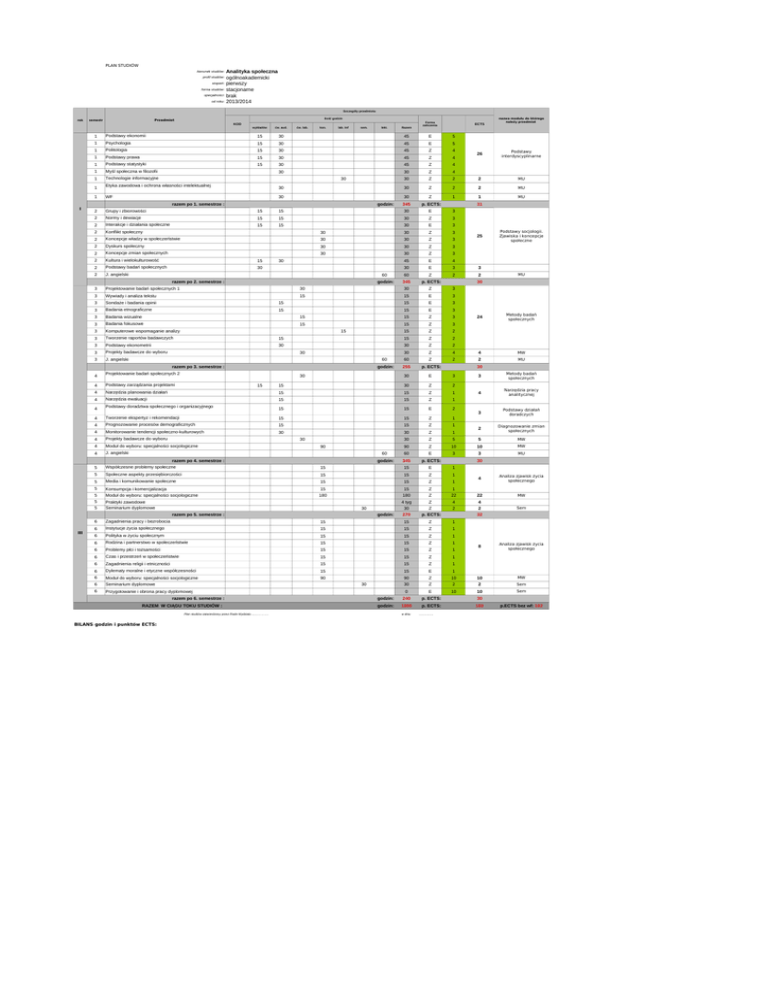 PLAN STUDIÓW Analityka społeczna ogólnoakademicki pierwszy forma studiów: stacjonarne specjalności: brak od roku: 2013/2014 kierunek studiów: profil studiów: stopień: Szczegóły przedmiotu rok ilość godzin Przedmiot semestr KOD wykładów ćw. aud. ćw. lab. kon. lab. Inf sem. Forma zaliczenia ECTS Podstawy ekonomii 15 30 45 E 5 1 Psychologia 15 30 45 E 5 1 Politologia 15 30 45 Z 4 1 Podstawy prawa 15 30 45 Z 4 1 Podstawy statystyki 15 30 45 Z 4 1 Myśl społeczna w filozofii 30 Z 4 1 Technologie informacyjne 30 Z 30 Z 1 1 30 30 Etyka zawodowa i ochrona własności intelektualnej 30 WF 30 razem po 1. semestrze : godzin: Podstawy interdyscyplinarne 2 2 MU 2 2 MU 1 MU 30 Z 345 p. ECTS: 30 E 3 30 31 Grupy i zbiorowości 15 15 2 Normy i dewiacje 15 15 Z 3 2 Interakcje i działania społeczne 15 15 30 E 3 2 Konflikt społeczny 30 30 Z 3 2 Koncepcje władzy w społeczeństwie 30 30 Z 3 2 Dyskurs społeczny 30 30 Z 3 2 Koncepcje zmian społecznych 30 30 Z 3 2 Kultura i wielokulturowość 15 45 E 4 2 Podstawy badań społecznych 30 30 E 3 2 J. angielski 60 60 Z 2 godzin: 345 p. ECTS: 30 30 Z 3 15 30 Projektowanie badań społecznych 1 3 Wywiady i analiza tekstu 15 E 3 3 Sondaże i badania opinii 15 15 E 3 3 Badania etnograficzne 15 15 E 3 3 Badania wizualne 15 15 Z 3 3 Badania fokusowe 15 15 Z 3 3 Komputerowe wspomaganie analizy 15 Z 2 3 Tworzenie raportów badawczych 15 15 Z 2 3 Podstawy ekonometrii 30 30 Z 2 3 Projekty badawcze do wyboru 30 Z 4 3 J. angielski 60 60 Z 2 godzin: 255 p. ECTS: 30 razem po 3. semestrze : Projektowanie badań społecznych 2 30 E 3 Podstawy zarządzania projektami 15 30 Z 2 4 Narzędzia planowania działań 15 15 Z 1 4 Narzędzia ewaluacji 15 15 Z 1 15 15 E 2 4 30 15 Podstawy doradztwa społecznego i organizacyjnego Podstawy socjologii. Zjawiska i koncepcje społeczne 3 2 MU 24 Metody badań społecznych 4 MW 2 MU 30 4 4 25 30 3 15 nazwa modułu do którego należy przedmiot 26 2 razem po 2. semestrze : 3 Metody badań społecznych 4 Narzędzia pracy analitycznej 3 Podstawy działań doradczych 2 Diagnozowanie zmian społecznych 5 MW 10 MW 4 Tworzenie ekspertyz i rekomendacji 15 15 Z 1 4 Prognozowanie procesów demograficznych 15 15 Z 1 4 Monitorowanie tendencji społeczno-kulturowych 30 30 Z 4 Projekty badawcze do wyboru 30 Z 5 4 Moduł do wyboru: specjalności socjologiczne 90 Z 10 4 J. angielski 60 60 E 3 3 MU godzin: 345 p. ECTS: 30 90 razem po 4. semestrze : 1 30 5 Współczesne problemy społeczne 15 15 E 1 5 Społeczne aspekty przesiębiorczości 15 15 Z 1 5 Media i komunikowanie społeczne 15 15 Z 1 5 Konsumpcja i komercjalizacja 15 15 Z 1 5 Moduł do wyboru: specjalności socjologiczne 180 5 5 Praktyki zawodowe Seminarium dyplomowe 6 Zagadnienia pracy i bezrobocia 15 6 Instytucje życia społecznego 15 6 Polityka w życiu społecznym 6 Rodzina i partnerstwo w społeczeństwie 6 Problemy płci i tożsamości 6 4 Analiza zjawisk życia społecznego 180 Z 22 22 MW 4 tyg 30 Z Z 4 2 4 2 Sem 270 p. ECTS: 15 Z 1 15 Z 1 15 15 Z 1 15 15 Z 1 15 15 Z 1 Czas i przestrzeń w społeczeństwie 15 15 Z 1 6 Zagadnienia religii i etniczności 15 15 Z 6 Dylematy moralne i etyczne współczesności 15 15 E 1 6 90 90 Z 10 10 MW 6 Moduł do wyboru: specjalności socjologiczne Seminarium dyplomowe 30 Z 2 2 Sem 6 Przygotowanie i obrona pracy dyplomowej 0 E 10 10 Sem 30 razem po 5. semestrze : III Razem 1 1 I lekt. razem po 6. semestrze : RAZEM W CIĄGU TOKU STUDIÓW : Plan studiów zatwierdzony przez Rade Wydziału ........………. BILANS godzin i punktów ECTS: godzin: 30 godzin: 240 godzin: 1800 w dniu 32 8 1 p. ECTS: 30 p. ECTS: 183 ................ Analiza zjawisk życia społecznego p.ECTS bez wf: 182 PLAN STUDIÓW Analityka społeczna ogólnoakademicki stopień: pierwszy forma studiów: stacjonarne specjalności: brak kierunek studiów: profil studiów: od roku: 2013/2014 Szczegóły przedmiotu rok ilość godzin Przedmiot semestr KOD ćw. aud. ćw. lab. kon. lab. Inf lekt. Razem Forma zaliczenia ECTS Podstawy ekonomii 15 30 45 E 5 1 Psychologia 15 30 45 E 5 1 Politologia 15 30 45 Z 4 1 Podstawy prawa 15 30 45 Z 4 1 Podstawy statystyki 15 30 45 Z 4 1 Myśl społeczna w filozofii 30 30 Z 4 1 Technologie informacyjne 30 Z 2 30 30 Z 2 30 Etyka zawodowa i ochrona własności intelektualnej 1 WF 30 30 Z 1 2 Grupy i zbiorowości 15 15 30 E 3 2 Normy i dewiacje 15 15 30 Z 3 2 Interakcje i działania społeczne 15 15 30 E 3 2 Konflikt społeczny 30 30 Z 3 2 Koncepcje władzy w społeczeństwie 30 30 Z 3 2 Dyskurs społeczny 30 30 Z 3 2 Koncepcje zmian społecznych 30 30 Z 3 2 Kultura i wielokulturowość 15 45 E 4 2 Podstawy badań społecznych 30 30 E 3 2 J. angielski 60 60 Z godzin: 690 p. ECTS: 61 30 razem po I roku : 2 3 Projektowanie badań społecznych 1 30 30 E 3 3 Wywiady i analiza tekstu 15 15 Z 3 3 Sondaże i badania opinii 15 15 E 3 3 Badania etnograficzne 15 15 E 3 3 Badania wizualne 15 15 Z 3 3 Badania fokusowe 15 15 Z 3 3 Komputerowe wspomaganie analizy 15 Z 2 3 Tworzenie raportów badawczych 15 15 Z 2 3 Podstawy ekonometrii 30 30 Z 2 4 Projektowanie badań społecznych 2 30 E 3 4 Podstawy zarządzania projektami 15 30 Z 2 4 Narzędzia planowania działań 15 15 Z 1 4 Narzędzia ewaluacji 15 15 Z 1 30 30 E 2 4 15 30 15 Podstawy doradztwa społecznego i organizacyjnego 4 Tworzenie ekspertyz i rekomendacji 15 15 Z 1 4 Prognozowanie procesów demograficznych 15 15 Z 1 4 Monitorowanie tendencji społeczno-kulturowych 15 15 Z 1 4 Moduł do wyboru: specjalności socjologiczne 90 90 Z 10 9 3/4 Projekty badawcze do wyboru 3/4 J. angielski 60 razem po II roku : III sem. 1 1 I wykładów 60 Z 120 120 E 5 godzin: 600 p. ECTS: 60 5 Współczesne problemy społeczne 15 15 E 1 5 Społeczne aspekty przesiębiorczości 15 15 Z 1 5 Media i komunikowanie społeczne 15 15 Z 1 5 Konsumpcja i komercjalizacja 15 15 Z 1 5 Praktyki zawodowe 4 tyg Z 4 6 Zagadnienia pracy i bezrobocia 15 15 Z 1 6 Instytucje życia społecznego 15 15 Z 1 6 Polityka w życiu społecznym 15 15 Z 1 6 Ro