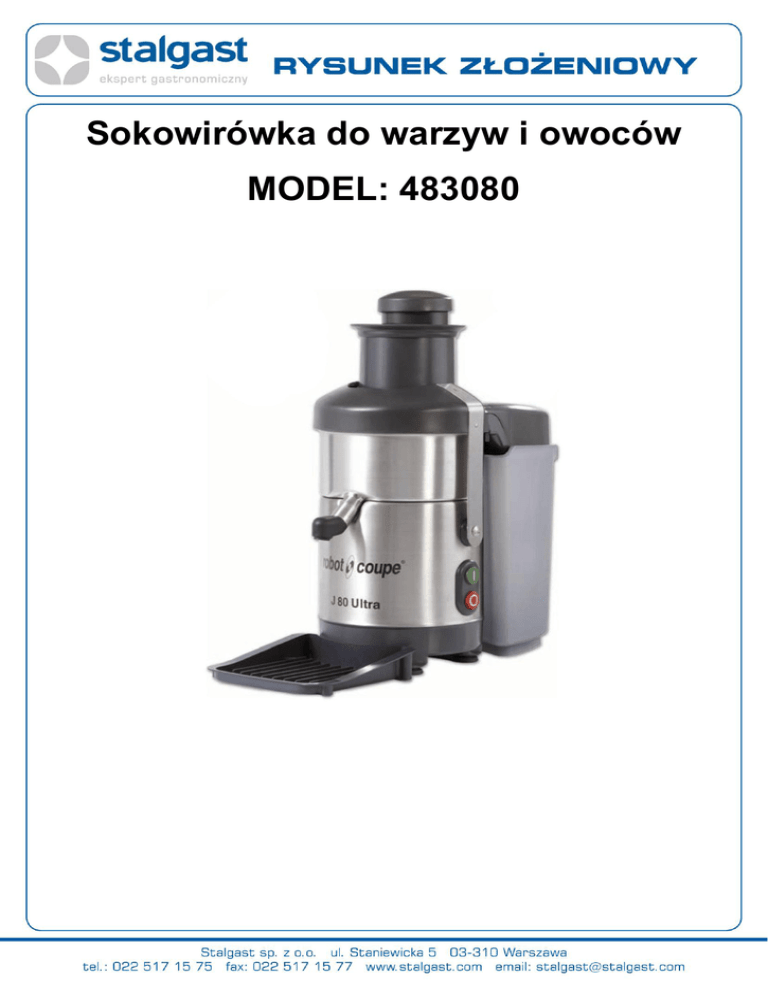 Sokowirówka do warzyw i owoców MODEL: 483080 LP. 1 2 3 4 5 6 7 8 9 10 11 12 13 14 15 16 17 18 19 20 21 22 23 24 25 26 27 28 29 30 31 32 33 34 35 36 Numer katalogowy V483080-01 V483080-02 V483080-03 V483080-04 V483080-05 V483080-06 V483080-07 V483080-08 V483080-09 V483080-10 V483080-11 V483080-12 V483080-13 V483080-14 V483080-15 V483080-16 V483080-17 V483080-18 V483080-19 V483080-20 V483080-21 V483080-22 V483080-23 V483080-24 V483080-25 V483080-26 V483080-27 V483080-28 V483080-29 V483080-30 V483080-31 V483080-32 V483080-33 V483080-34 V483080-35 V483080-36 Nazwa części Kompletna obudowa silnika Dźwignia blokady Element górny centrujący uszczelniacz Łożysko Mechanizm włącznika sokowirówki Lewy zespół łożyska Mikrowyłącznik Prawy zespół łożyska Uszczelniacz Element dolny centrujący Tuleja blokująca w silniku sokowirówki Łożysko Osłona silnika Wentylator Mocowanie włączników Osłona wentylatora Popychacz Pokrywa Filtr kompletny Tarcza Podkładka Filtr Mocowanie sitka Kołnierz misy Miska Wylewka sokowirówki Pojemnik Nóżka Zestaw śrub Obudowa dolna Przewód zasilający Silnik kompletny Moduł hamujący Kondensator 60 µF Wyłącznik rozruchowy (cewka)