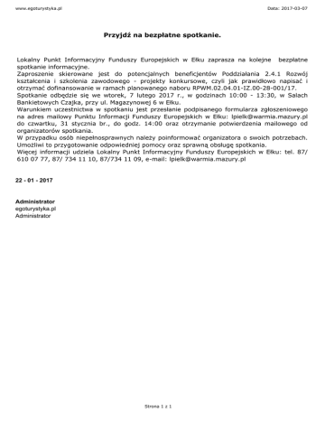 www.egoturystyka.pl Data: 2017-03-07 Przyjdź na bezpłatne spotkanie. Lokalny Punkt Informacyjny Funduszy Europejskich w Ełku zaprasza na kolejne bezpłatne spotkanie informacyjne. Zaproszenie skierowane jest do potencjalnych beneficjentów Poddziałania 2.4.1 Rozwój kształcenia i szkolenia zawodowego - projekty konkursowe, czyli jak prawidłowo napisać i otrzymać dofinansowanie w ramach planowanego naboru RPWM.02.04.01-IZ.00-28-001/17. Spotkanie odbędzie się we wtorek, 7 lutego 2017 r., w godzinach 10:00 - 13:30, w Salach Bankietowych Czajka, przy ul. Magazynowej 6 w Ełku. Warunkiem uczestnictwa w spotkaniu jest przesłanie podpisanego formularza zgłoszeniowego na adres mailowy Punktu Informacji Funduszy Europejskich w Ełku: [email protected] do czwartku, 31 stycznia br., do godz. 14:00 oraz otrzymanie potwierdzenia mailowego od organizatorów spotkania. W przypadku osób niepełnosprawnych należy poinformować organizatora o swoich potrzebach. Umożliwi to przygotowanie odpowiedniej pomocy oraz sprawną obsługę spotkania. Więcej informacji udziela Lokalny Punkt Informacyjny Funduszy Europejskich w Ełku: tel. 87/ 610 07 77, 87/ 734 11 10, 87/734 11 09, e-mail: [email protected] 22 - 01 - 2017 Administrator egoturystyka.pl Administrator Strona 1 z 1