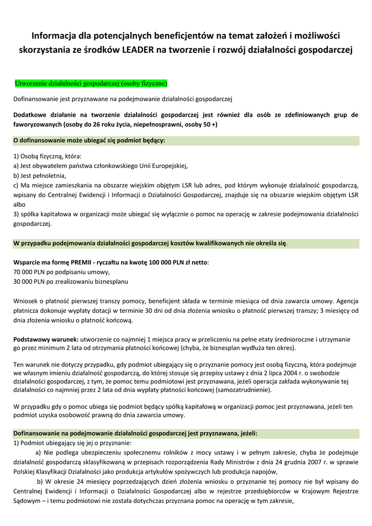 Informacja dla potencjalnych beneficjentów na temat założeń i możliwości skorzystania ze środków LEADER na tworzenie i rozwój działalności gospodarczej Utworzenie działalności gospodarczej (osoby fizyczne) Dofinansowanie jest przyznawane na podejmowanie działalności gospodarczej Dodatkowe działanie na tworzenie działalności gospodarczej jest również dla osób ze zdefiniowanych grup de faworyzowanych (osoby do 26 roku życia, niepełnosprawni, osoby 50 +) O dofinansowanie może ubiegać się podmiot będący: 1) Osobą fizyczną, która: a) Jest obywatelem państwa członkowskiego Unii Europejskiej, b) Jest pełnoletnia, c) Ma miejsce zamieszkania na obszarze wiejskim objętym LSR lub adres, pod którym wykonuje działalność gospodarczą, wpisany do Centralnej Ewidencji i Informacji o Działalności Gospodarczej, znajduje się na obszarze wiejskim objętym LSR albo 3) spółka kapitałowa w organizacji może ubiegać się wyłącznie o pomoc na operację w zakresie podejmowania działalności gospodarczej. W przypadku podejmowania działalności gospodarczej kosztów kwalifikowanych nie określa się. Wsparcie ma formę PREMII - ryczałtu na kwotę 100 000 PLN zł netto: 70 000 PLN po podpisaniu umowy, 30 000 PLN po zrealizowaniu biznesplanu Wniosek o płatność pierwszej transzy pomocy, beneficjent składa w terminie miesiąca od dnia zawarcia umowy. Agencja płatnicza dokonuje wypłaty dotacji w terminie 30 dni od dnia złożenia wniosku o płatność pierwszej transzy; 3 miesięcy od dnia złożenia wniosku o płatność końcową. Podstawowy warunek: utworzenie co najmniej 1 miejsca pracy w przeliczeniu na pełne etaty średnioroczne i utrzymanie go przez minimum 2 lata od otrzymania płatności końcowej (chyba, że biznesplan wydłuża ten okres). Ten warunek nie dotyczy przypadku, gdy podmiot ubiegający się o przyznanie pomocy jest osobą fizyczną, która podejmuje we własnym imieniu działalność gospodarczą, do której stosuje się przepisy ustawy z dnia 2 lipca 2004 r. o swobodzie działalności gospodarczej, z tym, że pomoc temu podmiotowi jest przyznawana, jeżeli operacja zakłada wykonywanie tej działalności co najmniej przez 2 lata od dnia wypłaty płatności końcowej (samozatrudnienie). W przypadku gdy o pomoc ubiega się podmiot będący spółką kapitałową w organizacji pomoc jest przyznawana, jeżeli ten podmiot uzyska osobowość prawną do dnia zawarcia umowy. Dofinansowanie na podejmowanie działalności gospodarczej jest przyznawana, jeżeli: 1) Podmiot ubiegający się jej o przyznanie: a) Nie podlega ubezpieczeniu społecznemu rolników z mocy ustawy i w pełnym zakresie, chyba że podejmuje działalność gospodarczą sklasyfikowaną w przepisach rozporządzenia Rady Ministrów z dnia 24 grudnia 2007 r. w sprawie Polskiej Klasyfikacji Działalności jako produkcja artykułów spożywczych lub produkcja napojów, b) W okresie 24 miesięcy poprzedzających dzień złożenia wniosku o przyznanie tej pomocy nie był wpisany do Centralnej Ewidencji i Informacji o Działalności Gospodarczej albo w rejestrze przedsiębiorców w Krajowym Rejestrze Sądowym – i temu podmiotowi nie została dotychczas przyznana pomoc na operację w tym zakresie, c) Ma nadany numer identyfikacyjny w trybie przepisów o krajowym systemie ewidencji producentów, ewidencji gospodarstw rolnych oraz ewidencji wniosków o przyznanie płatności (oddziały powiatowe ARiMR); w przypadku, gdy projekt będzie realizowany przez spółkę cywilną – numer identyfikacyjny został nadany jednemu ze wspólników albo spółce wniosek do pobrania http://www.arimr.gov.pl/dla-beneficjenta/wnioski/ewidencja-producentow.html lub na stronie LGD w załącznikach do pobrania. Numer identyfikacyjny jest obowiązkowy dla każdego, kto chciałby skorzystać ze środków unijnych w ramach PROW 2014-2020 jako potencjalny beneficjent. Wniosek składa się w Biurze Powiatowym Pomorskiego Oddziału ARIMR, przy ul. Sikorskiego 2A, 83-000 Pruszcz Gdański. Projekt (operacja) może być realizowana, jeżeli: a) nie będzie współfinansowana z innych środków publicznych, b) będzie realizowana w nie więcej niż 2 etapach, złożenie wniosku o płatność końcową wypłacaną po zrealizowaniu całej operacji nastąpi w terminie 24 miesięcy od dnia zawarcia umowy, lecz nie później niż do dnia 31 grudnia 2022 r., c) projekt zakładający koszty inwestycyjne, zakłada realizację inwestycji na obszarze wiejskim objętym LSR, d) inwestycje w ramach operacji będą realizowane na nieruchomości będącej własnością lub współwłasnością podmiotu ubiegającego się o przyznanie pomocy lub podmiot ten posiada udokumentowane prawo do dysponowania nieruchomością na cele określone we wniosku o przyznanie pomocy; e) wartość operacji wynosi 100 000 PLN, f) operacja jest uzasadniona ekonomicznie i będzie realizowana zgodnie z biznesplanem, Pomoc na operację w zakresie podejmowania działalności gospodarczej nie przysługuje, jeżeli działalność gospodarcza będąca przedmiotem tej operacji jest sklasyfikowana, jako: 1) Działalność usługowa wspomagająca rolnictwo i następująca po zbiorach; 2) Górnictwo i wydobywanie; 3) Działalność usługowa wspomagająca rolnictwo i wydobywanie; 4) Przetwarzanie i konserwowanie ryb, skorupiaków i mięczaków; 5) Wytwarzanie i przetwarzanie koksu i produktów rafinacji ropy naftowej; 6) Produkcja chemikaliów oraz wyrobów chemicznych; 7) Produkcja podstawowych substancji farmaceutycznych oraz leków i pozostałych 8) Produkcja metali; 9) Produkcja pojazdów samochodowych, przyczep i naczep z wyłączeniem motocykli; 10) Transport kolejowy i lotniczy i gospodarka magazynowa. Rozwój działalności gospodarczej (osoby fizyczne prowadzące działalność gospodarczą, mikroprzedsiębiorcy) O dofinansowanie może ubiegać się podmiot będący: 1) Osobą fizyczną, która: a) Jest obywatelem państwa członkowskiego Unii Europejsk