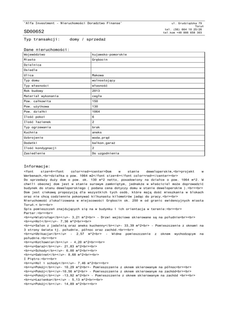 'Alfa Investment - Nieruchomości Doradztwo Finanse' SD00652 Typ transakcji: ul. Grudziądzka 79 Toruń tel. (56) 664 10 25/26 tel.kom +48 888 658 303 domy / sprzedaż Dane nieruchomości: Województwo kujawsko-pomorskie Miasto Grębocin Dzielnica Osiedle Ulica Makowa Typ domu wolnostojący Typ własności własność Rok budowy 2013 Materiał wykonania cegła Pow. całkowita 150 Pow. użytkowa 130 Pow. działki 1064 Ilość pokoi 6 Ilość łazienek 2 Typ ogrzewania brak Kuchnia aneks Uzbrojenie woda,prąd Dodatki balkon,garaż Ilość kondygnacji 2 Zasiedlenie Do uzgodnienia Informacje: <font size=4><font color=red><center>Dom w stanie deweloperskim,<br>projekt w Werbenach,<br>działka o pow. 1064 m2</font size=4></font color=red></center><br> Do sprzedaży duży dom o pow. ok. 130 m^2 netto, posadowiony na działce o pow. 1064 m^2. W chwili obecnej dom jest w stanie surowym zamkniętym, jednakże w właściciel może doprowadzić budynek do stanu deweloperskiego ( podana cena dotyczy domu w stanie deweloperskim ).<br><br> Dom jest ciekawą propozycją dla wszystkich tych osób, które mają dość mieszkania w blokach oraz nie chcą codziennie pokonywać kilkunastu kilometrów jadąc do pracy.<br><br> Nieruchomość zlokalizowana w miejscowości Grębocin ok. 250 m od granic ewidencyjnych miasta Toruń.< br><br> Spis pomieszczeń znajdujących się na w budynku i ich orientacja w terenie:<br><br> Parter:<br><br> <b><u>Wiatrołap</b></u>- 3,21 m^2<br> - Drzwi wejściowe skierowane są na południe<br><br> <b><u>Hol</b></u>- 7,36 m^2<br><br> <b><u>Salon z jadalnią oraz aneks kuchenny</b></u>- 33,39 m^2<br> - Pomieszczenie z oknami na 3 strony świata tj. południe, północ oraz zachód.<br><br> <b><u>Ubikacja</b></u> - 2,57 m^2<br> - Widne pomieszczenie z oknem wychodzącym na południe.<br><br> <b><u>Kotłownia</b></u> - 4,20 m^2<br><br> <b><u>Garaż</b></u>- 21,83 m^2<br><br> <b><u>Schody</b></u>- 6,00 m^2<br><br> <b><u>Gabinet</b></u>- 8,68 m^2<br><br> I Piętro:<br><br> <b><u>Hol i schody</b></u>- 7,46 m^2<br><br> <b><u>Pokój</b></u>- 10,29 m^2<br>- Pomieszczenie z oknem skierowanym na północ<br><br> <b><u>Pokój</b></u>-10,56 m^2<br> - Pomieszczenie z oknem skierowanym na zachód<br><br> <b><u>Pokój</b></u> -13,92 m^2<br> - Pomieszczenie z oknem skierowanym na zachód <br><br> <b><u>Łazienka</b></u> - 5,13 m^2<br><br> <b><u>Pokój</b></u>- 14,89 m^2<br><br> <font size=2><i><center><a href="http://www.youtube.com/watch?v=GADCwvvaJFY#t=87"> </font size=2></i></center>Abyś łatwiej mógł sobie wyobrazić jak wspaniały możesz mieć, KLIKNIJ TUTAJ!</a><br><br> Idealny dom dla 6 osobowej rodziny, dzięki ilości pokoi i powierzchni, każda z osób go zamieszkujących może liczyć na własne niezależne pomieszczenie.<br><br> <i> … i właśnie znalazłeś to miejsce, w którym z przyjemnością będziesz mógł usiąść cieszyć się ciepłem domowego ogniska … </i><br><br> Serdecznie zapraszam na prezentację domu, z przyjemnością odpowiem Państwu na wszelkie pytania oraz udzielę dodatkowych informacji. <br><br> <b>Paweł Dawidowicz </b><br> Tel. <b>602 214 117 </b> <br> e-mail: <b> [email protected] </b><br><br> Pośrednik odpowiedzialny zawodowo: <br> Paweł Dawidowicz licencja pośrednika w obrocie nieruchomościami 7432 <br> Andrzej Pamin licencja pośrednika w obrocie nieruchomościami 1145 <br><br> <b>UWAGA!!! BEZPŁATNIE POMAGAMY W UZYSKANIU KREDYTU NA ZAKUP NIERUCHOMOŚCI. WSPÓŁPRACUJEMY Z WIELOMA BANKAMI. </b><br><br> Treść niniejszego ogłoszenia nie stanowi oferty handlowej w rozumieniu przepisów Kodeksu Cywilnego. <br><br> Więcej ofert na www.alfa-investment.pl <br><br> <b>ZAPRASZAMY</b> </font><br><a href="http://www.qr-online.pl/" title="Kody QR"><img src="http://qr-online.pl/bin/codes/5346d3feb276f516217a8f7c2bc35f53.png" alt="" /></a></center> <br>* Rzeczywiste powierzchnie pokoi mogą nieznacznie różnić się od podanych na projekcie. Cena: 590 000 PLN Dokument wygenerowany ze strony www.alfa-investment.pl Strona 2