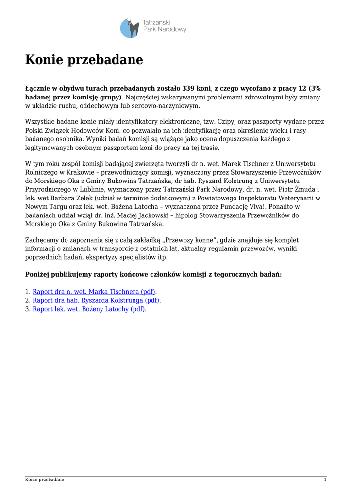 Konie przebadane Łącznie w obydwu turach przebadanych zostało 339 koni, z czego wycofano z pracy 12 (3% badanej przez komisję grupy). Najczęściej wskazywanymi problemami zdrowotnymi były zmiany w układzie ruchu, oddechowym lub sercowo-naczyniowym. Wszystkie badane konie miały identyfikatory elektroniczne, tzw. Czipy, oraz paszporty wydane przez Polski Związek Hodowców Koni, co pozwalało na ich identyfikację oraz określenie wieku i rasy badanego osobnika. Wyniki badań komisji są wiążące jako ocena dopuszczenia każdego z legitymowanych osobnym paszportem koni do pracy na tej trasie. W tym roku zespół komisji badającej zwierzęta tworzyli dr n. wet. Marek Tischner z Uniwersytetu Rolniczego w Krakowie – przewodniczący komisji, wyznaczony przez Stowarzyszenie Przewoźników do Morskiego Oka z Gminy Bukowina Tatrzańska, dr hab. Ryszard Kolstrung z Uniwersytetu Przyrodniczego w Lublinie, wyznaczony przez Tatrzański Park Narodowy, dr. n. wet. Piotr Żmuda i lek. wet Barbara Zelek (udział w terminie dodatkowym) z Powiatowego Inspektoratu Weterynarii w Nowym Targu oraz lek. wet. Bożena Latocha – wyznaczona przez Fundację Viva!. Ponadto w badaniach udział wziął dr. inż. Maciej Jackowski – hipolog Stowarzyszenia Przewoźników do Morskiego Oka z Gminy Bukowina Tatrzańska. Zachęcamy do zapoznania się z całą zakładką „Przewozy konne”, gdzie znajduje się komplet informacji o zmianach w transporcie z ostatnich lat, aktualny regulamin przewozów, wyniki poprzednich badań, ekspertyzy specjalistów itp. Poniżej publikujemy raporty końcowe członków komisji z tegorocznych badań: 1. Raport dra n. wet. Marka Tischnera (pdf). 2. Raport dra hab. Ryszarda Kolstrunga (pdf). 3. Raport lek. wet. Bożeny Latochy (pdf). Konie przebadane 1