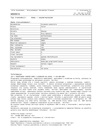 'Alfa Investment - Nieruchomości Doradztwo Finanse' WD00616 Typ transakcji: ul. Grudziądzka 79 Toruń tel. (56) 664 10 25/26 tel.kom +48 888 658 303 domy / najem/wynajem Dane nieruchomości: Województwo kujawsko-pomorskie Miasto Toruń Dzielnica Osiedle Skarpa Ulica Przy Skarpie Typ domu wolnostojący Typ własności własność Rok budowy 2003 Materiał wykonania cegła Pow. całkowita 300 Pow. użytkowa 151 Pow. działki 2000 Ilość pokoi 4 Ilość łazienek 1 Typ ogrzewania gazowe dwufunkcyjne Kuchnia aneks Uzbrojenie woda,gaz,prąd,kanalizacja Dodatki balkon,loggia Ilość kondygnacji 2 Zasiedlenie od zaraz Informacje: <B>!! PRZEPIĘKNY PARTER DOMU Z WIDOKIEM NA WISŁĘ !!</B><BR><BR> Przepiękny czteropokojowy, kompletnie umeblowany, apartament z widokiem na Wisłę, położony na parterze domu położonego na obrzeżach osiedla. <br><br> Parter domu składa się z trzech sypialni, pokoju dziennego z aneksem kuchennym, jadalni, dużego 22metrowego tarasu oraz łazienki. W pokoju dziennym połączonym z wyposażonym aneksem kuchennym (zmywarka, lodówka, płyta indukcyjna, kuchenka mikrofalowa, piekarnik oraz pralka) znajduje się czynny kominek, który dodatkowo może ogrzać pomieszczenie. W sypialniach znajdują się duże łóżka oraz pojemne szafy. <br><br> Apartament był remontowany, zostały odmalowane ściany, odświeżona została łazienka oraz kuchnia aby nowy najemca mógł cieszyć się nowym wyposażeniem. W przestronnej łazience znajduje się wanna jak i prysznic.<br><br> Dom ocieplony 12 cm styropianem, ciepła woda uzyskiwana w ekonomiczny sposób przez pompę ciepła, ogrzewanie gazowe, alarm z monitoringiem. Działka o powierzchni 2000 m2 gdzie ponad połowę tego terenu zajmuje duży zadbany trawnik z wieloma nasadzeniami. W odległości ok. 100 metrów znajdują się nowe korty tenisowe, ok. 500 metrów kryty basen oraz ok. 800 metrów stadnina koni. Wjazd i podwórze utwardzone są pol-brukiem. <br><br> Do czynszu najmu należy doliczyć opłaty w wysokości 600 zł wraz z Internetem i monitoringiem. <br><br> Serdecznie zapraszam na prezentację mieszkania, z przyjemnością odpowiem Państwu na wszelkie pytania oraz udzielę dodatkowych informacji. <br><br> <b>Martika Szewa </b><br> Tel. <b>888 658 304</b> <br> e-mail: <b> [email protected] </b><br><br> Pośrednik odpowiedzialny zawodowo: <br> Paweł Dawidowicz licencja pośrednika w obrocie nieruchomościami 7432 <br> Andrzej Pamin licencja pośrednika w obrocie nieruchomościami 1145 <br> Treść niniejszego ogłoszenia nie stanowi oferty handlowej w rozumieniu przepisów Kodeksu Cywilnego. <br><br> Więcej ofert na www.alfa-investment.pl <br><br> <b>ZAPRASZAMY</b> Cena: 3 000 PLN Dokument wygenerowany ze strony www.alfa-investment.pl Strona 2