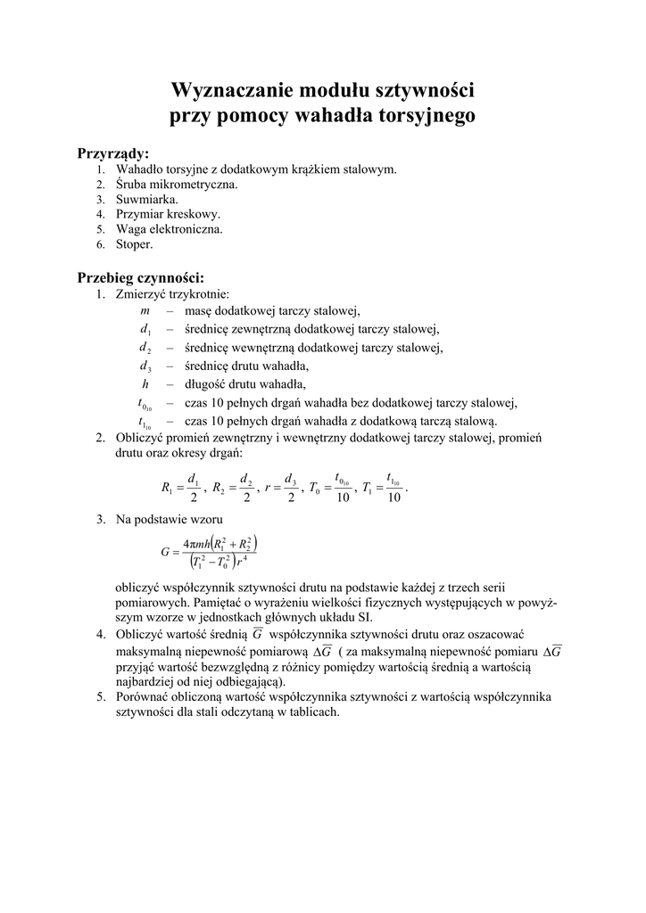 Wyznaczanie modułu sztywności przy pomocy wahadła torsyjnego Przyrządy: 1. 2. 3. 4. 5. 6. Wahadło torsyjne z dodatkowym krążkiem stalowym. Śruba mikrometryczna. Suwmiarka. Przymiar kreskowy. Waga elektroniczna. Stoper. Przebieg czynności: 1. Zmierzyć trzykrotnie: m – masę dodatkowej tarczy stalowej, d 1 – średnicę zewnętrzną dodatkowej tarczy stalowej, d 2 – średnicę wewnętrzną dodatkowej tarczy stalowej, d 3 – średnicę drutu wahadła, h – długość drutu wahadła, t 010 – czas 10 pełnych drgań wahadła bez dodatkowej tarczy stalowej, t110 – czas 10 pełnych drgań wahadła z dodatkową tarczą stalową. 2. Obliczyć promień zewnętrzny i wewnętrzny dodatkowej tarczy stalowej, promień drutu oraz okresy drgań: R1 = t0 t1 d d1 d , R2 = 2 , r = 3 , T0 = 10 , T1 = 10 . 2 2 2 10 10 3. Na podstawie wzoru G= ( 4πmh R12 + R22 T12 − T02 r 4 ( ) ) obliczyć współczynnik sztywności drutu na podstawie każdej z trzech serii pomiarowych. Pamiętać o wyrażeniu wielkości fizycznych występujących w powyższym wzorze w jednostkach głównych układu SI. 4. Obliczyć wartość średnią G współczynnika sztywności drutu oraz oszacować maksymalną niepewność pomiarową ΔG ( za maksymalną niepewność pomiaru ΔG przyjąć wartość bezwzględną z różnicy pomiędzy wartością średnią a wartością najbardziej od niej odbiegającą). 5. Porównać obliczoną wartość współczynnika sztywności z wartością współczynnika sztywności dla stali odczytaną w tablicach. Tabela pomiarowa: m d1 d2 d3 h t 010 t110 R1 R2 r T0 T1 G [g] [mm] [mm] [mm] [cm] [s] [s] [mm] [mm] [mm] [s] [s] [Pa]