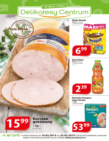 Płatki Nestlé 500 g | 13,98 zł/kg • wybrane rodzaje Toruń Pacific 6 99 Sok Kubuś 900 ml | 2,66 zł/l • wybrane rodzaje Maspex 2 39 Pieluchy Pampers Giga Paczka 1 opak. • wybrane rodzaje Procter & Gamble 15 99 NR 08/2015 • Kurczak gotowany 1 kg Morliny 53 99 OFERTA WAŻNA OD 19.02.2015 DO 25.02.2015 LUB DO WYCZERPANIA ZAPASÓW ADRESY SKLEPÓW DOSTĘPNE SĄ NA STRONIE WWW.DELIKATESY.PL Jarmark świeżości 100 g produktu powstaje ze 122 g mięsa wieprzowego najwyższej jakości. Bez glutaminianu sodu i sztucznych barwników. Dzięki unikalnej mieszance przypraw i tradycyjnym sposobom produkcji doskonale smakuje i prezentuje się zarówno na wystawnym półmisku wędlin, jak i na pysznej kanapce na drugie śniadanie. mazur Doskonała w wielu wariantach kulinarnych. Marynowana i pieczona na grillu świetnie nadaje się zarówno na rodzinny obiad, jak i niezobowiązujące przyjęcie, a przyrządzona jak w przepisie na stronie 3 zachwyci domowników kruchością i wyjątkową harmonią smaków. Produkty wytwarzane według najlepszych receptur z zachowaniem ducha tradycji. Szynka Magnacka 1 kg Krakus 26 99 Ćwiartka z kurczaka 1 kg TĘP KT DOS PRODU CENIE W 3 NY 79 ZŁ 02 19. ARTKU 0 2 W Z C D . O OT Y 2 1 DO SOB Delikatna i krucha. Pokrojona w kosteczkę i zapiekana w rożkach z ciasta francuskiego z serem pleśniowym i ziołami oraz sosem pomidorowym i tymiankiem to doskonała przekąska, którą uwielbia cała moja rodzina. SZAMY Z A P R A S TA C J Ę GU N A D E OTĘ 21.02 W SOB 11 Kiełbasa Słowiańska Pieczona 1 kg Duda 49 ZŁ Produkt z degustacji dostępny jest w cenie 11,49 zł przez cały okres obowiązywania gazetki. Ser dojrzewający o łagodnym, aromatycznym i subtelnym smaku. Jego miąższ jest delikatny i miękki. Polecany na kanapki dla całej rodziny. Szczególnie lubiany przez dzieci. Ser Serenada Salami 1 kg ĘPNY T DOST K U D O PR IE W CEN Spomlek 99 16 ZŁ Produkt dostępny jest w cenie 16,99 zł przez cały okres obowiązywania gazetki. Doskonale hamuje apetyt, przyśpiesza spalanie tłuszczu i poprawia nastrój. Sprawdza się zarówno na surowo, jak i gotowana czy pieczona. Dodatkowo dzięki dużej zawartości witaminy C korzystnie wpływa na odporność naszego organizmu. Papryka czerwona 1 kg TĘ KT DOS PRODU CENIE W 7 PNY 99 ZŁ .02 19 ARTKU OD CZW T Y 21.02 O DO SOB 2 Jarmark świeżości Karkówka wieprzowa bez kości 1 kg Schab Wójta 1 kg Regieocnjaałlne y sp Unimięs PODLASIE 10 99 20 99 Szynka Konserwowa Polędwica z warzywami Duda Indykpol 1 kg 1249 1 kg 1049 Mielonka Tyrolska Pasztet Ciechanowski Sokołów Cedrob 1 kg 1 kg Przysmaki tego regionu to potrawy charakterystyczne dla państw ościennych. Do najbardziej znanych należą ziemniaki, a wraz z nimi babka ziemniaczana, przygotowywana z tartych ziemniaków, słoniny i boczku oraz kiszka ziemniaczana, która jest chlubą regionu. Nie można pominąć kartaczy robionych z surowych ziemniaków ani rejbaka, czyli ciasta z tartych kartofli, kaszy, cebuli i słoniny. Podlasie to również wędliny: kindziuk litewski czy godna polecenia palcówka. Mówiąc o Podlasiu, nie można zapomnieć o słodkim przysmaku tego regionu, czyli sękaczu, do produkcji którego wykorzystuje się nawet 60 jaj. Kurczak w pietruszce 9 99 10 49 Kiełbasa Głogowska z Szynki Sałatka brokułowa z szynką Madej Wróbel Dega 1 kg 1 kg 17 9 99 Cebula 1 kg 085 99 Grejpfrut czerwony 1 kg 349 Składniki: • 4 ćwiartki z kurczaka • pęczek posiekanej natki pietruszki • 2 łyżeczki ziół prowansalskich • 3 łyżeczki przyprawy do kurczaka • łyżeczka słodkiej papryki • 4 posiekane ząbki czosnku • ¼ szklanki oliwy • sól, pieprz Przepis: Natkę mieszamy z oliwą, przyprawą do kurczaka, papryką, ziołami, czosnkiem, solą i pieprzem. Mięso płuczemy, osuszamy i wkładamy do marynaty. Przykrywamy i odstawiamy na 2 godziny do lodówki. Po tym czasie układamy mięso na blasze i pieczemy 40 minut w temperaturze 200 oC. Często polewamy tworzącym się sosem. B ŁO N I E · LU B L I N 3 Ewa poleca! W Y TNIJ I ZACHOWA J PRZEPIS 1 brokuł 1 kalafior 1 por 300 g wędliny 3 kulki mozzarelli sól, pieprz Czekolada Wedel Ferrero • wybrane rodzaje Lotte Wedel 150 g | 69,93 zł/kg 2 Pierniki Tradycyjne • Paluszki Lajkonik Junior • Paluszki Salzletten • Precelki Lajkonik Lorenz Bahlsen Dudek 130-250 g | 11,96-23,00 zł/kg 299 30 g | 29,67 zł/kg • wybrane rodzaje Delecta 0 89 Przepis: 1. Brokuł i kalafior dzielimy na cząstki, pora kroimy na 3-centymetrowe paski. Wszystko blanszujemy w posolonym i posłodzonym wrzątku (brokuły nie stracą koloru). Rozkładamy na przemian na blasze, układamy wędlinę, a na wierzch kładziemy mozzarellę pokrojoną w plastry. 2. Masło roztapiamy w niewielkim rondelku, dodajemy mąkę, mieszamy i gdy tylko połączy się z tłuszczem, wlewamy mleko. Całość energicznie mieszamy, aby nie zrobiły się grudki i gotujemy do momentu, aż sos zgęstnieje. Doprawiamy solą, pieprzem, kurkumą i gałką muszkatołową, uważając, aby nie dodać jej zbyt dużo. 3. Zapiekankę zalewamy sosem, posypujemy żółtym serem i pieczemy w temperaturze 180 oC przez około 25-30 minut. Smacznego! 59 Przekąska Kisiel Owocowy Kubek 140 g | 12,79 zł/kg 179 Herbata Saga 200 torebek • ekspresowa Unilever 8 99 Na śniadanie Szynka Serrano 80 g | 99,88 zł/kg Eurexia szynki przy zakupie 82% 200 g masło ekstra ATIS! otrzymasz GR 7 99 Margaryna Pyszny Duet Deser Monte ZT Kruszwica • wybrane rodzaje Zott 600 g | 3,98 zł/kg Kiełbasa Podwawelska 100 g | 25,90 zł/kg 10 pod beszamelem Beszamel: 1 łyżka masła 2 łyżki mąki 2 szklanki mleka szczypta gałki muszkatołowej szczypta kurkumy 150 g sera żółtego sól, pieprz Bombonierka Raffaello 49 Zapiekanka Składniki: Każdemu w smak Mięsne Specjały 4 x 100 g | 13,73 zł/kg 1 kg 15 99 4 2 39 5 49 kuchenne Domowa spiżarnia Pizza Guseppe Pasztet • wybrane rodzaje Dr.Oetker • wybrane rodzaje Profi 5 1 335-410 g | 14,61-17,88 zł/kg 99 