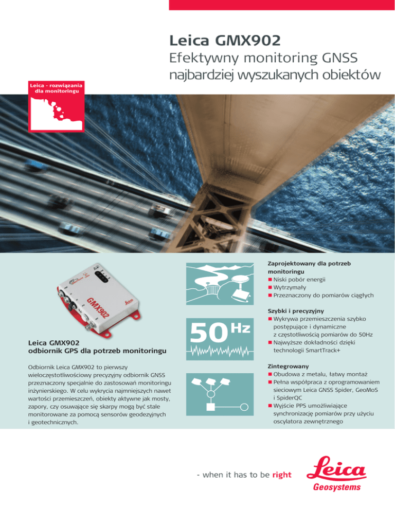 Leica GMX902 Efektywny monitoring GNSS najbardziej wyszukanych obiektów Leica - rozwi¹zania dla monitoringu Zaprojektowany dla potrzeb monitoringu nnNiski pobór energii nnWytrzymały nnPrzeznaczony do pomiarów ciągłych Leica GMX902 odbiornik GPS dla potrzeb monitoringu Szybki i precyzyjny nnWykrywa przemieszczenia szybko postępujące i dynamiczne z częstotliwością pomiarów do 50Hz nnNajwyższe dokładności dzięki technologii SmartTrack+ Odbiornik Leica GMX902 to pierwszy wieloczęstotliwościowy precyzyjny odbiornik GNSS przeznaczony specjalnie do zastosowań monitoringu inżynierskiego. W celu wykrycia najmniejszych nawet wartości przemieszczeń, obiekty aktywne jak mosty, zapory, czy osuwające się skarpy mogą być stale monitorowane za pomocą sensorów geodezyjnych i geotechnicznych. Zintegrowany nnObudowa z metalu, łatwy montaż nnPełna współpraca z oprogramowaniem sieciowym Leica GNSS Spider, GeoMoS i SpiderQC nnWyjście PPS umożliwiające synchronizację pomiarów przy użyciu oscylatora zewnętrznego Precyzyjne pozyskiwanie danych o szybko przemieszczających się obiektach Urządzenie Leica GMX902 jest wysokiej klasy odbiornikiem GNSS, zaprojektowanym i przeznaczonym specjalnie dla celów monitorowania aktywnych obiektów inżynierskich takich jak mosty, zapory oraz topograficznych jak osuwiska, skarpy czy wulkany. Odbiornik GMX902 GG dostarcza precyzyjne dane surowe GPS/GLONASS L1/L2 z częstotliwością pomiaru do 20 Hz, natomiast GMX902 GNSS dodatkowo odbiera sygnały GPS L5 i Galileo L1/E5a/E5b/E5a+b (AltBOC) z częstotliwością do 50 Hz. To co najważniejsze Odbiornik został zaprojektowany tak by wykonywał to, co najważniejsze w monitoringu – pozyskiwanie i dostarczanie wysokiej jakości danych. GMX902 nie zawiera zatem innych kosztownych opcji niewykorzystywanych w tego typu pracach, dzięki czemu jest urządzeniem uniwersalnym do zastosowań związanych z monitoringiem strukturalnym. Posiada metalową obudowę odporną na działanie wody, gorąca, zimna oraz wibracji, którą można łatwo zamontować na różnych obiektach. Zintegrowane rozwiązania Odbiornik GMX902 ukazuje swoje wszystkie możliwości dopiero podczas współpracy z zaawansowanym oprogramowaniem GNSS Spider – rejestrującym surowe dane i prowadzącym zaawansowane obliczenia współrzędnych oraz oprogramowaniem GeoMoS lub Leica SpiderQC zarządzającym procesem monitoringu strukturalnego i analizującym wartości uzyskanych przemieszczeń. Leica GMX902 odsłania cały swój potencjał: precyzyjne pomiary, prowadzenie zaawansowanej i wiarygodnej analizy danych oraz ich przetwarzanie. Korzystając ze standardu NMEA odbiornik może z łatwością zasilać danymi oprogramowanie zewnętrzne oraz współpracować aktywnie z programem Leica GNSS Spider. Dane techniczne Leica GMX902 Technologia GNSS SmartTrack+, pełna długość fali Rodzaj, liczba kanałów GMX902 GG 72 kanały, GPS L1/L2, GLONASS L1/L2, 20Hz GMX902 GNSS 120 kanałów, GPS L1/L2/L5, GLONASS L1/L2, Galileo L1/E5a/E5b/E5a+b (AltBOC), 50 Hz1 SmartTrack+ Zaawansowana technologia pomiaru GNSS Czas rozpoznania wszystkich satelitów po uruchomieniu odbiornika: ok. 30 s. Ponowna inicjalizacja po utracie sygnału: ok. 1 s. Wysoka sprawność: urządzenie pozyskuje powyżej 99% sygnałów możliwych do odbioru przy masce horyzontu ponad 10°. Niski poziom szumów. Sprawne śledzenie, również słabych sygnałów przy niskim horyzoncie. Odporność na zjawisko wielotorowości sygnału i zagłuszanie. Dokładność pomiaru Pomiary fazowe 0.2 mm rms Pomiary kodowe (pseudodługość) 20 mm rms Diody statusu Zasilanie, śledzenie, przeładowanie portów szeregowych Oprogramowanie sterujące (wymagane) Leica GNSS Spider. Umożliwia zarządzanie pracą jednego lub wielu odbiorników, pozwala wyznaczać pozycje oraz tworzyć pliki RINEX dla celów post processingu. Wyjście danych Format binarny Leica (LB2), niezależny dla każdego z portów szeregowych Waga 0.8 kg Wymiary (dł. x sz. x wys.) 16.7 cm x 12.3 cm x 4.0 cm Zakres temperatur ISO9022, MIL-STD-810F Praca od -40° C do +65° C Przechowywanie od -40° C do +80° C Wilgotność Do 95 % Deszcz, pył, piach, wiatr IP67 – odporność na padający deszcz oraz pył. Odporny na chwilowe zanurzenie w wodzie do głębokości 1m Wibracje 10 Hz – 500 Hz, 0.7 mm, 5 g Odporność na upadki 25 g, 6 ms Źródło zasilania Nominalnie 12V, prąd stały Zewnętrzne Od 10.5 V do 28 V, prąd stały Liczba portów zasilania 2 Zużycie energii 1,7 W; funkcja czuwania: 0,007 W Porty I S O 9 001 / I S O 1 4 0 0 1 Total Quality Management - nasze zobowiązanie zapewnienia pełnej satysfakcji Klienta. Więcej informacji uzyskają Państwo u lokalnego przedstawiciela Leica Geosystems. Ilustracje, opisy i dane techniczne nie są wiążące. Wszystkie prawa zastrzeżone. Drukowano w Polsce - Copyright Leica Geosystems AG, Heerbrugg, Szwajcaria, 2010. zewnętrznego źródła zasilania 1 złącze LEMO z dwoma wejściami zasilania (kabel Y) szeregowe 2 złącza LEMO 8-pinowe liczba bodów od 4800 do 230400 Podłączenia anteny 1 TNC Wyjście PPS 1 złącze LEMO HGP.05.250.CTL Zalecana antena Leica AR10, Leica AR25 1 Leica Geosystems Sp. z o.o. ul. Jutrzenki 118, 02-230 Warszawa Tel.: +48 22 260 50 00 Fax: +48 22 260 50 10 www.leica-geosystems.pl ogą pojawić się ograniczenia w ilości śledzonych satelitów podczas M rejestracji danych z częstotliwością 50 Hz.