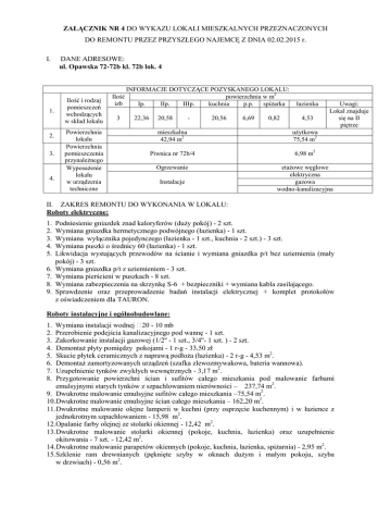 ZAŁĄCZNIK NR 4 DO WYKAZU LOKALI MIESZKALNYCH PRZEZNACZONYCH DO REMONTU PRZEZ PRZYSZŁEGO NAJEMCĘ Z DNIA 02.02.2015 r. I. 1. 2. 3. 4. DANE ADRESOWE: ul. Opawska 72-72b kl. 72b lok. 4 Ilość i rodzaj pomieszczeń wchodzących w skład lokalu Powierzchnia lokalu Powierzchnia pomieszczenia przynależnego Wyposażenie lokalu w urządzenia techniczne Ilość izb 3 INFORMACJE DOTYCZĄCE POZYSKANEGO LOKALU: powierzchnia w m2 Ip. IIp. IIIp. kuchnia p.p. spiżarka 22,36 20,58 - 20,56 6,69 0,82 łazienka 4,53 Uwagi: Lokal znajduje się na II piętrze mieszkalna 42,94 m2 użytkowa 75,54 m2 Piwnica nr 72b/4 6,98 m2 Ogrzewanie etażowe węglowe elektryczna gazowa wodno-kanalizacyjna Instalacje II. ZAKRES REMONTU DO WYKONANIA W LOKALU: Roboty elektryczne: 1. 2. 3. 4. 5. 6. 7. 8. 9. Podniesienie gniazdek znad kaloryferów (duży pokój) - 2 szt. Wymiana gniazdka hermetycznego podwójnego (łazienka) - 1 szt. Wymiana wyłącznika pojedynczego (łazienka - 1 szt., kuchnia - 2 szt.) - 3 szt. Wymiana puszki o średnicy 60 (łazienka) - 1 szt. Likwidacja wystających przewodów na ścianie i wymiana gniazdka p/t bez uziemienia (mały pokój) - 3 szt. Wymiana gniazdka p/t z uziemieniem - 3 szt. Wymiana pierścieni w puszkach - 8 szt. Wymiana zabezpieczenia na skrzynkę S-6 + bezpieczniki + wymiana kabla zasilającego. Sprawdzenie oraz przeprowadzenie badań instalacji elektrycznej + komplet protokołów z oświadczeniem dla TAURON. Roboty instalacyjne i ogólnobudowlane: 1. 2. 3. 4. 5. 6. 7. 8. Wymiana instalacji wodnej 20 - 10 mb Przerobienie podejścia kanalizacyjnego pod wannę - 1 szt. Zakorkowanie instalacji gazowej (1/2'' - 1 szt., 3/4''- 1 szt. ) - 2 szt. Demontaż płyty pomiędzy pokojami - 1 r-g - 33,50 zł Skucie płytek ceramicznych z naprawą podłoża (łazienka) - 2 r-g - 4,53 m2. Demontaż zamortyzowanych urządzeń (szafka zlewozmywakowa, bateria wannowa). Uzupełnienie tynków zwykłych wewnętrznych - 3,17 m2. Przygotowanie powierzchni ścian i sufitów całego mieszkania pod malowanie farbami emulsyjnymi starych tynków z szpachlowaniem nierówności – 237,74 m2. 9. Dwukrotne malowanie emulsyjne sufitów całego mieszkania –75,54 m2. 10. Dwukrotne malowanie emulsyjne ścian całego mieszkania – 162,20 m2. 11. Dwukrotne malowanie olejne lamperii w kuchni (przy osprzęcie kuchennym) i w łazience z jednokrotnym szpachlowaniem - 15,98 m2. 12. Opalanie farby olejnej ze stolarki okiennej - 12,42 m2. 13. Dwukrotne malowanie stolarki okiennej (pokoje, kuchnia, łazienka) oraz uzupełnienie okitowania - 7 szt. - 12,42 m2. 14. Dwukrotne malowanie parapetów okiennych (pokoje, kuchnia, łazienka, spiżarnia) - 2,95 m2. 15. Szklenie ram drewnianych (pęknięte szyby w oknach dużym i małym pokoju, szyba w drzwiach) - 0,56 m2. 16. Dopasowanie skrzydeł okiennych - 7 szt. 17. Dwukrotne malowanie stolarki drzwiowej (pokoje, kuchnia, łazienka) - 7,70 m2. 18. Dwukrotne malowanie ościeżnic drzwiowych - 7,92 m2. 19. Wymiana skrzydła drzwiowego (spiżarnia, wejściowe) wraz z ościeżnicą - 2 szt. 20. Dopasowanie skrzydeł drzwiowych (pokoje, łazienka, kuchnia) - 4 szt. 21. Wymiana szyldów i klamek w drzwiach (kuchnia) - 4 szt. 22. Zakup i wymiana sedesu - 1 szt. 23. Zakup i wymiana miski ustępowej – 1 szt. 24. Zakup i wymiana spłuczki – 1 szt. 25. Zakup i wymiana zlewozmywaka– 1 szt. 26. Zakup i wymiana baterii zlewozmywakowej – 1 szt. 27. Zakup i wymiana kratki wentylacyjnej 14 x 21 cm (kuchnia, łazienka) - 2 szt. 28. Zerwanie wykładziny podłogowej z PVC (pokoje, kuchnia, spiżarnia i przedpokój) - 71,01m2. 29. Wykonanie warstwy wyrównawczej pod wykładzinę z PVC - 75,54 m2. 30. Ułożenie wykładziny podłogowej z PVC (pokoje, kuchnia, łazienka, spiżarnia i przedpokój) 75,54 m2. 31. Zerwanie listew przyściennych drewnianych (pokoje, kuchnia, łazienka, spiżarka, przedpokój) 70,67 mb. 32. Ułożenie listew przyściennych z PVC (pokoje, kuchnia, spiżarnia, przedpokój) ~ 68,97 mb. 33. Malowanie farbami olejnymi rur - 61,76 mb. 2 34. Wymiana okna drewnianego na okno z PVC (spiżarka) - 1 szt. - 0,58 x 1,34 = 0,78 m . III. TERMIN WYKONANIA REMONTU: 3 - miesiące IV. WARUNKI FINANSOWE: 1. Remontujący wykona remont lokalu we własnym zakresie na własny koszt, a po zakończeniu najmu zobowiązany będzie do zdania lokalu mieszkalnego w stanie niepogorszonym od stanu określonego w protokole przekazania lokalu. 2. Remontujący nie jest zobowiązany do uiszczenia kaucji mieszkaniowej. 3. W okresie wykonywania remontu Remontujący, z którym zostanie zawarta umowa najmu lokalu zobowiązany będzie do uiszczania opłat niezależnych od Wynajmującego z tytułu: a) gospodarowania odpadami komunalnymi, b) za dostawę do lokalu energii elektrycznej, c) za dostawę do lokalu gazu, d) za dostawę do lokalu wody oraz odbiór ścieków. 4. Remontujący niezwłocznie zawrze umowę z: a) Zakładem Energetycznym na dostarczanie energii elektrycznej b) Zakładem Gazowniczym na dostarczanie gazu 5. W razie rezygnacji z lokalu w czasie wykonywania remontu, lub po jego zakończeniu, a także po zakończeniu umowy najmu, Remontujący nie ma prawa żądać zwrotu kosztów przeprowadzonego remontu. V. PODSTAWA WYKONANIA REMONTU I ODBIORU ROBÓT: 1. Podstawą wykonania robót będzie umowa najmu lokalu mieszkalnego. 2. Przekazanie lokalu do remontu nastąpi protokolarnie. 3. Odbiór wszystkich robót, o których mowa w pkt. II Wynajmujący odbierze od Remontującego w formie protokolarnej. VI. OGÓLNE WARUNKI TECHNICZNE WYKONANIA REMONTU: 1. Szczegółowe warunki wykonania remontu określone zostaną w załączniku do umowy najmu. 2. Roboty budowlane w tym elektryczne i instalacyjne należy wykonać zgodnie z przepisami prawa budowlanego oraz Warunkami Technicznymi Wykonania i Odbioru Robót zawartymi w Rozporządzeniu Ministra Infrastruktury z dnia 12 kwietnia 2002 r. ( Dz. U. Nr 75, Poz. 690). 3. Wynajmujący zastrzega sobie, aby specjalistyczne roboty remontowe wykonywały podmioty posiad