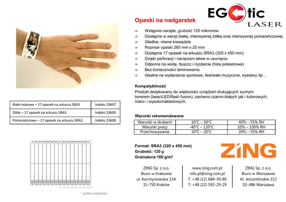 Opaski na nadgarstek • • • • • • • • • Białe matowe – 17 opasek na arkuszu SRA3 Indeks 23607 Żółte – 17 opasek na arkuszu SRA3 Indeks 23609 Pomarańczowe – 17 opasek na arkuszu SRA3 Indeks 23608 Wstępnie nacięte, grubość 120 mikronów Dostępne w wersji białej, intensywnej żółtej oraz intensywnej pomarańczowej Gładkie, równe krawędzie Rozmiar opaski 265 mm x 25 mm Dostępne 17 opasek na arkuszu SRA3 (320 x 450 mm) Dzięki perforacji i nacięciom łatwe w usunięciu Odporne na wodę, tłuszcz i rozdarcie (folia poliestrowa) Bez konieczności laminowania Idealne na wydarzenia sportowe, festiwale muzyczne, wystawy itp… Kompatybilność Produkt dedykowany do większości urządzeń drukujących suchym tonerem (laser/LED/flash fusion), zarówno czarno-białych jak i kolorowych, nisko- i wysokonakładowych. Warunki rekomendowane Warunki w drukarni Warunki pracy Przechowywanie 10°C – 30°C -40°C – 120°C 10°C – 20°C 40% – 55% RH 10% – 100% RH 20% – 55% RH Format: SRA3 (320 x 450 mm) Grubość: 120 µ Gramatura:160 g/m2 ZING Sp. z o.o. Biuro w Krakowie ul. Kocmyrzowska 13A 31-750 Kraków * grafika poglądowa www.zing.com.pl [email protected] T: +48 (12) 684-39-80 T: +48 (22) 592-29-29 ZING Sp. z o.o. Biuro w Warszawie Al. Jerozolimskie 212 02-486 Warszawa