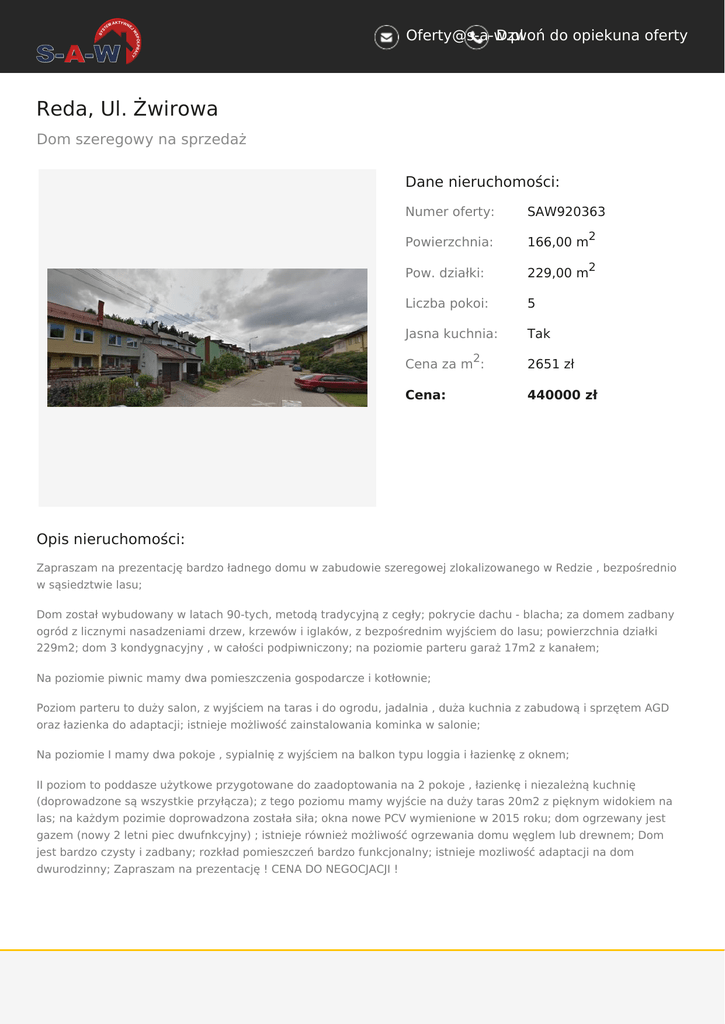 [email protected] Dzwoń do opiekuna oferty Reda, Ul. Żwirowa Dom szeregowy na sprzedaż Dane nieruchomości: Numer oferty: SAW920363 Powierzchnia: 166,00 m 2 Pow. działki: 229,00 m 2 Liczba pokoi: 5 Jasna kuchnia: Tak 2 Cena za m : 2651 zł Cena: 440000 zł Opis nieruchomości: Zapraszam na prezentację bardzo ładnego domu w zabudowie szeregowej zlokalizowanego w Redzie , bezpośrednio w sąsiedztwie lasu; Dom został wybudowany w latach 90-tych, metodą tradycyjną z cegły; pokrycie dachu - blacha; za domem zadbany ogród z licznymi nasadzeniami drzew, krzewów i iglaków, z bezpośrednim wyjściem do lasu; powierzchnia działki 229m2; dom 3 kondygnacyjny , w całości podpiwniczony; na poziomie parteru garaż 17m2 z kanałem; Na poziomie piwnic mamy dwa pomieszczenia gospodarcze i kotłownie; Poziom parteru to duży salon, z wyjściem na taras i do ogrodu, jadalnia , duża kuchnia z zabudową i sprzętem AGD oraz łazienka do adaptacji; istnieje możliwość zainstalowania kominka w salonie; Na poziomie I mamy dwa pokoje , sypialnię z wyjściem na balkon typu loggia i łazienkę z oknem; II poziom to poddasze użytkowe przygotowane do zaadoptowania na 2 pokoje , łazienkę i niezależną kuchnię (doprowadzone są wszystkie przyłącza); z tego poziomu mamy wyjście na duży taras 20m2 z pięknym widokiem na las; na każdym pozimie doprowadzona została siła; okna nowe PCV wymienione w 2015 roku; dom ogrzewany jest gazem (nowy 2 letni piec dwufnkcyjny) ; istnieje również możliwość ogrzewania domu węglem lub drewnem; Dom jest bardzo czysty i zadbany; rozkład pomieszczeń bardzo funkcjonalny; istnieje mozliwość adaptacji na dom dwurodzinny; Zapraszam na prezentację ! CENA DO NEGOCJACJI ! [email protected] Dzwoń do opiekuna oferty