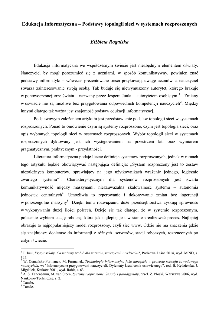 Edukacja Informatyczna – Podstawy topologii sieci w systemach rozproszonych Elżbieta Rogalska Edukacja informatyczna we współczesnym świecie jest niezbędnym elementem oświaty. Nauczyciel by mógł porozumieć się z uczniami, w sposób komunikatywny, powinien znać podstawy informatyki – wówczas prezentowane treści przykuwają uwagę uczniów, a nauczyciel stwarza zainteresowanie swoją osobą. Tak buduje się niewymuszony autorytet, którego brakuje w ponowoczesnej erze świata – nazwany przez Jespera Juula – autorytetem osobistym 1. Zmiany w oświacie nie są możliwe bez przygotowania odpowiednich kompetencji nauczycieli2. Między innymi dlatego tak ważna jest znajomość podstaw edukacji informatycznej. Podstawowym założeniem artykułu jest przedstawienie podstaw topologii sieci w systemach rozproszonych. Ponad to omówienie czym są systemy rozproszone, czym jest topologia sieci; oraz opis wybranych topologii sieci w systemach rozproszonych. Wybór topologii sieci w systemach rozproszonych dyktowany jest ich występowaniem na przestrzeni lat, oraz wymiarem pragmatycznym, praktycznym - przydatności. Literatura informatyczna podaje liczne definicje systemów rozproszonych, jednak w ramach tego artykułu będzie obowiązywać następująca definicja: „System rozproszony jest to zestaw niezależnych komputerów, sprawiający na jego użytkownikach wrażenie jednego, logicznie zwartego systemu”3. Charakterystycznym dla systemów rozproszonych jest zwarta komunikatywność między maszynami, niezauważalna skalowalność systemu – autonomia jednostek centralnych4. Umożliwia to reperowanie i dokonywanie zmian bez ingerencji w poszczególne maszyny5. Dzięki temu rozwiązaniu duże przedsiębiorstwa zyskują sprawność w wykonywaniu dużej ilości poleceń. Dzieje się tak dlatego, że w systemie rozproszonym, polecenie wybiera stację roboczą, która jak najlepiej jest w stanie zrealizować proces. Najlepiej obrazuje to najpopularniejszy model rozproszony, czyli sieć www. Gdzie nie ma znaczenia gdzie się znajdujesz; docierasz do informacji z różnych serwerów, stacji roboczych, rozrzuconych po całym świecie. 1 J. Juul, Kryzys szkoły. Co możemy zrobić dla uczniów, nauczycieli i rodziców?, Podkowa Leśna 2014, wyd. MiND, s. 133. 2 W. Osmańska-Furmanek, M. Furmanek, Technologia informacyjna jako narzędzie w procesie rozwoju zawodowego nauczyciela, w: "Informatyczne przygotowani nauczycieli. Dylematy kształcenia ustawicznego", red. B. Kędzierska, J. Migdałek, Kraków 2001, wyd. Rabit, s. 63. 3 A. S. Tanenbaum, M. van Steen, Systemy rozproszone. Zasady i paradygmaty, przeł. Z. Płoski, Warszawa 2006, wyd. Naukowo-Techniczne, s. 2. 4 Tamże. 5 Tamże. Topologia sieci w technicznej literaturze przedmiotu, jest opisywana różnorodnie. Ramy artykułu będą ujmować topologię sieci jako „Topologia sieci określa sposób jej wykonania, czyli połączenia urządzeń komputerowych za pomocą medium transmisyjnego.6” Topologia sieci jest to sposób łącznia poszczególnych komputerów z serwerem (bazą). Do najpopularniejszych należy: pierścień i gwiazda, to właśnie te topologie sieci w systemach rozproszonych poruszę na łamach tego artykułu. Topologie sieci w systemach rozproszonych dzielą się na dwie podstawowe kategorie: sieci całkowicie połączone i sieci częściowo połączone. Pragmatyczność artykułu podpowiada, że koszt sieci częściowo połączonej jest niższy, z uwagi na mniej kabli potrzebnych do połączenia ze sobą stacji roboczych. Koszt to jednak nie wszystko, są aspekty, które są bardziej ważne. Przykładem jest jak najmniejsza strata w przypadku awarii. Awaria dosięga, prędzej czy później, każdą rzecz martwą, a to oznacza, że przy wyborze należy kierować się kryterium dostępności. Kolejnym kryterium jest komunikatywność i związany z nią koszt. Topologia gwiazdy to połączenie wszystkich jednostek centralnych wokół serwera, do którego stacje robocze są podłączone oddzielnie. Topologia pierścienia to liniowe połączenie ze sobą wszystkich stacji roboczych, w okrąg, zazwyczaj jedna stacja pełni funkcje serwera. Porównajmy obie topologie sieci pod kątem przedstawionych wyżej kryteriów: koszt, dostępność, komunikatywność. Koszt to wynik zestawienia za i przeciw kryterium dostępności i komunikatywności. Dostępność w przypadku topologii sieci pierścieniowej jest duża, ponieważ struktura ulega degradacji tylko w chwili awarii dwóch łączy. Przypadek topologii sieci gwiaździstej do degradacji wystarczy jedno łącze (jednak należy wziąć pod uwagę fakt, że jest to awaria tylko jednej stacji roboczej, podczas gdy w topologii sieci pierścieniowej degradacji ulega więcej stanowisk). Komunikatywność w obu przypadkach jest mniej więcej taka sama. Przypadek pięciu stacji roboczych i serwera, oznacza, pięć połączeń w topologii sieci gwiaździstej i sześć połączeń w przypadku sieci pierścieniowej. Topologia sieci pierścieniowej ma dodatkowy minus, w postaci przechodzenia informacji z jednej stacji roboczej na drugą, natomiast w topologii sieci gwiaździstej informacje przechodzą do poszczególnych stacji roboczych poprzez serwer – co ułatwia i przede wszystkim dodaje szybkości transmisji danych. Ogromnym minusem topologii sieci gwiaździstej jest sytuacja, w której ulega awarii serwer – wówczas nie działają wszystkie stacje robocze.7 Podsumowując perspektywa budowania sieci w systemach rozproszonych to dylemat pomiędzy wyborem sieci całkowicie połączonej i sieci częściowo połączonej. Sieć całkowicie połączona wiąże się z ogromnymi kosztami, w związku z tym artykuł skupia się na sieci częściowo połączonej. Ramy tego typu sieci to opłacalność tworzenia sieci opartej na topologii gwiaździstej 6 K. Pytel, S. Osetek, Systemy operacyjne i sieci komputerowe cz. I, wyd. Wsip, s. 190. A. Silberschatz, P. B. Galvin, G. Gagne, Po