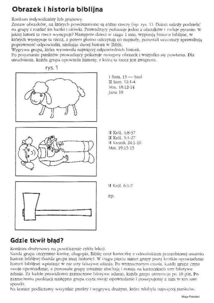 Obrazek i historia biblijna Konkurs indywidualny lub grupowy. Zcs1;1w ohrazk6w, na któryd1 po:ed~ca\\"ionc są różne fZ<:'<.-~y (np. ry.... 1). Dzieci nak-ży podziclk' na grupy i rozcfać im kari.k i i oł(>wki. Prowad7.ący pokan1je jeden '.l obrazków i 7:idaje pytanie: W jakiej hstorii ta rzeo: występuje? Następnie dzieci w ci<JgL1 1 min. ~-yvisuj•l h ist.or:e bibl ijne, w kt<\tych występuje ta rzecz, a polem glo.~ no ociCZ)'tLlją co napis;iły, pozostali uczcsmcy sprnwdzają popraw11og(: odpowiedzi, szi.1k;.1ją(: danej historii w Diblii. W'ygryw;,i grupa, kt6rn wyrnleni la najwii;:c.ej odpowlednicli historii. Po przyznaniu punktó'N prow<ld zacy pokazuje nasi ęp11y obrazek i wszystko .'>ię powl.arza. Ola 1.11rud11ienia, każda grupa opowiada historię, z 1<161":-1 ta rzccr jest zwiąwn:1. rys. 1 I Sam. 15 - ~faul II Si1m. 12: 1-4 .\-1:11„ \8:12-14 .J ana JO rr K r6l. 1 :8-37 u K.rL5l. ) : 1-27 11 Kronik 24:1-l (i .vtat. l 9:B 15 li l\rc.'i l. 6: 1-7 irp. I I I Gdzie Konkurs tkwił błąd? dmżynowy na [X>wt1'.lrzcnic cyklu lekcji. Kllż<la grup;-. otrzymuje k;irlkę, t.llugopis. I3.61i" Or:l7 kMten·kę z cxlnc~~nikicm p1zcrobionej os1atnio h i.srom bibiijntj (ka7.<l>t grnpa inn:i histori<_>). W ciągu plt:eiu minut grupy pis?.:! kn'>lkie opowi:ldanic hl.Storii biblijnej wpiata1ąc w nk~ t.r7.y fab,zywe zd:.inia . Po v..·yzn:1czonym cz„~it::, każ<b i;:rupa ~zyrn swoje opowiadanie, ;1. po7.0SUiłt: g rupy uważnie slu«haj:1 i notuj:,, na kartcczkllch c1:zy b.b7.ywe zclanl.H. Z~1 każde prmviclłown zaz1rno:one fałszywe ~.d•lnic, każda g111p:1 oto.y11n1je pe 10 pkt. Pn zazn<1.t":r.eniu punkcacji następn;1 grupa czyta swoje opowiad~rnie i pos1epujc:m y z nim w ter. sarn spo~c'>b. N:1 knnicc podlicz;irny w~Z)'Stkie punkty i wygrywa drużyna , któr~t 7.dobyl'a 11ajw1.;ccj punk(,w . Misja Pokoleń