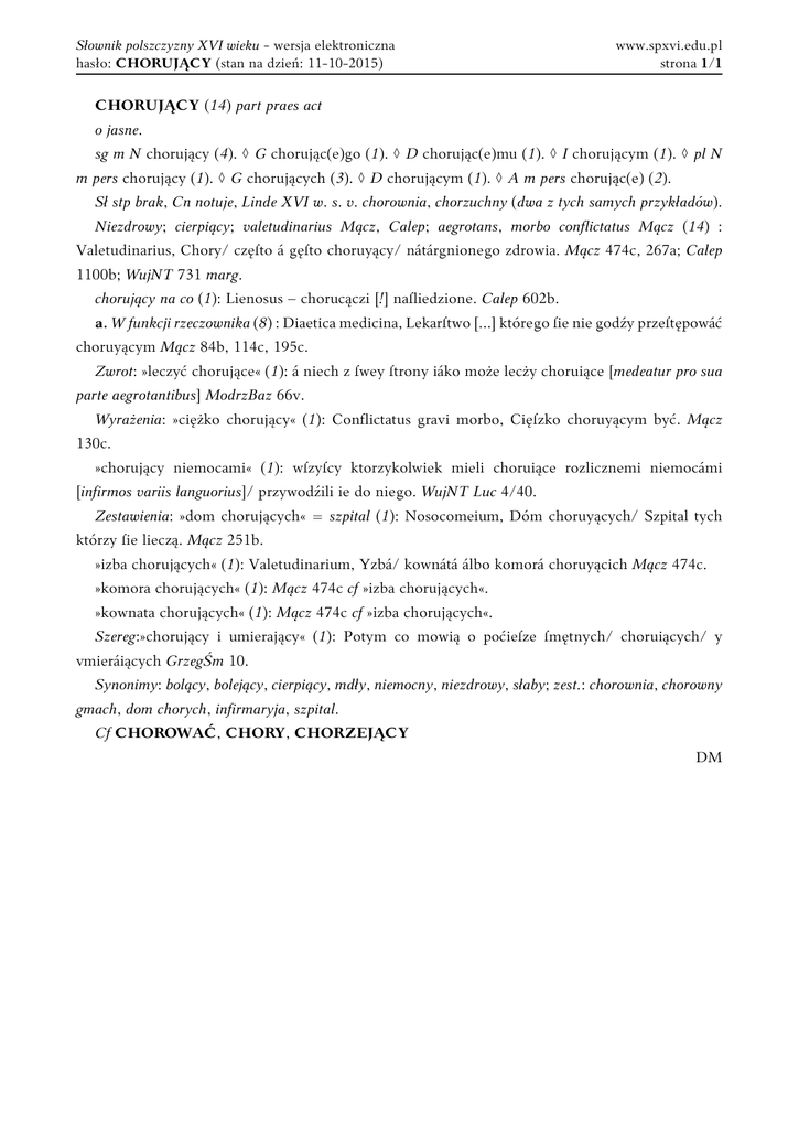 Słownik polszczyzny XVI wieku - wersja elektroniczna hasło: CHORUJĄCY (stan na dzień: 11-10-2015) www.spxvi.edu.pl strona 1/1 CHORUJĄCY (14) part praes act o jasne. sg m N chorujący (4). ◊ G chorując(e)go (1). ◊ D chorując(e)mu (1). ◊ I chorującym (1). ◊ pl N m pers chorujący (1). ◊ G chorujących (3). ◊ D chorującym (1). ◊ A m pers chorując(e) (2). Sł stp brak, Cn notuje, Linde XVI w. s. v. chorownia, chorzuchny (dwa z tych samych przykładów). Niezdrowy; cierpiący; valetudinarius Mącz, Calep; aegrotans, morbo conflictatus Mącz (14) : Valetudinarius, Chory/ częſto á gęſto choruyący/ nátárgnionego zdrowia. Mącz 474c, 267a; Calep 1100b; WujNT 731 marg. chorujący na co (1): Lienosus ‒ chorucączi [!] naſliedzione. Calep 602b. a. W funkcji rzeczownika (8) : Diaetica medicina, Lekarſtwo [...] którego ſie nie godźy przeſtępowáć choruyącym Mącz 84b, 114c, 195c. Zwrot: »leczyć chorujące« (1): á niech z ſwey ſtrony iáko może lecży choruiące [medeatur pro sua parte aegrotantibus] ModrzBaz 66v. Wyrażenia: »ciężko chorujący« (1): Conflictatus gravi morbo, Cięſzko choruyącym być. Mącz 130c. »chorujący niemocami« (1): wſzyſcy ktorzykolwiek mieli choruiące rozlicznemi niemocámi [infirmos variis languorius]/ przywodźili ie do niego. WujNT Luc 4/40. Zestawienia: »dom chorujących« = szpital (1): Nosocomeium, Dóm choruyących/ Szpital tych którzy ſie lieczą. Mącz 251b. »izba chorujących« (1): Valetudinarium, Yzbá/ kownátá álbo komorá choruyącich Mącz 474c. »komora chorujących« (1): Mącz 474c cf »izba chorujących«. »kownata chorujących« (1): Mącz 474c cf »izba chorujących«. Szereg:»chorujący i umierający« (1): Potym co mowią o poćieſze ſmętnych/ choruiących/ y vmieráiących GrzegŚm 10. Synonimy: bolący, bolejący, cierpiący, mdły, niemocny, niezdrowy, słaby; zest.: chorownia, chorowny gmach, dom chorych, infirmaryja, szpital. Cf CHOROWAĆ, CHORY, CHORZEJĄCY DM