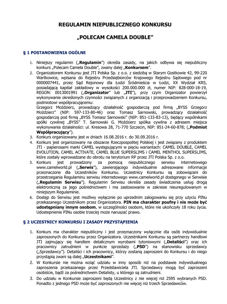 REGULAMIN NIEPUBLICZNEGO KONKURSU „POLECAM CAMELA DOUBLE” § 1 POSTANOWIENIA OGÓLNE 1. Niniejszy regulamin („Regulamin”) określa zasady, na jakich odbywa się niepubliczny konkurs „Polecam Camela Double”, zwany dalej „Konkursem”. 2. Organizatorem Konkursu jest JTI Polska Sp. z o.o. z siedzibą w Starym Gostkowie 42, 99-220 3. 4. 5. 6. Wartkowice, wpisana do Rejestru Przedsiębiorców Krajowego Rejestru Sądowego pod nr 0000007441, przez Sąd Rejonowy dla Łodzi Śródmieścia w Łodzi, XX Wydział KRS, posiadającą kapitał zakładowy w wysokości 200.000.000 zł, numer NIP: 828-000-18-19, REGON: 0013001991 („Organizator” lub „JTI”), przy czym Organizator powierzył wykonywanie określonych czynności związanych z organizacją i przeprowadzeniem Konkursu, podmiotowi współpracującemu: Grzegorz Moździerz, prowadzący działalność gospodarczą pod firmą „BYSS Grzegorz Moździerz” (NIP: 597-133-80-46) oraz Tomasz Sarnowski, prowadzący działalność gospodarczą pod firmą „BYSS Tomasz Sarnowski” (NIP: 851-133-83-13), będący wspólnikami spółki cywilnej „BYSS” T. Sarnowski G. Moździerz spółka cywilna z adresem miejsca wykonywania działalności: ul. Kresowa 28, 71-770 Szczecin, NIP: 851-24-60-878; („Podmiot Współpracujący”). Konkurs organizowany jest w dniach 16.08.2016 r. do 30.09.2016 r. Konkurs jest organizowany na obszarze Rzeczpospolitej Polskiej i jest związany z produktem JTI - papierosami marki CAMEL występującymi w pięciu wariantach: CAMEL DOUBLE, CAMEL EVOLUTION, CAMEL ACTIVATE, CAMEL BLUE SUPERSLIMS i CAMEL MENTHOL SUPERSLIMS, które zostały wprowadzane do obrotu na terytorium RP przez JTI Polska Sp. z o.o. Konkurs jest prowadzony za pomocą niepublicznego serwisu internetowego www.camelworld.pl („Serwis”), zawierającego indywidualnie adresowane informacje przeznaczone dla Uczestników Konkursu. Uczestnicy Konkursu są zobowiązani do przestrzegania Regulaminu serwisu internetowego www.camelworld.pl dostępnego w Serwisie („Regulamin Serwisu”). Regulamin Serwisu określa zasady świadczenia usług drogą elektroniczną za jego pośrednictwem i ma zastosowanie w zakresie nieuregulowanym w niniejszym Regulaminie. Dostęp do Serwisu jest możliwy wyłącznie po uprzednim zalogowaniu się przy użyciu PINu przekazanego Uczestnikom przez Organizatora. PIN ma charakter poufny i nie może być udostępniany innym osobom, w szczególności osobom, które nie ukończyły 18 roku życia. Udostepnienie PINu osobie trzeciej może naruszać prawo. § 2 UCZESTNICY KONKURSU I ZASADY PRZYSTĄPIENIA 1. Konkurs ma charakter niepubliczny i jest przeznaczony wyłącznie dla osób indywidualnie zaproszonych do Konkursu przez Organizatora. Uczestnikami Konkursu są partnerzy handlowi JTI zajmujący się handlem detalicznym wyrobami tytoniowymi („Detaliści”) oraz ich pracownicy zatrudnieni w punkcie sprzedaży („PSD”) na stanowisku sprzedawcy („Sprzedawcy”). Detaliści i ich pracownicy, którzy zostaną zaproszeni do Konkursu i do niego przystąpią zwani są dalej „Uczestnikami”. 2. W Konkursie nie można wziąć udziału w inny sposób niż na podstawie indywidualnego zaproszenia przekazanego przez Przedstawiciela JTI. Sprzedawcy mogą być zaproszeni osobiście, bądź za pośrednictwem Detalisty, u którego są zatrudnieni. 3. Do udziału w Konkursie zaproszeni będą Uczestnicy z nie więcej niż 2595 wybranych PSD. Ponadto z jednego PSD może być zaproszonych nie więcej niż trzech Sprzedawców. 4. W Konkursie mogą uczestniczyć wyłącznie pełnoletnie osoby fizyczne, posiadające pełną zdolność do czynności prawnych. Udział w Konkursie jest dobrowolny. 5. W Konkursie nie mogą brać udziału: a. pracownicy Organizatora oraz Podmiotu Współpracującego (przez pracowników rozumie się również osoby współpracujące z Organizatorem lub Podmiotem Współpracującym na podstawie umowy zlecenia lub umowy o dzieło); b. najbliżsi członkowie rodzin osób wymienionych w pkt a), to jest osoby zaliczane do I grupy podatkowej w rozumieniu przepisów ustawy o podatku od spadków i darowizn oraz osoby pozostające z osobami wymienionymi w pkt a) we wspólnym gospodarstwie domowym. 6. Organizator ma prawo weryfikacji spełniania warunków uczestnictwa w Konkursie określonych powyżej, między innymi poprzez poproszenie Uczestnika o złożenie odpowiedniego oświadczenia na piśmie. 7. W celu przeprowadzenia Konkursu Organizator będzie przetwarzał niezbędne dane osobowe Uczestników: imię, nazwisko, numer telefonu komórkowego, adres e-mail, a także nazwę oraz adres PSD, w którym Uczestnik pracuje. Dane te będą przetwarzane wyłącznie w celu przeprowadzenia Konkursu i realizacji czynności bezpośrednio z nim związanych, chyba, że Uczestnik wyrazi zgodę na przetwarzanie danych w celach marketingowych. Jako przetwarzanie danych w celu przeprowadzenia Konkursu rozumie się na przykład rozpatrzenie reklamacji, czy wydanie nagrody. Dane osobowe Uczestników będą przetwarzane zgodnie z przepisami ustawy z dnia 29 sierpnia 1997 r. o ochronie danych osobowych oraz innymi obowiązującymi aktami prawa. Uczestnik ma prawo wglądu do treści swoich danych osobowych oraz do ich poprawiania. Administratorem danych osobowych Uczestników jest Organizator, tj. JTI Polska Sp. z o.o. z siedzibą w Starym Gostkowie 42, 99-220 Wartkowice. Przetwarzanie danych osobowych Uczestników powierzono, w niezbędnym zakresie, Podmiotom Współpracującym. Zasady ochrony danych w Serwisie określa Polityka prywatności dostępna na www.camelworld.pl. 8. Uczestnicy przystępują do Konkursu poprzez zarejestrowanie się w Serwisie. Rejestracja jest możliwa po wpisaniu PINu i wymaga podania danych niezbędnych do założenia konta Uczestnika i udziału w Konkursie. Przystąpić do Konkursu można przez cały czas jego trwania. 9. W sprawach związanych z przeprowadzeniem Konkursu JTI może kontaktować się z Uczestn
