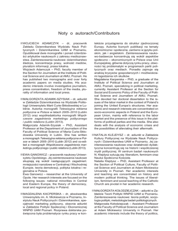 Noty o autorach/Contributors <WOJCIECH ADAMCZYK – dr, pracownik Zak³adu Dziennikarstwa Wydzia³u Nauk Politycznych i Dziennikarstwa UAM w Poznaniu. Opublikowa³ dwie monografie i ponad czterdzieœci artyku³ów naukowych z zakresu medioznawstwa. Zainteresowania naukowe: dziennikarstwo œledcze, koncentracja prasy, wolnoœæ mediów, pluralizm informacji, prasa lokalna. Wojciech Adamczyk – PhD, faculty member of the Section for Journalism at the Institute of Political Science and Journalism at AMU, Poznañ. He has published two monographs and over forty academic papers on media studies. His academic interests involve investigative journalism, press concentration, freedom of the media, plurality of information and local press. <MA£GORZATA ADAMIK-SZYSIAK – dr, adiunkt w Zak³adzie Dziennikarstwa na Wydziale Politologii Uniwersytetu Marii Curie-Sk³odowskiej w Lublinie. Autorka monografii Telewizyjna reklama polityczna w Polsce w latach 2005–2010 (Lublin 2012) oraz wspó³redaktorka monografii Wspó³czesne zagadnienia marketingu politycznego i public relations (Lublin 2013). Ma³gorzata Adamik-Szysiak – PhD, Assistant Professor at the Department of Journalism of the Faculty of Political Science of Maria Curie-Sk³odowska University in Lublin. She has written a monograph Telewizyjna reklama polityczna w Polsce w latach 2005–2010 (Lublin 2012) and co-edited a monograph Wspó³czesne zagadnienia marketingu politycznego i public relations (Lublin 2013). <EWA GANOWICZ – pracownik naukowy Uniwersytetu Opolskiego. Jej zainteresowania naukowe skupiaj¹ siê wokó³ nastêpuj¹cych zagadnieñ: mniejszoœci narodowe w Centralnej i Wschodniej Europie, teoria demokracji, polityka lokalna i regionalna w Polsce. Ewa Ganowicz – researcher at the University of Opole. Her research interests are focused on the following issues: national minorities in Central and Eastern Europe, the theory of democracy, local and regional policy in Poland. <MAGDALENA KACPERSKA – dr, absolwentka Uniwersytetu im. A. Mickiewicza w Poznaniu, Instytutu Nauk Politycznych i Dziennikarstwa, specjalnoœæ marketing polityczny, obecnie adiunkt w Zak³adzie Polityki Spo³ecznej i Ekonomicznej WNPiD UAM Poznañ. Rozprawa doktorska poœwiêcona by³a problematyce rynku pracy w kon- tekœcie przyst¹pienia do struktur zjednoczonej Europy. Autorka licznych publikacji na tematy ekonomiczne i spo³eczne, zarówno w jêzyku polskim, jak i angielskim. Zainteresowania naukowo-badawcze koncentruj¹ siê wokó³ aspektów spo³eczno – ekonomicznych w Polsce oraz Unii Europejskiej, g³ównie dotycz¹ rynku pracy, obecnoœci tej problematyki w programach partii politycznych oraz mediach. Ponadto zajmuje siê analiz¹ kryzysów gospodarczych i mo¿liwoœciami ³agodzenia ich skutków. Magdalena Kacperska – PhD, a graduate of the Institute of Political Science and Journalism at AMU, Poznañ, specializing in political marketing, currently Assistant Professor at the Section for Social and Economic Policy of the Faculty of Political Science and Journalism of AMU, Poznañ. She devoted her doctoral dissertation to the issues of the labor market in the context of Poland’s joining the United Europe’s structures. Her academic and research interests are concentrated on socio-economic aspects in Poland and the European Union, mainly with reference to the labor market and the presence of this issue in the platforms of political parties and the media. She also deals with the analysis of economic crises and the possibilities of alleviating their aftermath. <NATALIA KLEJDYSZ – dr, adiunkt w Zak³adzie Kultury Politycznej na Wydziale Nauk Politycznych i Dziennikarstwa UAM w Poznaniu. Jej zainteresowania naukowe oraz dzia³alnoœæ dydaktyczna koncentruj¹ siê na historii i wspó³czesnej myœli politycznej. W centrum badañ naukowych N. Klejdysz sytuuj¹ siê: liberalizm, feminizm oraz Nauka Spo³eczna Koœcio³a. Natalia Klejdysz – PhD, Assistant Professor at the Section of Political Culture, Faculty of Political Science and Journalism at Adam Mickiewicz University in Poznañ. Her academic interests and teaching are concentrated on history and modern political thinking. The issues of liberalism, feminism and social teaching of the Catholic Church are pivotal in her academic research. <MA£GORZATA KO£ODZIEJCZAK – adiunkt w Zak³adzie Teorii Polityki WNPiD UAM w Poznaniu. Zainteresowania naukowe: teoria polityki, socjologia polityki, metodologia badañ politologicznych. Ma³gorzata Ko³odziejczak – Assistant Professor at the Faculty of Political Science and Journalism at Adam Mickiewicz University in Poznañ. Her academic interests include the theory of politics, 272 Noty o autorach/Contributors sociology of politics, and methodology of political research. <KRZYSZTOF KOWALCZYK – dr hab., adiunkt w Instytucie Politologii i Europeistyki Uniwersytetu Szczeciñskiego. Zajmuje siê polskim system politycznym, marketingiem politycznym, koœcio³ami i zwi¹zkami wyznaniowymi. Cz³onek Zarz¹du G³ównego Polskiego Towarzystwa Nauk Politycznych. Krzysztof Kowalczyk – PhD, postdoctoral degree, Assistant Professor at the Institute of Political Studies and European Studies of Szczecin University. He deals with the political system in Poland, political marketing, churches and religious associations. He is a member of the Board of the Polish Political Science Association. <RYSZARD KOWALCZYK – profesor, kierownik Zak³adu Dziennikarstwa na Wydziale Nauk Politycznych i Dziennikarstwa UAM w Poznaniu. Jego zainteresowania naukowe i badawcze koncentrujê siê na mediach lokalnych, komunikowaniu spo³ecznym, organizacjach pozarz¹dowych oraz samorz¹dzie terytorialnym. Ostatnio wydane ksi¹¿ki: Media lokalne w Polsce (Poznañ 2008), Rynek prasy lokalnej w Wielkopolsce 1990–2010 (Poznañ–Opole 2010), Wspó³czesna prasa lokalna w Wielkopolsce (Opole 2012), Czasopiœmiennictwo regionalistyczne w Polsce (Opole 2013). Ryszard Kowalczyk – p