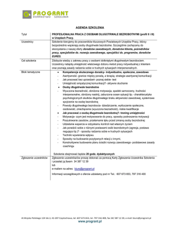 AGENDA SZKOLENIA Tytuł Uczestnicy Cel szkolenia Bloki tematyczne PROFESJONALNA PRACA Z OSOBAMI DŁUGOTRWALE BEZROBOTNYMI (profil II i III) w Urzędach Pracy. Szkolenie kierujemy do pracowników kluczowych Powiatowych Urzędów Pracy, którzy bezpośrednio wspierają osoby długotrwale bezrobotne. Szczególnie zachęcamy do skorzystania z naszej oferty doradców zawodowych, doradców klienta, pośredników pracy, specjalistów ds. rozwoju zawodowego, specjaliści ds. programów, doradców EURES. Zdobycie wiedzy z zakresu pracy z osobami dotkniętymi długotrwałym bezrobociem. Uczestnicy nabędą umiejętność właściwego doboru metod pracy indywidualnej z klientem oraz poznają zasady radzenia sobie w trudnych sytuacjach interpersonalnych. - - Zgłoszenie uczestników Kompetencje skutecznego doradcy- indywidualne, społeczne, zawodowe Asertywność- granice między poradą, a terapią- strategie asertywnej komunikacji Jak pracować bez uprzedzeń- poznaj siebie- test Umiejętność empatycznej komunikacji?- aktywne słuchanie Osoby długotrwale bezrobotne Wyuczona bezradność, obniżona motywacja, spadek samooceny, trudności interpersonalne, obniżony nastrój, zaburzona ocean sytuacji itp.- charakterystyka psychologicznych skutków długotrwałego braku aktywności zawodowej, systemowe spojrzenie na osobę bezrobotną Powody długotrwałego bezrobocia- dziedziczenie, wykluczenie społeczne, osobowość, zniechęcenie (wyuczona bezradność), niskie kwalifikacje Jak pracować z osobą długotrwale bezrobotną?- trening umiejętności Motywacja- czym jest motywowanie do pracy, sposoby podnoszenia motywacji Poszukiwanie zasobów, przełamanie lęku przed zmianą osoby bezrobotnej Udzielanie wsparcia w odzyskaniu kontroli nad własnym życiem Jak poradzić sobie z różnymi postawami osób bezrobotnych (agresja, postawa negująca itp.)? - sposoby radzenia sobie w trudnych sytuacjach Techniki wywierania wpływu Sposoby na budowanie pozytywnych relacji z innymi, Konstruktywne budowanie planu ścieżki rozwoju zawodowego- podstawowe zasady coachingu Szkolenie obejmować będzie 20 godz. dydaktycznych Zgłoszenie uczestnika/ów proszę dokonać za pomocą Karty Zgłoszenia Uczestnika Szkolenia i przesłać ją faxem 34 387 12 39 lub e-mailem na adres: [email protected] Informacji szczegółowych o ofercie udzielamy pod nr Tel.: 607 673 653, 797 316 400 Al.Wojska Polskiego 124 lok.3, 42-207 Częstochowa, tel. 607 673 653, tel. 797 316 400, fax 34/ 387 12 39, e-mail: [email protected] www.progrant.pl