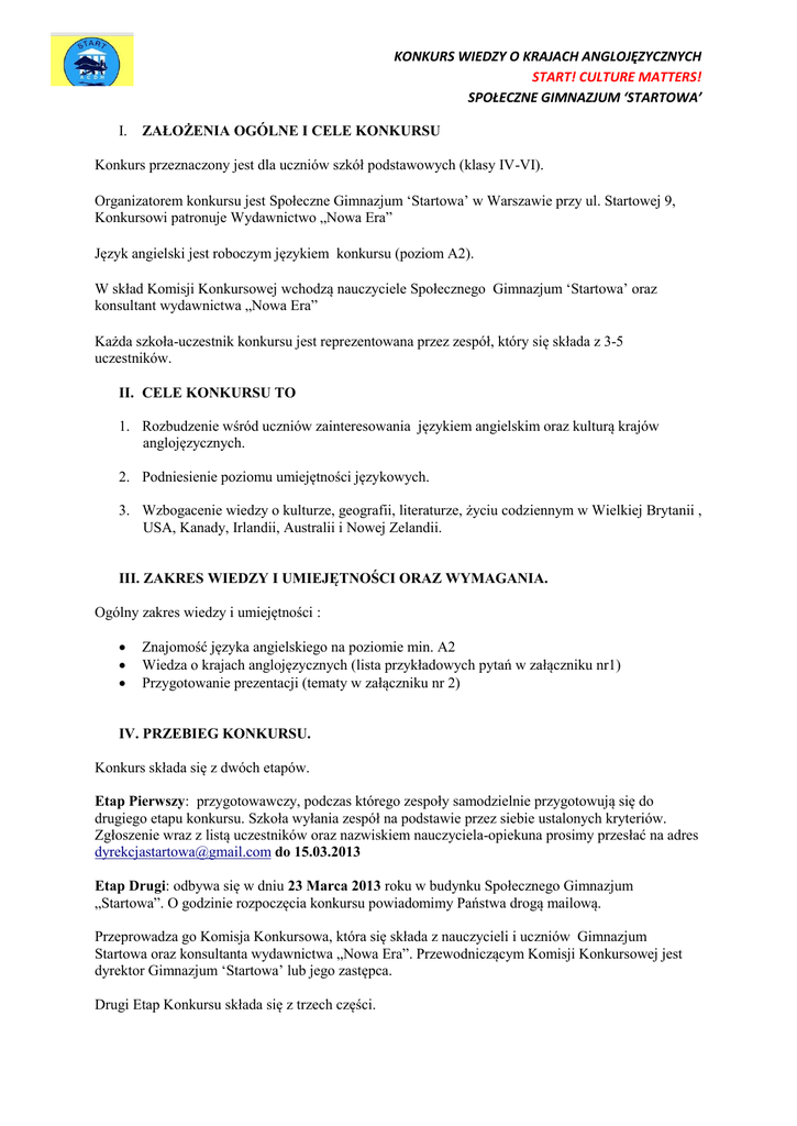 KONKURS WIEDZY O KRAJACH ANGLOJĘZYCZNYCH START! CULTURE MATTERS! SPOŁECZNE GIMNAZJUM ‘STARTOWA’ I. ZAŁOŻENIA OGÓLNE I CELE KONKURSU Konkurs przeznaczony jest dla uczniów szkół podstawowych (klasy IV-VI). Organizatorem konkursu jest Społeczne Gimnazjum ‘Startowa’ w Warszawie przy ul. Startowej 9, Konkursowi patronuje Wydawnictwo „Nowa Era” Język angielski jest roboczym językiem konkursu (poziom A2). W skład Komisji Konkursowej wchodzą nauczyciele Społecznego Gimnazjum ‘Startowa’ oraz konsultant wydawnictwa „Nowa Era” Każda szkoła-uczestnik konkursu jest reprezentowana przez zespół, który się składa z 3-5 uczestników. II. CELE KONKURSU TO 1. Rozbudzenie wśród uczniów zainteresowania językiem angielskim oraz kulturą krajów anglojęzycznych. 2. Podniesienie poziomu umiejętności językowych. 3. Wzbogacenie wiedzy o kulturze, geografii, literaturze, życiu codziennym w Wielkiej Brytanii , USA, Kanady, Irlandii, Australii i Nowej Zelandii. III. ZAKRES WIEDZY I UMIEJĘTNOŚCI ORAZ WYMAGANIA. Ogólny zakres wiedzy i umiejętności :    Znajomość języka angielskiego na poziomie min. A2 Wiedza o krajach anglojęzycznych (lista przykładowych pytań w załączniku nr1) Przygotowanie prezentacji (tematy w załączniku nr 2) IV. PRZEBIEG KONKURSU. Konkurs składa się z dwóch etapów. Etap Pierwszy: przygotowawczy, podczas którego zespoły samodzielnie przygotowują się do drugiego etapu konkursu. Szkoła wyłania zespół na podstawie przez siebie ustalonych kryteriów. Zgłoszenie wraz z listą uczestników oraz nazwiskiem nauczyciela-opiekuna prosimy przesłać na adres [email protected] do 15.03.2013 Etap Drugi: odbywa się w dniu 23 Marca 2013 roku w budynku Społecznego Gimnazjum „Startowa”. O godzinie rozpoczęcia konkursu powiadomimy Państwa drogą mailową. Przeprowadza go Komisja Konkursowa, która się składa z nauczycieli i uczniów Gimnazjum Startowa oraz konsultanta wydawnictwa „Nowa Era”. Przewodniczącym Komisji Konkursowej jest dyrektor Gimnazjum ‘Startowa’ lub jego zastępca. Drugi Etap Konkursu składa się z trzech części. KONKURS WIEDZY O KRAJACH ANGLOJĘZYCZNYCH START! CULTURE MATTERS! SPOŁECZNE GIMNAZJUM ‘STARTOWA’ Część I Zespołowa Celem części I jest poprawne odpowiedzenie na pytania zadane przez Komisję i w konsekwencji zdobycie jak największej ilości punktów. Każdy zespół odpowiada na pięć kolejno wybranych przez siebie pytań w pięciu kategoriach konkursowych. Każdy zespół po kolei wybiera kategorie oraz numer pytania w danej kategorii. (Pytania z listy będą ułożone w kolejności losowej) Prowadzący/Prowadząca konkurs zadaję pytania konkursowe. Zespół ma jedną minutę na omówienie pytania, po czym udziela odpowiedzi. Jeżeli odpowiedź jest uznana przez Komisję Konkursową za prawidłową, zespół otrzymuje jeden punkt. W sytuacji, gdy odpowiedź będzie uznana za nieprawidłową lub niepełną, pozostałe zespoły mogą udzielić odpowiedzi na pytanie i zdobyć punkt. Zespół może zrezygnować z udzielenia odpowiedzi na zadane pytanie, wtedy inne zespoły mają szansę odpowiedzieć na to pytanie. Część II Indywidualna Celem tej części konkursu jest przejście Drogą Wiedzy. Każdy zespół wybiera ze swojego grona jednego uczestnika. Zgodnie z ilością punktów, zebranych przez zespół w pierwszej części konkursu, przedstawiciel każdego zespołu wybiera jedną z trzech Dróg Wiedzy. Uczestnik z największą ilością punktów wybiera Drogę jako pierwszy. Uczestnik ze średnią ilością punktów wybiera Drogę jako drugi. Uczestnik z najmniejszą ilością punktów wybiera Drogę jako trzeci.    Granatowa Droga Wiedzy składa się z pięciu pól, na niej można się pomylić dwa razy; Czerwona Droga Wiedzy składa się z czterech pól, na niej można się pomylić jeden raz; Biała Droga Wiedzy składa się z trzech pól, na niej nie można się pomylić ani razu. Uczestnik, który ukończy Drogę jako pierwszy, zdobywa dla swojego zespołu 30 punktów. Uczestnik, który ukończy Drogę jako drugi, zdobywa dla swojego zespołu 20 punktów. Uczestnik, który ukończy Drogę jako trzeci, zdobywa dla swojego zespołu 10 punktów. Uczestnik, który nie ukończy Drogi zdobywa dla swojego zespołu 0 punktów. Jeżeli żaden z trzech uczestników nie odpowiedział na pytanie, pozostali członkowie zespołu mogą udzielić właściwą odpowiedź i zdobyć punkt. Część III Zespołowa Celem części III jest przedstawienie przygotowanej przez zespół na pierwszym etapie konkursu multimedialnej prezentacji. Temat prezentacji musi być wybrany z listy tematów prezentacji (załącznik 2). Nieprzekraczalny czas trwania prezentacji to 5 minut. Organizator konkursu zapewnia niezbędny sprzęt. Najlepiej oceniona przez Komisję prezentacja zdobywa 30 punktów. Drugie miejsce - zdobywa 20 punktów. Trzecie miejsce - zdobywa 10 punktów. Zwycięzcą Konkursu jest zespół, który zdobył największą ilość punktów w sumie w 3 częściach II etapu Konkursu KONKURS WIEDZY O KRAJACH ANGLOJĘZYCZNYCH START! CULTURE MATTERS! SPOŁECZNE GIMNAZJUM ‘STARTOWA’ Podsumowanie Uczestnicy konkursu otrzymują dyplomy uczestnictwa i ciekawe nagrody ufundowane przez Wydawnictwo „Nowa Era” Pytania prosimy kierować na [email protected] , [email protected] Przydatne strony internetowe : http://www.womkat.edu.pl/81,Jezyk_Angielski http://www.britannia.com/ www.historyofengland.net