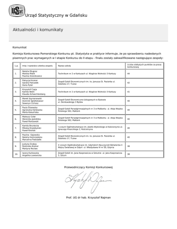 Urząd Statystyczny w Gdańsku Aktualności i komunikaty Komunikat Komisja Konkursowa Pomorskiego Konkursu pt. Statystyka w praktyce informuje, że po sprawdzeniu nadesłanych pisemnych prac wymaganych w I etapie Konkursu do II etapu - finału zostały zakwalifikowane następujące zespoły: L.p. Imię i nazwisko członka zespołu Nazwa szkoły Liczba zdobytych punktów za pracę konkursową 1. Natalia Długosz Monika Miotk Paulina Grzenkowicz Technikum nr 2 w Kartuzach ul. Wzgórze Wolności 3 Kartuzy 44 2. Patrycja Kromer Sandra Patrzałek Daria Pytel Zespół Szkół Ekonomicznych im. ks. Janusza St. Pasierba ul. Gdańska 17, Tczew 42 3. Krzysztof Czaja Kamila Went Klaudia Schwichtenberg Technikum nr 2 w Kartuzach ul. Wzgórze Wolności 3 Kartuzy 41 4. Marek Szymanowski Dominik Splettstoeser Seweryn Cichosz Zespół Szkół Ekonomiczno-Usługowych w Bytowie ul. Derdowskiego 3 Bytów 40 5. Paula Ślizewska Agnieszka Kotlewska Marta Kałuzińska Zespół Szkół Ponadgimnazjalnych nr 3 w Malborku ul. Aleja Wojska Polskiego 502, Malbork 40 6. Mateusz Celer Weronika Jaskólska Paweł Ronżewski Zespół Szkół Ponadgimnazjalnych nr 3 w Malborku ul. Aleja Wojska Polskiego 502, Malbork 40 7. Kamila Bruniecka Mikołaj Drożdżyński Paweł Kreński I Liceum Ogólnokształcące im. Józefa Wybickiego w Kościerzynie ul. Ignacego Krasickiego 2, Kościerzyna 40 8. Paulina Gajewska Natalia Koziorzębska Marcelina Podsiadło Zespół Szkół Ekonomicznych im. ks. Janusza St. Pasierba ul. Gdańska 17, Tczew 40 9. Justyna Grabas Dominika Konkol Martyna Recław X Liceum Ogólnokształcące im. Gdyńskich Nauczycieli Bohaterów II Wojny Światowej w Gdyni ul. Władysława IV nr 58, Gdynia 38 10. Iwona Kurkowska Angelika Lewowicka Zespół Szkół im. Jana Kasprowicza w Sztumie ul. Jana Kasprowicza 3, Sztum 38 Przewodniczący Komisji Konkursowej Prof. UG dr hab. Krzysztof Najman Sopot, dnia 5 czerwca 2015 r. Organizatorzy Konkursu informują, że zespoły uczniów z poniżej wymienionych szkół zostały zakwalifikowane do I etapu Konkursu. NAZWA SZKOŁY ILOŚĆ ZESPOŁÓW Powiatowy Zespół Szkół nr 1 w Kościerzynie ul. Władysława Sikorskiego 1, Kościerzyna 2 Zespół Szkół Mechanicznych i Logistycznych w Słupsku ul. Mieczysława Niedziałkowskiego 2, Słupsk 3 VI Liceum Ogólnokształcące w Gdyni ul. Kopernika 34, Gdynia 2 X Liceum Ogólnokształcące im. Gdyńskich Nauczycieli Bohaterów II Wojny Światowej w Gdyni ul. Władysława IV nr 58, Gdynia 3 Zespół Szkół Ekonomiczno-Usługowych w Bytowie ul. Derdowskiego 3, Bytów 2 Zespół Szkół Architektury Krajobrazu i Handlowo -Usługowych w Gdańsku ul. Józefa Czyżewskiego 31, Gdańsk 2 Zespół Szkół im. Jana Kasprowicza w Sztumie ul. Jana Kasprowicza 3, Sztum 1 Technikum nr 1 im. Noblistów Polskich w Starogardzie Gdańskim ul.Sobieskiego 6, Starogard Gdański 3 Zespół Szkół Agrobiznesu w Człuchowie ul. Parkowa 2, Człuchów 1 Zespół Szkół Ponadgimnazjalnych nr 1 w Malborku ul. 17 Marca 6, Malbork 3 Technikum nr 2 w Kartuzach ul. Wzgórze Wolności 3, Kartuzy 3 Zespół Szkół Ponadgimnazjalnych w Łodzierzy ul. Łodzierz 11, Miastko 2 Zespół Szkół Technicznych im. Józefa Szymczaka w Człuchowie ul. Koszalińska 2, Człuchów 1 Zespół Szkół Ponadgimnazjalnych nr 3 w Malborku ul. Aleja Wojska Polskiego 502, Malbork 3 Zespół Szkół Gastronomiczno-Hotelarskich w Gdańsku ul. Aleja Legionów 7, Gdańsk 1 II Liceum Ogólnokształcące im. Bolesława Chrobrego ul. Aleja Niepodległości 751, Sopot 1 ZSP-Technikum im. Rtm. Witolda Pileckiego w Przodkowie ul. Bursztynowa 3, Przodkowo 2 I Liceum Ogólnokształcące im. Mikołaja Kopernika w Gdańsku ul. Wały Piastowskie 6, Gdańsk 3 II Liceum Ogólnokształcące w Kwidzynie ul. Słoneczna 2, Kwidzyn 2 Zespół Szkół Ekonomicznych im. ks. Janusza St. Pasierba ul. Gdańska 17, Tczew 3 Zespół Szkół Ogólnokształcących w Ustce ul. Bursztynowa 12, Ustka 2 I Liceum Ogólnokształcące im. Józefa Wybickiego w Kościerzynie ul. Ignacego Krasickiego 2, Kościerzyna 1 III Liceum Ogólnokształcące w Sopocie ul. Kolberga 15, Sopot 3