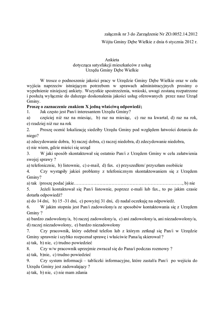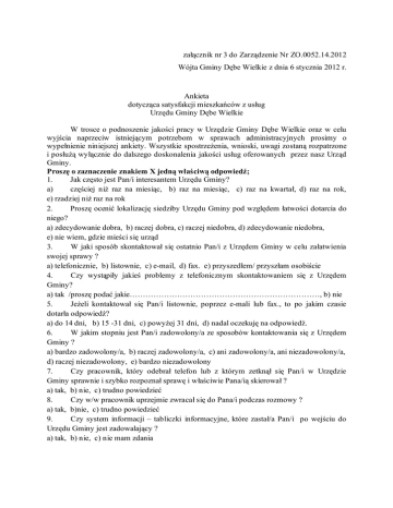 załącznik nr 3 do Zarządzenie Nr ZO.0052.14.2012 Wójta Gminy Dębe Wielkie z dnia 6 stycznia 2012 r. Ankieta dotycząca satysfakcji mieszkańców z usług Urzędu Gminy Dębe Wielkie W trosce o podnoszenie jakości pracy w Urzędzie Gminy Dębe Wielkie oraz w celu wyjścia naprzeciw istniejącym potrzebom w sprawach administracyjnych prosimy o wypełnienie niniejszej ankiety. Wszystkie spostrzeŜenia, wnioski, uwagi zostaną rozpatrzone i posłuŜą wyłącznie do dalszego doskonalenia jakości usług oferowanych przez nasz Urząd Gminy. Proszę o zaznaczenie znakiem X jedną właściwą odpowiedź; 1. Jak często jest Pan/i interesantem Urzędu Gminy? a) częściej niŜ raz na miesiąc, b) raz na miesiąc, c) raz na kwartał, d) raz na rok, e) rzadziej niŜ raz na rok 2. Proszę ocenić lokalizację siedziby Urzędu Gminy pod względem łatwości dotarcia do niego? a) zdecydowanie dobra, b) raczej dobra, c) raczej niedobra, d) zdecydowanie niedobra, e) nie wiem, gdzie mieści się urząd 3. W jaki sposób skontaktował się ostatnio Pan/i z Urzędem Gminy w celu załatwienia swojej sprawy ? a) telefonicznie, b) listownie, c) e-mail, d) fax. e) przyszedłem/ przyszłam osobiście 4. Czy wystąpiły jakieś problemy z telefonicznym skontaktowaniem się z Urzędem Gminy? a) tak /proszę podać jakie………………………………………………………………, b) nie 5. JeŜeli kontaktował się Pan/i listownie, poprzez e-mali lub fax., to po jakim czasie dotarła odpowiedź? a) do 14 dni, b) 15 -31 dni, c) powyŜej 31 dni, d) nadal oczekuję na odpowiedź. 6. W jakim stopniu jest Pan/i zadowolony/a ze sposobów kontaktowania się z Urzędem Gminy ? a) bardzo zadowolony/a, b) raczej zadowolony/a, c) ani zadowolony/a, ani niezadowolony/a, d) raczej niezadowolony, e) bardzo niezadowolony 7. Czy pracownik, który odebrał telefon lub z którym zetknął się Pan/i w Urzędzie Gminy sprawnie i szybko rozpoznał sprawę i właściwie Pana/ią skierował ? a) tak, b) nie, c) trudno powiedzieć 8. Czy w/w pracownik uprzejmie zwracał się do Pana/i podczas rozmowy ? a) tak, b)nie, c) trudno powiedzieć 9. Czy system informacji – tabliczki informacyjne, które zastał/a Pan/i po wejściu do Urzędu Gminy jest zadowalający ? a) tak, b) nie, c) nie mam zdania 10. Czy tabliczki informacyjne umieszczone przy wejściu do poszczególnych pomieszczeń pokoi w sposób wystarczający informują jakie osoby tam pracują i jaką sprawę moŜna załatwić ? a) tak, b) nie, c) nie mam zdania 11. Czy utworzony Punkt Informacyjno - Podawczy ułatwił Panu/i załatwienie sprawy w Urzędzie Gminy ? a) tak, b)nie, c) nie mam zdania 12. Jak Pan/i ocenia kontakt z pracownikiem Urzędu Gminy z którym miał Pan/i styczność ostatnio? a) bardzo dobrze, b) dobrze, c) zadawalająco, d) źle 13. Czy pracownik merytoryczny, który zajął się Pana/i sprawą był kulturalny i uprzejmy? a) zdecydowanie tak, b) raczej tak, c) raczej nie, d) zdecydowanie nie, e) trudno powiedzieć 14. Czy wyjaśnienie pracownika było zrozumiałe ? a) zdecydowanie tak, b) raczej tak, c) raczej nie, d) zdecydowanie nie, e) trudno powiedzieć 15. W jaki sposób pracownik zajął się Pana/i sprawą? a) sam udzielił wyjaśnienia, b) skierował do właściwej komórki organizacyjnej, gdzie rozpatrzono moją sprawę, c) wyjaśnił, Ŝe rozwiązanie sprawy nie leŜy w kompetencji Urzędu Gminy i skierował minie do właściwej instytucji, d) wyjaśnił, Ŝe rozwiązanie sprawy nie leŜy w kompetencji Urzędu Gminy i nie skierował mnie do właściwej instytucji, e) nie udzielił satysfakcjonującej odpowiedzi 16. W jakim stopniu jest Pan/i zadowolony z działań podjętych przez Urząd Gminy w Pana/i sprawie ? a) bardzo zadowolony/a, b)raczej zadowolony/a, c) ani zadowolony/a, ani nie zadowolony/a, d) raczej niezadowolony/a, e)bardzo niezadowolony/a 17. Proszę określić, gdzie najczęściej kieruje się Pan/i ze swoją sprawą : a) Wójt, b) Zastępca Wójta, c) Sekretarz, d) Skarbnik, e) Referat Zarządzania i Organizacji, f) Referat Finansowo – Księgowy, g) Referat Spraw Obywatelskich i Wojskowych, h) Referat Gospodarki Komunalnej i Ekologii, i) Referat Strategii i Rozwoju Gminy, j) Urząd Stanu Cywilnego, k) nie korzystam z usług Urzędu Gminy 18. Czy został/a Pan/i poinformowana o szczegółach załatwienia swojej sprawy (jakie dokumenty są wymagane, jaka jest wysokość opłaty skarbowej, itd.)? a) tak, b) raczej tak, c) nie 19. JeŜeli jest Pan/i niezadowolona z działań Urzędu Gminy w Pan/i sprawie, proszę podać dlaczego? ………………………………………………………………………………………………… 20. Jak Pan/i zdaniem naleŜy usprawnić pracę Urzędu Gminy, aby mógł być jak najbardziej pomocny przy rozwiązywaniu problemów mieszkańców Gminy? ....................................................................................................................................................... 21. Jakie są Pana/i propozycje zmian dotyczące funkcjonowania Urzędu Gminy? ………………………………………………………………………………………………….. ………………………………………………………………………………………………….. 22. Czy godziny pracy Urzędu Gminy są dogodne dla Pana/i? a) tak, b) nie (proszę podać jak powinny być zmienione)…………………………………… 23. Czy uwaŜa Pan/i Urząd Gminy za instytucję „ przyjazną społeczeństwu”? a) tak, b) raczej tak, c) raczej nie, d) nie 24. Jak często odwiedza Pan/i stronę internetową Urzędu Gminy www.debewielkie.pl/ oraz BIP? a) raz w tygodni, b) raz w miesiącu, c) rzadziej, d) wcale 25. Czy informacje zamieszczone na stronie internetowej oraz BIP są : a) bardzo dobrze, b) zadawalające, c) nie wystarczające 26. Jak ocenia Pan/i stronę internetową pod względem konstrukcji i zawartości ? Rodzaj dobrze Poziom oceny źl