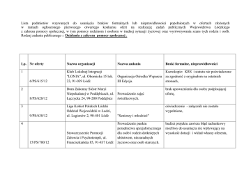 Lista podmiotów wzywanych do usunięcia braków formalnych lub nieprawidłowości popełnionych w ofertach złoŜonych w ramach ogłoszonego pierwszego otwartego konkursu ofert na realizację zadań publicznych Województwa Łódzkiego z zakresu pomocy społecznej, w tym pomocy rodzinom i osobom w trudnej sytuacji Ŝyciowej oraz wyrównywania szans tych rodzin i osób. Rodzaj zadania publicznego : Działania z zakresu pomocy społecznej . Lp. Nr oferty Nazwa organizacji Nazwa zadania 1 6/PS/615/12 Klub Lokalnej Integracji "LONIA", ul. Obornicka 15 lok. 23, 91-039 Łódź Kserokopie: KRS i statutu nie poświadczone Organizacja Ośrodka Wsparcia za zgodność z oryginałem na ostatnich III Edycja. stronach, brak upowaŜnienia dla osoby podpisującej ofertę, 8/PS/628/12 Dom Zakonny Sióstr Maryi Niepokalanej w Poddębicach, ul. Prowadzenie zajęć Łęczycka 24, 99-200 Poddębice świetlicowych. oświadczenie - załącznik nie zostało wypełnione, 9/PS/630/12 Liga Kobiet Polskich Łódzki Oddział Wojewódzki w Łodzi, ul. Legionów 2, 90-401 Łódź "Seniorzy i młodzieŜ" Stowarzyszenie Promocji Zdrowia i Psychoterapii, ul. Franciszkańska 85, 91-837 Łódź Prowadzenie punktu poradnictwa specjalistycznego dla osób i rodzin dotkniętych ubóstwem, niezaradnych Ŝyciowo oraz osób starszych. 2 3 4 15/PS/700/12 Braki formalne, nieprawidłowości budŜet projektu zawiera błąd rachunkowy moŜliwy do usunięcia nie wpływający na wysokość dotacji i wkład własny oferenta, 5 16/PS/701/12 Stowarzyszenie Promocji Zdrowia i Psychoterapii, ul. Franciszkańska 85, 91-837 Łódź 6 17/PS/702/12 Bank śywności w Łodzi im. Marka Edelmana, ul. Piłsudskiego 150/152, 92-230 Łódź Prowadzenie Klubu Aktywizacji Społecznej. Bank śywności w Łodzi jako główny dystrybutor Ŝywności dla potrzebujących mieszkańców województwa łódzkiego. 7 27/PS/748/12 Stowarzyszenie "Centrum Integracji MłodzieŜy Radomsko", ul. Ładna 31, 97500 Radomsko 31/PS/768/12 Brak statutu organizacji, brak oświadczenia załącznika, Kserokopie statutu nie poświadczona za zgodność z oryginałem na kaŜdej stronie, budŜet projektu zawiera błąd rachunkowy moŜliwy do usunięcia nie wpływający na wysokość dotacji i wkład własny oferenta, w oświadczeniu na końcu oferty brak daty, do której oferent związany jest z ofertą, "Inkubator aktywności" 8 "Stowarzyszenie Rozwoju Gminy Uniejów", ul. Bł. Bogumiła 13, 99-210 Uniejów budŜet projektu zawiera błąd rachunkowy moŜliwy do usunięcia nie wpływający na wysokość dotacji i wkład własny oferenta, Uniwersytet Trzeciego Wieku. Brak oświadczenia - załącznika, budŜet projektu zawiera błąd rachunkowy moŜliwy do usunięcia nie wpływający na wysokość dotacji i wkład własny oferenta, w oświadczeniu na końcu oferty brak daty, do której oferent związany jest z ofertą, 9 34/PS/796/12 Fundacja "Płomyk" im. Janiny Kuś na Rzecz Rozwoju Ziemi Witońskiej, ul. Łęczycka 6, 99335 Witonia Nazwa rodzaju zadania wskazana w ofercie nie jest zgodna z rodzajem zadania wskazanym w ogłoszeniu, termin realizacji zadania nie mieści się w przedziale czasowym wskazanym w ogłoszeniu, oświadczenie – załącznik nie zostało prawidłowo wypełnione, budŜet projektu zawiera błąd rachunkowy moŜliwy do usunięcia nie wpływający na wysokość dotacji i wkład własny oferenta, Świetlica Środowiskowa. 10 35/PS/797/12 Fundacja "Płomyk" im. Janiny Kuś na Rzecz Rozwoju Ziemi Witońskiej, ul. Łęczycka 6, 99335 Witonia Nazwa rodzaju zadania wskazana w ofercie nie jest zgodna z rodzajem zadania wskazanym w ogłoszeniu, oświadczenie – załącznik nie zostało prawidłowo wypełnione, budŜet projektu zawiera błędy rachunkowe moŜliwe do usunięcia i nie wpływające na wysokość kwoty wnioskowanej dotacji i wkładu własnego oferenta, Klub Seniora. 11 45/PS/908/12 Caritas Archidiecezji Łódzkiej, ul. Gdańska 111, 90-507 Łódź Program osłonowo aktywizujący dla dzieci i młodzieŜy "Zaczarowany ołówek" budŜet projektu zawiera błędy rachunkowe moŜliwe do usunięcia i nie wpływające na wysokość kwoty wnioskowanej dotacji i wkładu własnego oferenta, 12 52/PS/915/12 Towarzystwo Terenowych Opiekunów Społecznych "SAMARYTANIN", ul. Rewolucji 1905 r. 18 lok. 33, 90-207 Łódź 54/PS/917/12 Fundacja Pomocy Rodzinie „OPOKA”, ul. Pl. Barlickiego 11, 90-615 Łódź 13 Oświadczenie – załącznik zostało złoŜone na nieprawidłowym druku, Dystrybucja Ŝywności 2012 r. DZIECIĘCE S.O.S. budŜet projektu zawiera błędy rachunkowe moŜliwe do usunięcia nie wpływające na wysokość dotacji i wkład własny oferenta. Fundacja Centrum Praw Kobiet Oddział w Łodzi, ul. Piotrkowska 115 lok. 4 , 90-430 Łódź Równe szanse - prowadzenie specjalistycznego poradnictwa i wsparcia. Oświadczenie – załącznik nie zostało prawidłowo wypełnione, budŜet projektu zawiera błędy rachunkowe moŜliwe do usunięcia nie wpływające na wysokość dotacji i wkład własny oferenta, Polskie Stowarzyszenie Ludzi Cierpiących Na Padaczkę Oddział Łódzki, ul. Sikorskiego 30 lok. 62, 95-035 Ozorków Zespół Aktywności Społecznej I Zawodowej Dla Osób Niepełnosprawnych Oraz Osób I Rodzin Dotkniętych Ubóstwem, Niezaradnych śyciowo. 14 57/PS/920/12 15 60/PS/924/12 budŜet projektu zawiera błędy rachunkowe moŜliwe do usunięcia nie wpływające na wysokość dotacji i wkład własny oferenta,