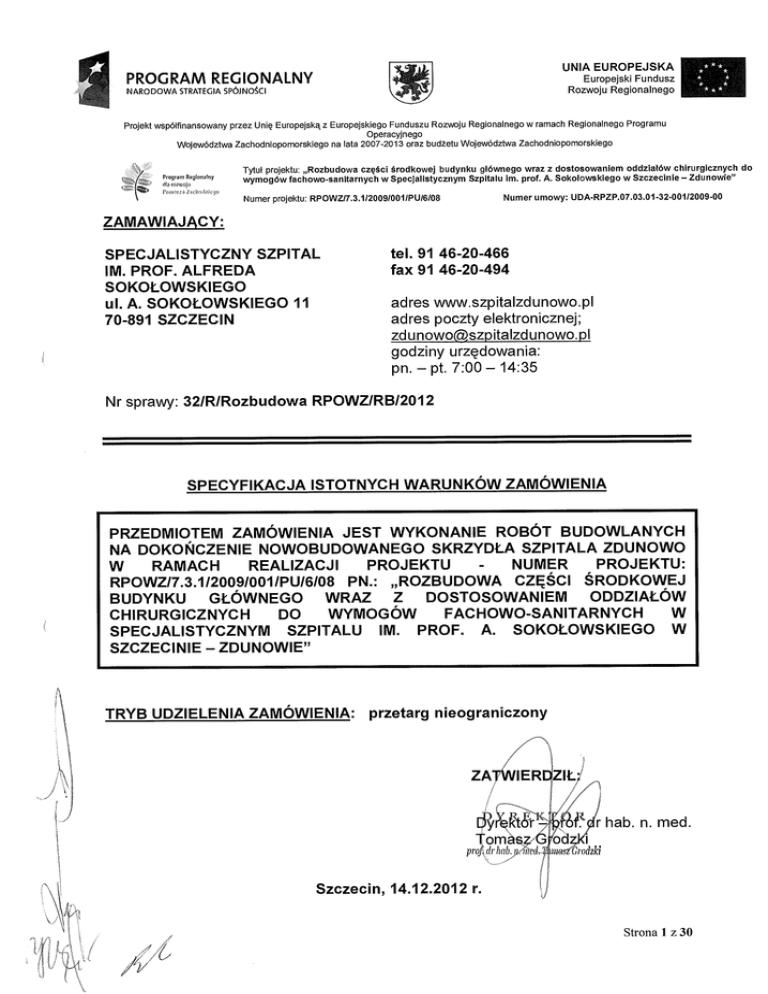 UNIA EUROPEJSKA PROGRAM REGIONALNY Europejski Fundusz Rozwoju Regionalnego NARODOWA STRATEGIA SPÓJNOŚCI Projekt wspólfinansowany przez Uni ę Europejską z Europejskiego Funduszu Rozwoju Regionalnego w ramach Regionalnego Programu Operacyjnego Województwa Zachodniopomorskiego na lata 2007-2013 oraz bud żetu Województwa Zachodniopomorskiego Program Reglonalny lonvM, Tytuł projektu: „Rozbudowa cz ęś ci ś rodkowej budynku g ł ównego wraz z dostosowaniem oddziatów chirurgicznych do wymogów fachowo-sanitarnych w Specjalistycznym Szpitalu im. prof. A. Soko łowskiego w Szczecinie — Zdunowle" ' Numer umowy: UDA-RPZP.07.03.01-32-001/2009-00 Numer projektu: RPOWZ/7.3.1/20091001/PU/6/08 ZAMAWIAJ ĄCY: SPECJALISTYCZNY SZPITAL IM. PROF. ALFREDA SOKOŁOWSKIEGO ul. A. SOKOŁOWSKIEGO 11 70-891 SZCZECIN tel. 91 46-20-466 fax 91 46-20-494 adres www.szpitalzdunowo.pl adres poczty elektronicznej; zdunowoszpitalzdunowo.bl godziny urzędowania: pn. — pt. 7:00 — 14:35 Nr sprawy: 32/R/Rozbudowa RPOWZ/RB/2012 SPECYFIKACJA ISTOTNYCH WARUNKÓW ZAMÓWIENIA PRZEDMIOTEM ZAMÓWIENIA JEST WYKONANIE ROBÓT BUDOWLANYCH NA DOKO Ń CZENIE NOWOBUDOWANEGO SKRZYDŁ A SZPITALA ZDUNOWO W RAMACH REALIZACJI PROJEKTU - NUMER PROJEKTU: RPOWZ/7.3.1/2009/001/PU/6/08 PN.: „ROZBUDOWA CZ ĘŚ CI Ś RODKOWEJ BUDYNKU GŁ ÓWNEGO WRAZ Z DOSTOSOWANIEM ODDZIA ŁÓW CHIRURGICZNYCH DO WYMOGÓW FACHOWO-SANITARNYCH W SPECJALISTYCZNYM SZPITALU IM. PROF. A. SOKO ŁOWSKIEGO W SZCZECINIE — ZDUNOWIE" TRYB UDZIELENIA ZAMÓWIENIA: przetarg nieograniczony kt8tj.L:IA. r hab n. med. toma-swGrodz proAdr hab.yirrd, T ,) ■,, (z Grodzki Szczecin, 14.12.2012 r. Strona 1 z 30 Spis treś ci SPIS TREŚ CI I. NAZWA I ADRES ZAMAWIAJĄCEGO II. TRYB UDZIELENIA ZAMÓWIENIA III. OPIS PRZEDMIOTU ZAMÓWIENIA IV. TERMIN WYKONANIA ZAMÓWIENIA V. WARUNKI UDZIAŁU W POST Ę POWANIU ORAZ OPIS SPOSOBU DOKONYWANIA OCENY 2 3 3 3 11 11 SPEŁ NIANIA TYCH WARUNKÓW WYKONAWCY W Ą DOSTARCZYĆ VI. WYKAZ O ŚWIADCZE Ń I DOKUMENTÓW, JAKIE MAJ 14 CELU POTWIERDZENIA SPEŁ NIANIA WARUNKÓW UDZIALU W POST Ę POWANIU VII. INFORMACJE 0 SPOSOBIE POROZUMIEWANIA SI Ę ZAMAWIAJ ĄCEGO Z WYKONAWCAMI ORAZ PRZEKAZYWANIA OŚWIADCZE Ń LUB DOKUMENTÓW, A TAKŻE WSKAZANIE OSÓB 17 UPRAWNIONYCH DO POROZUMIEWANIA SI Ę Z WYKONAWCAMI 18 VIII. WYMAGANIA DOTYCZĄCE WADIUM 19 IX. TERMIN ZWI ĄZANIA OFERTĄ 19 X. OPIS SPOSOBU PRZYGOTOWYWANIA OFERT 21 Xl. MIEJSCE ORAZ TERMIN SKŁADANIA I OTWARCIA OFERT 21 XII. OPIS SPOSOBU OBLICZENIA CENY XIII. OPIS KRYTERIÓW, KTÓRYMI ZAMAWIAJ ĄCY B Ę DZIE SI Ę KIEROWAŁ PRZY WYBORZE 23 OFERTY, WRAZ Z PODANIEM ZNACZENIA TYCH KRYTERIÓW I SPOSOBU OCENY OFERT XIV. INFORMACJA 0 FORMALNO Ś CIACH, JAKIE POWINNY ZOSTAĆ DOPEŁ NIONE PO WYBORZE OFERTY W CELU ZAWARCIA UMOWY W SPRAWIE ZAMÓWIENIA PUBLICZNEGO. 23 XVI. ISTOTNE DLA STRON POSTANOWIENIA, KTÓRE ZOSTANĄ WPROWADZONE DO TRE ŚCI 25 UMOWY W SPRAWIE ZAMÓWIENIA PUBLICZNEGO XVII. POUCZENIE 0 Ś RODKACH OCHRONY PRAWNEJ PRZYS ŁUGUJĄCYCH WYKONAWCY W 25 TOKU POST Ę POWANIA 0 UDZIELENIE ZAMÓWIENIA PUBLICZNEGO 26 XVIII. ZAŁĄCZNIKI DO SIWZ Strona 2 z 30 I. Nazwa i adres Zamawiaj ącego Specjalistyczny Szpital im. prof. Alfreda Sokołowskiego ul. A. Sokołowskiego 11, 70-891 Szczecin tel. 91 46-20-466 fax 91 46-20-494 adres www.szpitalzdunowo.pl adres poczty elektronicznej; zdunowoszpitalzdunowo.pl godziny urz ędowania: pn. — pt. 7:00 — 14:35 NIP: 955-16-94-463 REGON: 810978670-00027 NIP-jako podatnika VAT UE: PL 955-16-94-463 II. Tryb udzielenia zamówienia 1. Postę powanie o udzielenie zamówienia publicznego prowadzone jest w trybie przetargu nieograniczonego, na podstawie przepisów ustawy z dnia 29 stycznia 2004 r. - Prawo zamówie ń publicznych (t.j. Dz. U. z 2010 r. Nr 113, poz. 759, z pó ź n. zm .) [zwanej dalej tak że „pzp"]. 2. Warto ść zamówienia nie przekracza kwoty okre ślonej w przepisach wydanych na podstawie art. 11 ust. 8 pzp, t.j. 5 000 000,00 €. Ill. Opis przedmiotu zamówienia PRZEDMIOTEM ZAMÓWIENIA JEST WYKONANIE ROBÓT BUDOWLANYCH NA DOKO Ń CZENIE NOWOBUDOWANEGO SKRZYDŁ A SZPITALA ZDUNOWO W RAMACH REALIZACJI PROJEKTU - NUMER PROJEKTU: RPOWZ/7.3.1/2009/001/PU/6/08 PN.: „ROZBUDOWA CZ ĘŚCI Ś RODKOWEJ BUDYNKU GŁÓWNEGO WRAZ Z DOSTOSOWANIEM ODDZIAŁ ÓW CHIRURGICZNYCH DO WYMOGÓW FACHOWO-SANITARNYCH W SPECJALISTYCZNYM SZPITALU IM. PROF. A. SOKO ŁOWSKIEGO W SZCZECINIE — ZDUNOWIE" Zamawiaj ący dopuszcza możliwość złożenia oferty cz ęściowej. Wykonawca mo że złożyć oferty cz ęściowe na jedn ą lub wi ęcej części zamówienia. A. Podział zamówienia na CZOŚ Ci: Część I zamówienia: Wykonanie robót budowlanych na doko ńczenie w nowobudowanym skrzydle Szpitala Zdunowo w segmencie A zespo łu pomieszcze ń , o określonej sko ń czonej funkcji technologii medycznej z pełnym zapleczem, obejmuj ącego: 1) szpitalny oddzia ł ratunkowy o powierzchni u żytkowej 850 m 2 z krytym podjazdem dwustanowiskowym dla karetek w zespole pomieszcze ń : 1.1 kryty podjazd karetek, 1.2 rejestracja, 1.3 poczekalnia, 1.4 dekontaminacja, 1.5 obszar segregacji, 1.6 pokój operacyjno zabiegowy, 1.7 resuscytacja, 1.8 sala obserwacyjna, OIT, Strona 3 z 30 1.9 pokoje bada ń , 1.10 węzły sanitarne, pomieszczenia personelu, dy żurki, pomieszczenia magazynowe. 2) Zespół pomieszcze ń przynależnych do 3 bloków operacyjnych: 2.1 I PI ĘTRO blok operacyjny chirurgii: sala zabiegów chirurgii naczyniowej: angiograf; pokój wybudze ń (4 łózka), pomieszczenia towarzyszące ( ś luzy, przygotowanie lekarzy, przygotowanie pacjenta, magazyny, pokoje wypoczynkowe personelu), z zespołem pomieszcze ń towarzyszących 2.2 II PI ĘTRO blok operacyjny ortopedii -, pokój wybudze ń (6 łóżek), pomieszczenia towarzysz ące (ś luzyT magazyny, pokoje wypoczynkowe personelu), z zespo łem pomieszcze ń towarzysz ących 2.3 III PI ĘTRO blok operacyjny torakochirurgii (tworz ący część zabiegową Regionalnego Centrum Transplantologii Płuc); pokój wybudze ń 
