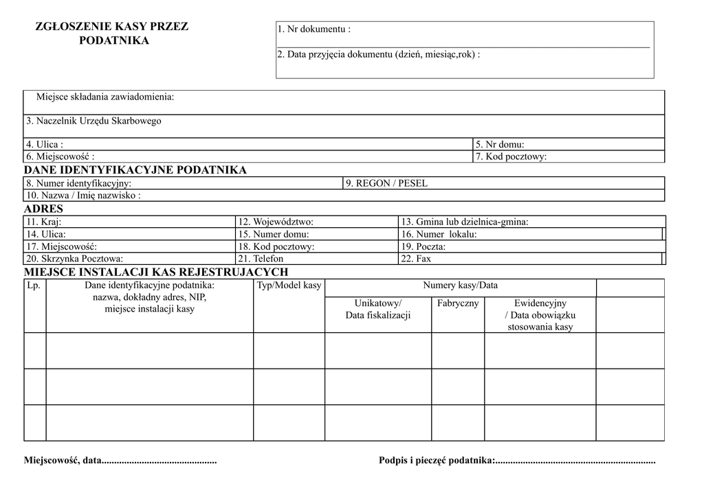 ZGŁOSZENIE KASY PRZEZ PODATNIKA 1. Nr dokumentu : _______________________________________________________________ 2. Data przyjęcia dokumentu (dzień, miesiąc,rok) : Miejsce składania zawiadomienia: 3. Naczelnik Urzędu Skarbowego 4. Ulica : 6. Miejscowość : 5. Nr domu: 7. Kod pocztowy: DANE IDENTYFIKACYJNE PODATNIKA 8. Numer identyfikacyjny: 10. Nazwa / Imię nazwisko : 9. REGON / PESEL ADRES 11. Kraj: 14. Ulica: 17. Miejscowość: 20. Skrzynka Pocztowa: 12. Województwo: 15. Numer domu: 18. Kod pocztowy: 21. Telefon 13. Gmina lub dzielnica-gmina: 16. Numer lokalu: 19. Poczta: 22. Fax MIEJSCE INSTALACJI KAS REJESTRUJACYCH Lp. Dane identyfikacyjne podatnika: nazwa, dokładny adres, NIP, miejsce instalacji kasy Miejscowość, data.............................................. Typ/Model kasy Numery kasy/Data Unikatowy/ Data fiskalizacji Fabryczny Ewidencyjny / Data obowiązku stosowania kasy Podpis i pieczęć podatnika:................................................................