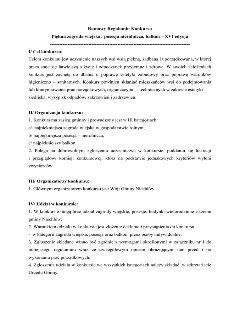 Ramowy Regulamin Konkursu Piękna zagroda wiejska, posesja nierolnicza, balkon – XVI edycja --------------------------------------------------------------------------------------I/ Cel konkursu: Celem konkursu jest uczynienie naszych wsi wsią piękną, zadbaną i uporządkowaną, w której praca staje się łatwiejszą a życie i odpoczynek przyjemne i zdrowe. W swoich założeniach konkurs jest zachętą do dbania o poprawę estetyki zabudowy oraz poprawę warunków higieniczno – sanitarnych. Konkurs powinien skłaniać mieszkańców wsi do podejmowania lub kontynuowania prac porządkowych, organizacyjno – technicznych w zakresie estetyki siedliska, wysypisk odpadów, zakrzewień i zadrzewień. II/ Organizacja konkursu: 1. Konkurs ma zasięg gminny i prowadzony jest w III kategoriach: a/ najpiękniejsza zagroda wiejska w gospodarstwie rolnym, b/ najpiękniejsza posesja – nierolnicza, c/ najpiękniejszy balkon. 2. Polega na dobrowolnym zgłoszeniu uczestnictwa w konkursie, poddaniu się lustracji i przeglądowi komisji konkursowej, która na podstawie jednakowych kryteriów wyłoni zwycięzców. III/ Organizatorzy konkursu: 1. Głównym organizatorem konkursu jest Wójt Gminy Niechlów. IV/ Udział w konkursie: 1. W konkursie mogą brać udział zagrody wiejskie, posesje, budynki wielorodzinne z terenu gminy Niechlów. 2. Warunkiem udziału w konkursie jest złożenie deklaracji przystąpienia do konkursu: - w kategorii zagroda wiejska, posesja oraz balkon przez osoby indywidualne. 3. Zgłoszenie składane winno być zgodnie z wymogami określonymi w załączniku nr 1 do niniejszego regulaminu wraz ze szczegółowym opisem obrazującym stan przed i po wykonaniu prac porządkowych. 4. Zgłoszenia udziału w konkursie we wszystkich kategoriach należy składać w sekretariacie Urzędu Gminy. 2 V/ Terminarz konkursu: Konkurs trwa przez okres obejmujący miesiące od lipca do sierpnia 2016 roku. 1. lipiec– zapowiedź konkursu, rozesłanie regulaminu do sołectw, rozpropagowanie wśród mieszkańców. 2. do 31 lipca– przyjmowanie zgłoszeń. 3. do 15 sierpnia – lustracja i ocena końcowa osiągniętych efektów działań zgłoszonych w deklaracji 4. 21 sierpnia – podsumowanie konkursu, ogłoszenie wyników i wręczenie nagród laureatom na dożynkach gminnych. VI/ Nagrody 1. Dla każdej kategorii przyznaje się nagrodę. 2. Komisja konkursowa ma prawo do nie przyznania 1 lub kolejnych nagród, lub do przyznania 2 nagród równorzędnych. VII/ Komisja konkursowa 1. Gminną Komisję Konkursową oraz jej Przewodniczącego powołuje Wójt Gminy. 2. Komisja składa się łącznie z 6 osób - z członków Komisji Rolnictwa Rady Gminy Niechlów, pracowników Urzędu Gminy Niechlów oraz członków Ośrodka Doradztwa Rolniczego. 3. W przypadku dużej ilości zgłoszeń komisję konkursową w czasie lustracji mogą reprezentować zespoły robocze pod przewodnictwem członka Gminnej Komisji Konkursowej. W czasie przeprowadzania lustracji komisji towarzyszy przedstawiciel wsi (sołtys, członek Rady Sołeckiej itp.) VIII/ Źródła finansowania 1. Środki przeznaczone na sfinansowanie konkursu pochodzą: a/ z budżetu gminy, IX/ Promocja wyników konkursu 1. Ogłoszenie wyników, osiągnięte cele konkursu będą popularyzowane w środkach masowego przekazu oraz w prasie lokalnej. 3 X/ Kryteria oceny balkonów w budynkach wielorodzinnych 1. Ogólne wrażenia estetyczne balkonu - 1-5 pkt. 2. Pomysłowość i oryginalność - 1-5 pkt. 3. Ukwiecenie i kompozycje roślinne - 1-5 pkt. 4. Ład, porządek , kolorystyka - 1-5 pkt. XI/ Kryteria oceny zagrody wiejskiej 1. Zabudowa, zagospodarowanie, wyraz architektoniczny obiektów i ich związek z tradycjami i kulturą regionu oraz wzajemne funkcjonalne powiązanie obiektów służących do prowadzenia gospodarstwa rolnego w tym w działach specjalnych. - 1 – 5 pkt. 2. Stan techniczny i estetyka zabudowań i budowli - 1 – 5 pkt. 3. Lokalizacja, zabezpieczenie i stan techniczny obiektów sanitarnych (szambo, śmietnik, kubły, gnojownik, kompostownia) - 1 – 5 pkt. 4. Estetyka zagospodarowania: a/ część gospodarcza – podwórze i ogrodzenie - 1 – 5 pkt. b/ część rekreacyjno – wypoczynkowa - 1 – 5 pkt. c/ część ogrodowa – warzywnik, sad - 1 – 5 pkt. d/ zadrzewienia, krzewy - 1 – 5 pkt. XII/ Kryteria oceny posesji nierolniczej 1. Zabudowa, zagospodarowanie, wyraz architektoniczny budynku mieszkalnego i gospodarczego – nawiązanie do ogólnego tradycyjnego stylu danej wsi – 1 – 5 pkt. 2. Stan techniczny i estetyka elewacji zewnętrznych oraz ogrodzeń - 1 – 5 pkt. 3. Mała architektura - 1 – 5 pkt. 4. Lokalizacja, stan techniczny, zabezpieczenie obiektów sanitarnych - 1 – 5 pkt. 5. Intensywność zadrzewień i krzewów w tym drzewa i krzewy owocowe - 1 – 5 pkt.