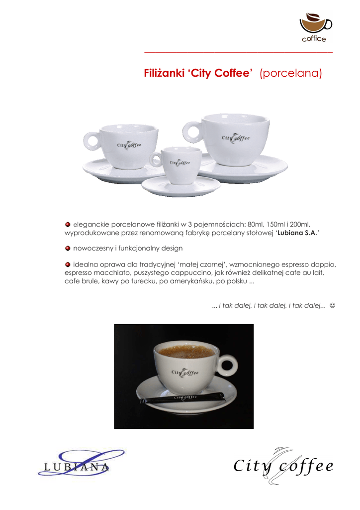 ___________________________________ Filiżanki ‘City Coffee’ (porcelana) eleganckie porcelanowe filiżanki w 3 pojemnościach: 80ml, 150ml i 200ml, wyprodukowane przez renomowaną fabrykę porcelany stołowej ‘Lubiana S.A.’ nowoczesny i funkcjonalny design idealna oprawa dla tradycyjnej ‘małej czarnej’, wzmocnionego espresso doppio, espresso macchiato, puszystego cappuccino, jak również delikatnej cafe au lait, cafe brule, kawy po turecku, po amerykańsku, po polsku ... ... i tak dalej, i tak dalej, i tak dalej... ☺