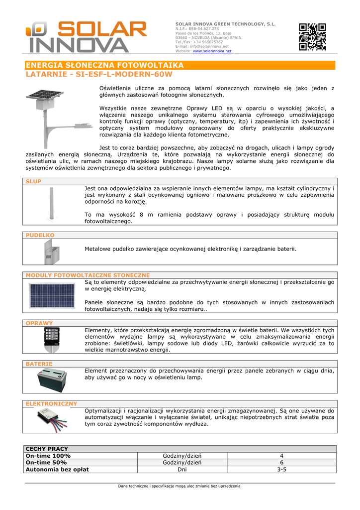 SOLAR INNOVA GREEN TECHNOLOGY, S.L. N.I.F.: ESB-54.627.278 Paseo de los Molinos, 12, Bajo 03660 – NOVELDA (Alicante) SPAIN Tel./Fax: +34 965075767 E-mail: [email protected] Website: www.solarinnova.net ENERGIA SŁONECZNA FOTOWOLTAIKA LATARNIE - SI-ESF-L-MODERN-60W Oświetlenie uliczne za pomocą latarni słonecznych rozwinęło się jako jeden z głównych zastosowań fotoogniw słonecznych. Wszystkie nasze zewnętrzne Oprawy LED są w oparciu o wysokiej jakości, a włączenie naszego unikalnego systemu sterowania cyfrowego umożliwiającego kontrolę funkcji oprawy (optyczny, temperatury, itp) i zapewnienia ich żywotność i optyczny system modułowy opracowany do oferty praktycznie ekskluzywne rozwiązania dla każdego klienta fotometryczne. Jest to coraz bardziej powszechne, aby zobaczyć na drogach, ulicach i lampy ogrody zasilanych energią słoneczną. Urządzenia te, które pozwalają na wykorzystanie energii słonecznej do oświetlania ulic, w ramach naszego miejskiego krajobrazu. Nasze lampy solarne służą jako rozwiązanie dla systemów oświetlenia zewnętrznego dla sektora publicznego i prywatnego. SLUP Jest ona odpowiedzialna za wspieranie innych elementów lampy, ma kształt cylindryczny i jest wykonany z stali ocynkowanej ogniowo i malowane proszkowo w celu zapewnienia odporności na korozję. To ma wysokość 8 m ramienia podstawy oprawy i posiadający strukturę modułu fotowoltaicznego. PUDELKO Metalowe pudełko zawierające ocynkowanej elektronikę i zarządzanie baterii. MODULY FOTOWOLTAICZNE STONECZNE Są to elementy odpowiedzialne za przechwytywanie energii słonecznej i przekształcenie go w energię elektryczną. Panele słoneczne są bardzo podobne do tych stosowanych w innych zastosowaniach fotowoltaicznych, nadaje się tylko rozmiaru.. OPRAWY Elementy, które przekształcają energię zgromadzoną w świetle baterii. We wszystkich tych elementów wydajne lampy są wykorzystywane w celu zmaksymalizowania energii zrobione: świetlówki, lampy sodowe lub diody LED, żarówki całkowicie wyrzucić za to wielkie marnotrawstwo energii. BATERIE Element przeznaczony do przechowywania energii przez panele zebranych w ciągu dnia, aby używać go w nocy w oświetleniu lamp. ELEKTRONICZNY Optymalizacji i racjonalizacji wykorzystania energii zmagazynowanej. Są one używane do automatyzacji włączanie i wyłączanie świateł, unikając niepotrzebnych strat światła poza tym coraz żywotność komponentów wydłuża. CECHY PRACY On-time 100% On-time 50% Autonomia bez opłat Godziny/dzień Godziny/dzień Dni Dane techniczne i specyfikacje mogą ulec zmianie bez uprzedzenia. 4 6 3-5 SOLAR INNOVA GREEN TECHNOLOGY, S.L. N.I.F.: ESB-54.627.278 Paseo de los Molinos, 12, Bajo 03660 – NOVELDA (Alicante) SPAIN Tel./Fax: +34 965075767 E-mail: [email protected] Website: www.solarinnova.net ENERGIA SŁONECZNA FOTOWOLTAIKA LATARNIE - SI-ESF-L-MODERN-60W POCZTA, WSPORNIK PANELU, BAZA KOLNIERZ Konstrukcja nośna Materialny Materialny Wysokość Grubość średnica Kołnierz podstawy Typ m mm mm mm Materialny Wątek Typ mm Cynk cynkowane ogniowo i malowane proszkowo Gatunek stali Q235 8 3,25 70-160 300 x 300 x 14 SRUBA Stal M18 x 4 OKABLOWANIE Materialny Sekcja Długość Typ mm m Miedź 2 x 2,5 6 PUDELKO Materialny Typ Rozmiar mm Stal ocynkowana powlekana sproszkowanego tworzywa sztucznego 329 x 172 x 221 PANEL FOTOWOLTAICZNY Ogniwa Moc maksymalna (Pmpp) Tolerancja Napięcie mocy maksymalnej (Vmpp) Natężenie mocy maksymalnej (Impp) Napięcie otwartego obwodu (Voc) Natężenie zwarciowe (Isc) Napięcie maksymalne systemu (Vsyst) Diody (By-pass) Bezpiecznik maksymalny w szeregu Sprawność (ηm) Współczynnik Formy Gwarancja Rozmiar Typ Wp Wp Wolty Ampery Wolty Ampery Wolty Ilość Ampery % % Lat mm Monokrystaliczne 90 0 ~ + 2,7 17,90 5,03 22,10 5,53 715 (IEC) 2 15 13,25 ≥ 73 12 1005 x 676 x 35 OSWIETLENIE Otaczać Rozmiar źródło światła Potęga Napięcia Strumień świetlny Temperatura otoczenia Długość życia Gwarancja Materialny mm Typ W Wolty Lm/W ºC Godziny Lat Aluminium/stal nierdzewna 350 x 166 x 174 Dioda LED o wysokiej jasności 60 24 90-110 - 25 ~ + 75 75000 2 BATERIA Technologia Rozmiar Prąd Napięcia Waga Długość życia Gwarancja Typ mm Ampery Wolty kg Lat Lat Żel (bez konserwacji) 329 x 172 x 221 80 12 20,7 8-10 2 ELEKTRONICZNY Regulacja mocy Prąd Napięcia Stopień zabezpieczenia Typ Ampery Wolty IP Dane techniczne i specyfikacje mogą ulec zmianie bez uprzedzenia. Optyczny i czasomierz 10 12 67