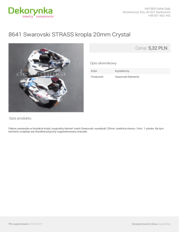 INFOBIS Rafał Głąb Mickiewicza 42a, 43-331 Dankowice +48 601 662 442 8641 Swarovski STRASS kropla 20mm Crystal Cena: 5,32 PLN Opis słownikowy Kolor krystaliczny Producent Swarovski Elements Opis produktu Piękna zawieszka w kształcie kropli, oryginalny kamień marki Swarovski, wysokość 20mm, średnica otworu 1mm. 1 sztuka. Na tym kamieńiu znajduje się charakterystyczny wygrawerowany znaczek. Plik wygenerowano: 07-03-2017 Oprogramowanie sklepu: AptusShop INFOBIS Rafał Głąb Mickiewicza 42a, 43-331 Dankowice +48 601 662 442 Galeria Plik wygenerowano: 07-03-2017 Powered by TCPDF (www.tcpdf.org) Oprogramowanie sklepu: AptusShop