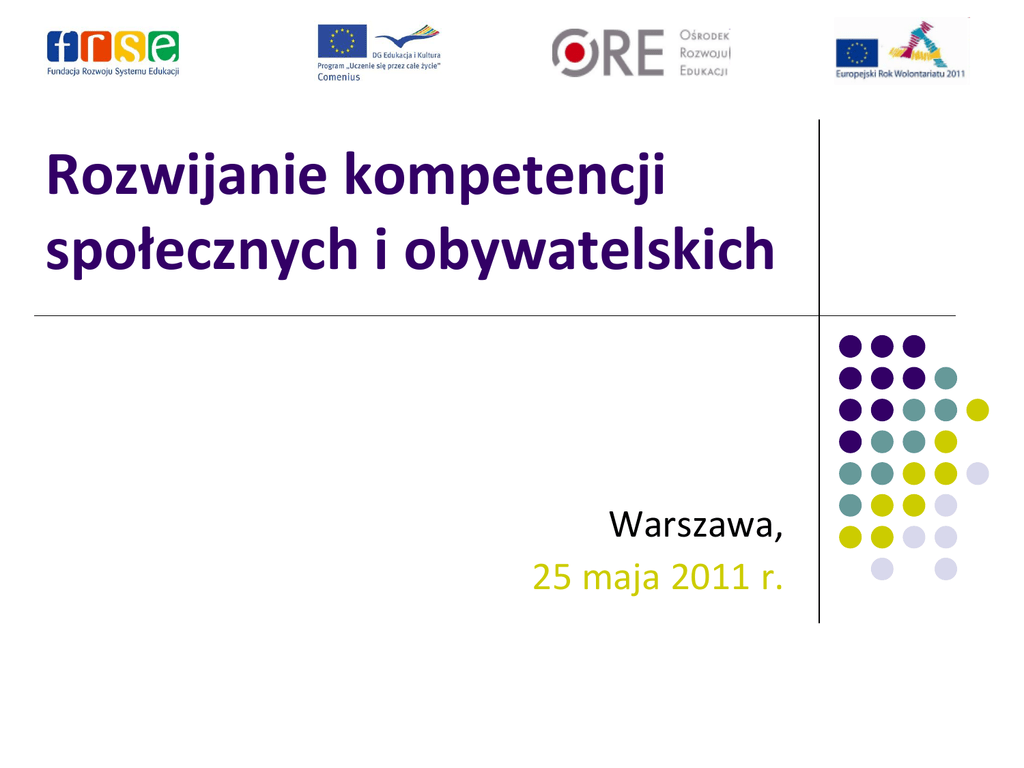 Rozwijanie kompetencji społecznych i obywatelskich Warszawa, 25 maja 2011 r. Nauczyciel, Wychowawca, Autorytet Przygotowanie kadry do zadań kształtowania kompetencji społecznych i obywatelskich dzięki uczestnictwu w Programie „Uczenie się przez całe życie” Prezentacja przykładów dobrej praktyki LLP przez SP 113 w Łodzi Adam Kubera, koordynator projektu Bożena Kołaczyńska, dyrektor szkoły Active Citizenship Aktywne obywatelstwo Wizyta Studyjna LLP, Rotterdam, 2010 r. Różne rozumienie aktywnego obywatelstwa w różnych krajach UE zróżnicowany profil instytucji uczestniczących w Wizycie Studyjnej odmienna sytuacja społeczno-ekonomiczna w różnych państwach i regionach Różne rozumienie aktywnego obywatelstwa w różnych krajach UE zróżnicowana struktura społeczeństw europejskich: monoa wielokulturowość różnice w strukturze systemów edukacji w Europie odmienne tradycje aktywności społecznej Przykłady odmiennych koncepcji na temat aktywnego obywatelstwa Holandia • edukacja w społecznościach wielokulturowych: Rotterdam – miasto ponad 160 narodowości • działania integracyjne, główny nacisk na naukę języków, niderlandzkiego oraz angielskiego Przykłady odmiennych koncepcji na temat aktywnego obywatelstwa Holandia • równe szanse uczestnictwa w życiu społecznym – w tym równy dostęp do edukacji – dla wszystkich społeczności • działania aktywizujące mniej aktywne społeczności Przykłady odmiennych koncepcji na temat aktywnego obywatelstwa Holandia • wczesne ukierunkowanie nauki, dopasowane do rynku pracy • wybór 4 typów szkół po zakończeniu nauki na poziomie podstawowym Przykłady odmiennych koncepcji na temat aktywnego obywatelstwa Finlandia • bezpłatne studia wyższe na wszystkich uczelniach – promowanie uczestnictwa społeczeństwa w edukacji wyższej Przykłady odmiennych koncepcji na temat aktywnego obywatelstwa Rumunia • aktywizacja uczestnictwa licznej społeczności romskiej w edukacji (bariera kulturowa i społeczna) Przykłady odmiennych koncepcji na temat aktywnego obywatelstwa Polska • • homogeniczna struktura społeczna znaczenie aktywności indywidualnej dla rozwoju aktywności instytucji w dziedzinie promowania aktywnego obywatelstwa Przykłady odmiennych koncepcji na temat aktywnego obywatelstwa Polska • kształtowanie postaw prospołecznych i proeuropejskich wśród środowisk związanych min. z edukacją i kulturą poprzez min. uczestnictwo w LLP Wpływ WS na kształtowanie kompetencji społecznych i obywatelskich u kadry • wymiana informacji i doświadczeń między uczestnikami spotkania dot. zarówno tematyki wizyty, jak również wielu innych zagadnień – skuteczna nauka od innych Wpływ WS na kształtowanie kompetencji społecznych i obywatelskich u kadry • • • • przeniesienie pozytywnych wzorów w zakresie aktywności społecznej do własnej instytucji, na własnych kolegów i współpracowników ‘zarażenie’ ich pozytywną energią, entuzjazmem, chęcią do działania rezultat: wzrost motywacji u części kadry do podejmowania działań edukacyjnych integrujących społeczność lokalną oraz do współpracy międzynarodowej zachęcenie kadry nauczycielskiej szkoły do aktywniejszego uczestnictwa w życiu naszej społeczności – min. poprzez bardziej aktywny udział w projekcie Comenius oraz projektach lokalnych Wpływ WS na kształtowanie kompetencji społecznych i obywatelskich u kadry • kontynuacja uczestnictwa w międzynarodowych projektach edukacyjnych (LLP), opracowanie i złożenie wniosku aplikacyjnego na uczestnictwo w kolejnym projekcie Comenius w roli koordynatora Wpływ WS na kształtowanie kompetencji społecznych i obywatelskich u kadry • kontakt z przedstawicielami innych narodowości, kultur, środowisk społeczno-zawodowych, reprezentujących wiele poglądów i punktów widzenia, posiadających różnorodną wiedzę i doświadczenie Wpływ WS na kształtowanie kompetencji społecznych i obywatelskich u kadry • • rezultat: niepowtarzalna okazja do rozwoju kompetencji społecznych, obywatelskich i interpersonalnych u uczestnika Wizyty Studyjnej wzbogacenie rozwoju osobowego na wielu płaszczyznach Wpływ WS na kształtowanie kompetencji społecznych i obywatelskich u kadry rozwój kompetencji zawodowych: nauczyciel – kształtowanie kompetencji dydaktycznych oraz pedagogiczno-wychowawczych dyrektor szkoły – kształtowanie kompetencji organizacyjno-kierowniczych • Wpływ WS na kształtowanie kompetencji społecznych i obywatelskich u kadry • rozwój kluczowych kompetencji LLP • • umiejętności komunikacji w języku obcym (angielskim - języku roboczym WS) kompetencji w zakresie TiK (praca nad raportem końcowym, komunikacja przez Internet, wyszukiwanie i przetwarzanie informacji dla potrzeb spotkania) Wpływ WS na kształtowanie kompetencji społecznych i obywatelskich u kadry • • otwarcie naszych umysłów i serc na ogromną spuściznę kulturowo-edukacyjną Europy rezultat: najlepsza lekcja tolerancji i szacunku dla innych kultur, opinii i poglądów Wpływ WS na kształtowanie kompetencji społecznych i obywatelskich u kadry • • przenoszenie tej lekcji na uczniów najważniejszych uczestników procesu edukacji rozwijanie postaw tolerancji i otwartości wśród młodego pokolenia - największy zysk dla społeczeństwa w dłuższej perspektywie Eco-Citizens of Common Europe Projekt Wielostronnego Partnerstwa Szkół Comenius, 16 szkół z 14 państw, Koordynator: SP 113 Łódź 2009-2011