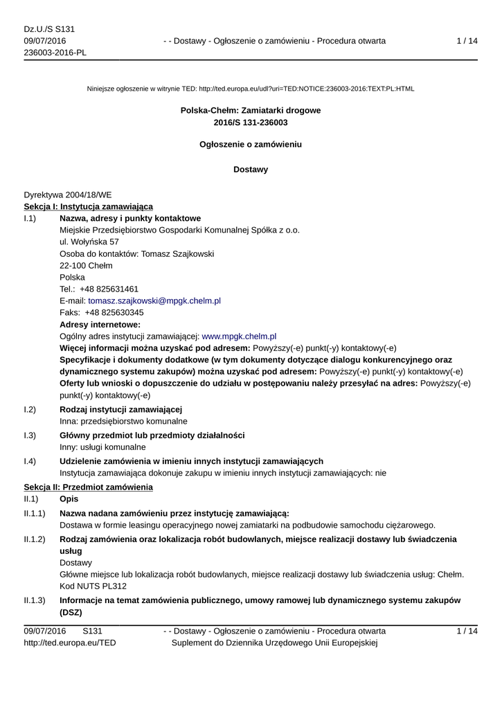 Dz.U./S S131 09/07/2016 236003-2016-PL - - Dostawy - Ogłoszenie o zamówieniu - Procedura otwarta 1 / 14 Niniejsze ogłoszenie w witrynie TED: http://ted.europa.eu/udl?uri=TED:NOTICE:236003-2016:TEXT:PL:HTML Polska-Chełm: Zamiatarki drogowe 2016/S 131-236003 Ogłoszenie o zamówieniu Dostawy Dyrektywa 2004/18/WE Sekcja I: Instytucja zamawiająca I.1) Nazwa, adresy i punkty kontaktowe Miejskie Przedsiębiorstwo Gospodarki Komunalnej Spółka z o.o. ul. Wołyńska 57 Osoba do kontaktów: Tomasz Szajkowski 22-100 Chełm Polska Tel.: +48 825631461 E-mail: [email protected] Faks: +48 825630345 Adresy internetowe: Ogólny adres instytucji zamawiającej: www.mpgk.chelm.pl Więcej informacji można uzyskać pod adresem: Powyższy(-e) punkt(-y) kontaktowy(-e) Specyfikacje i dokumenty dodatkowe (w tym dokumenty dotyczące dialogu konkurencyjnego oraz dynamicznego systemu zakupów) można uzyskać pod adresem: Powyższy(-e) punkt(-y) kontaktowy(-e) Oferty lub wnioski o dopuszczenie do udziału w postępowaniu należy przesyłać na adres: Powyższy(-e) punkt(-y) kontaktowy(-e) I.2) Rodzaj instytucji zamawiającej Inna: przedsiębiorstwo komunalne I.3) Główny przedmiot lub przedmioty działalności Inny: usługi komunalne I.4) Udzielenie zamówienia w imieniu innych instytucji zamawiających Instytucja zamawiająca dokonuje zakupu w imieniu innych instytucji zamawiających: nie Sekcja II: Przedmiot zamówienia II.1) Opis II.1.1) Nazwa nadana zamówieniu przez instytucję zamawiającą: Dostawa w formie leasingu operacyjnego nowej zamiatarki na podbudowie samochodu ciężarowego. II.1.2) Rodzaj zamówienia oraz lokalizacja robót budowlanych, miejsce realizacji dostawy lub świadczenia usług Dostawy Główne miejsce lub lokalizacja robót budowlanych, miejsce realizacji dostawy lub świadczenia usług: Chełm. Kod NUTS PL312 II.1.3) Informacje na temat zamówienia publicznego, umowy ramowej lub dynamicznego systemu zakupów (DSZ) 09/07/2016 S131 http://ted.europa.eu/TED - - Dostawy - Ogłoszenie o zamówieniu - Procedura otwarta Suplement do Dziennika Urzędowego Unii Europejskiej 1 / 14 Dz.U./S S131 09/07/2016 236003-2016-PL - - Dostawy - Ogłoszenie o zamówieniu - Procedura otwarta 2 / 14 II.1.4) Informacje na temat umowy ramowej II.1.5) Krótki opis zamówienia lub zakupu 1. Przedmiotem zamówienia jest dostawa w formie leasingu operacyjnego nowej zamiatarki na podbudowie samochodu ciężarowego, zwanej dalej „zamiatarką”. 1.1. Szczegółowy opis przedmiotu zamówienia zawiera załącznik nr 1 do SIWZ. 2. Wykonawca zobowiązuje się w terminie 2 dni roboczych od daty przekazania protokolarnego przedmiotu zamówienia przeszkolić 2 pracowników w zakresie obsługi i eksploatacji zamiatarki stanowiącej przedmiot niniejszego zamówienia oraz wystawić dokument potwierdzający udział pracowników zamawiającego w szkoleniu (czas szkolenia 5 godzin). 3. Wymagania dotyczące leasingu: 1) Waluta w polskich złotych. 2) Opłata wstępna stanowi: 10 % wartości brutto zamiatarki. 3) Okres leasingu: 48 miesięcy od daty protokołu zdawczo – odbiorczego. 4) Rodzaj rat leasingowych: 48 (miesięcznych) równych rat leasingowych w całym okresie obowiązywania umowy ze stałym oprocentowaniem. 5) Zamawiający zobowiązuje się do ubezpieczenia na swój koszt, przedmiotu leasingu przez cały okres realizacji umowy leasingu w zakresie ubezpieczenia OC, AC i NNW, ubezpieczenie nie stanowi składnika ceny. 6) Zamawiający zobowiązuje się do wykupu zamiatarki, w terminie 30 dni licząc od dnia płatności ostatniej raty leasingowej. 7) Wartość końcowa wykupu wyniesie: 1 % wartości brutto zamiatarki. Własność przedmiotu leasingu przechodzi z mocy umowny na zamawiającego jako korzystającego po zakończeniu umowy leasingu i uregulowaniu wszystkich należności z niej wynikających. Prawo własności zostanie przeniesione bez żadnych dodatkowych umów. 8) Zamawiający nie dopuszcza wprowadzania innych opłat niż opłata wstępna, opłata końcowa /za wykup/ i rata leasingowa, w szczególności nie wyraża zgody na wprowadzanie kaucji zabezpieczających, opłat przedwstępnych i innych. 4. Wszelkie koszty związane z zachowaniem zamiatarki w należytym stanie, oraz koszty eksploatacji ponosi zamawiający. 5. Inne koszty i opłaty niezbędne do realizacji zamówienia w szczególności związane z dostarczeniem przedmiotu zamówienia do siedziby zamawiającego, szkoleń oraz wydaniem wszystkich niezbędnych do eksploatacji dokumentów, wykonawca doliczy do raty leasingowej. 6. Zamawiający zobowiązany jest używać wyżej wymienioną zamiatarkę zgodnie z jej przeznaczeniem, w sposób nie powodujący obniżenia jej wartości, ponad normalne zużycie oraz uzgadniać z wykonawcą wszelkie modyfikacje. II.1.6) Wspólny Słownik Zamówień (CPV) 34921100 II.1.7) Informacje na temat Porozumienia w sprawie zamówień rządowych (GPA) Zamówienie jest objęte Porozumieniem w sprawie zamówień rządowych (GPA): nie II.1.8) Części To zamówienie podzielone jest na części: nie II.1.9) Informacje o ofertach wariantowych Dopuszcza się składanie ofert wariantowych: nie II.2) Wielkość lub zakres zamówienia 09/07/2016 S131 http://ted.europa.eu/TED - - Dostawy - Ogłoszenie o zamówieniu - Procedura otwarta Suplement do Dziennika Urzędowego Unii Europejskiej 2 / 14 Dz.U./S S131 09/07/2016 236003-2016-PL - - Dostawy - Ogłoszenie o zamówieniu - Procedura otwarta 3 / 14 II.2.1) Całkowita wielkość lub zakres: Przedmiotem zamówienia jest dostawa w formie leasingu operacyjnego nowej zamiatarki na podbudowie samochodu ciężarowego. Postępowanie prowadzone jest w trybie dla postępowań o wartości powyżej równowartości wyrażonej w złotych kwoty 209 000 EUR. II.2.2) Informacje o opcjach Opcje: nie II.2.3) Informacje o wznowieniach Jest to zamówienie podlegające wznowieniu: nie II.3) Czas trwania zamówienia lub termin realizacji Okres w miesiącach: 48 (od udzielenia zamówienia) Sekcja III: 