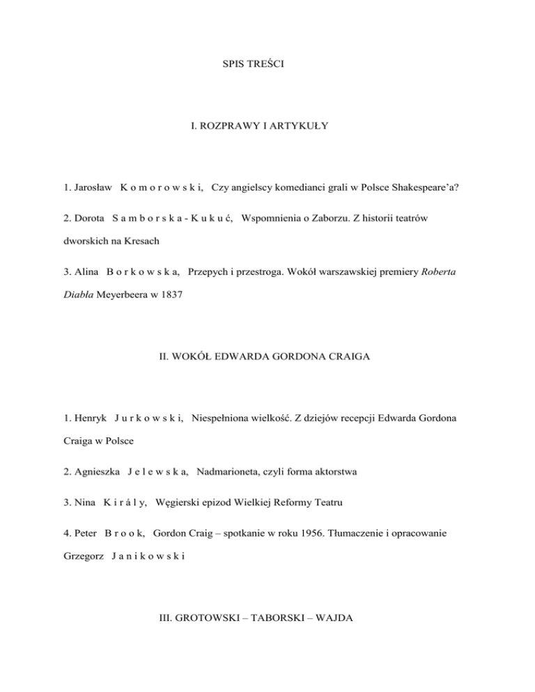 SPIS TREŚCI I. ROZPRAWY I ARTYKUŁY 1. Jarosław K o m o r o w s k i, Czy angielscy komedianci grali w Polsce Shakespeare’a? 2. Dorota S a m b o r s k a - K u k u ć, Wspomnienia o Zaborzu. Z historii teatrów dworskich na Kresach 3. Alina B o r k o w s k a, Przepych i przestroga. Wokół warszawskiej premiery Roberta Diabła Meyerbeera w 1837 II. WOKÓŁ EDWARDA GORDONA CRAIGA 1. Henryk J u r k o w s k i, Niespełniona wielkość. Z dziejów recepcji Edwarda Gordona Craiga w Polsce 2. Agnieszka J e l e w s k a, Nadmarioneta, czyli forma aktorstwa 3. Nina K i r á l y, Węgierski epizod Wielkiej Reformy Teatru 4. Peter B r o o k, Gordon Craig – spotkanie w roku 1956. Tłumaczenie i opracowanie Grzegorz J a n i k o w s k i III. GROTOWSKI – TABORSKI – WAJDA 1. Bolesław T a b o r s k i, Moja Grotowskiada, czyli dzieje nietypowej przyjaźni. Wspomnienia, listy, zapiski. Tłumaczenie Grzegorz J a n i a k 2. Zbigniew O s i ń s k i, Niezrealizowane projekty filmowe Andrzeja Wajdy o Teatrze Laboratorium. Korespondencja Wajdy ze Zbigniewem Cynkutisem i Jerzym Grotowskim z lat 1963–1964, 1970–1972 i 1975–1979 IV. FONOSYSTEM PRZEDSTAWIENIA TEATRALNEGO 1. Barbara P a b j a n, Specyfika fonosfery Teatru Laboratorium Jerzego Grotowskiego 2. Maciej G o ł ą b, Próba definicji fonosystemu przedstawienia teatralnego. Na przykłądzie TIS MW2 Bogusława Schaeffera V. Z ARCHIWUM 1. Halina W a s z k i e l, Hanna S z c z e p a ń s k a, Zosia Bogusławska i Agnieszka Rittendorff 2. Halina W a s z k i e l, Katarzyna z Fröhlichów Bogusławska 3. Wanda M o s s a k o w s k a, Nieznany wizerunek Leontyny Halpertowej 4. Z archiwum Mieczysława Kotlarczyka. Wybór dokumentów 1946–1978. Wybór i opracowanie Marzena K u r a ś VI. PRZEGLĄDY I RECENZJE 1. Międzynarodowy Festiwal Teatralny KONTAKT 1991–2003. Opracował Grzegorz J a n i kowski 2. Festiwal KONTAKT: poszukiwanie i dotykanie rzeczywistości. Z Jadwigą O l e r a d z k ą rozmawia Grzegorz J a n i k o w s k i 3. Henrik S j ö g r e n, Lek och raseri. Ingmar Bergmans teater 1938–2002, Stockholm 2002, ss. 464 (Tadeusz S z c z e p a ń s k i) 4. Jarosław K o m o r o w s k i, Piramida zbrodni. Makbet w kulturze polskiej 1790–1989, Warszawa 2002, ss. 344, il. (Agata A d a m i e c k a - S i t e k) VII. LISTY DO REDAKCJI 1. Roman T a b o r s k i Książki nadesłane 2002