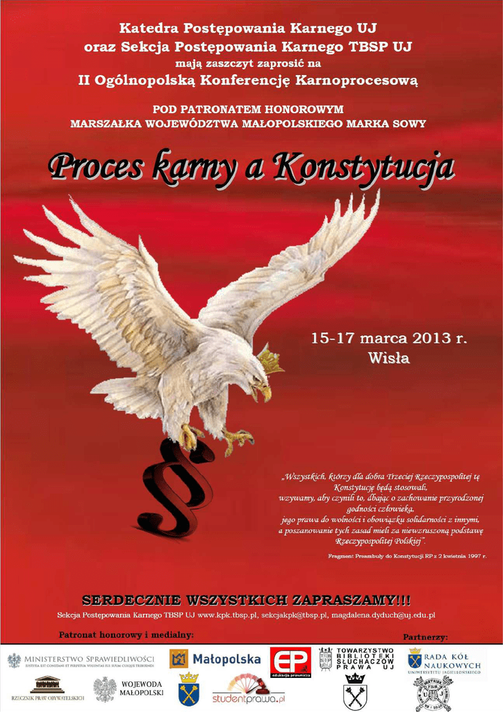Program II Ogólnopolskiej Konferencji Karnoprocesowej „Proces karny a Konstytucja” Wisła,15-17 marca 2013 r. Dzień I piątek, 15 marca 2013 r. 15.00 – wyjazd autokaru z Krakowa 18.00 – zakwaterowanie uczestników 19.00-20.00 – kolacja Dzień II sobota, 16 marca 2013 r. 8.00-8.45 – śniadanie 9.00 – otwarcie konferencji 9.15-9.45 – sala A dr Damian Gil – Sprzeciwy a konstytucyjna zasada kontroli orzeczeń mgr Agnieszka Sobecka – Kilka uwag na temat zgodności uprawnień zatrzymanego ze standardem konwencyjnym i konstytucyjnym mgr Ariel Falkiewicz – Raz jeszcze o potrzebie nowelizacji art. 55 Konstytucji (w świetle sprawy Melloni i zmian związanych z wejściem w życie TL) 9.45-10.00 – przerwa na kawę 10.00-10.40 (po 10 minut na prezentację zasadniczych tez każdego referatu) Panel I – sala A (dr hab. Jerzy Skorupka, prof. Uniwersytetu Wrocławskiego) Wojciech Steppa – Prokuratura w konstytucji apl. adw. Piotr Misztal – Instytucja tymczasowego aresztowania w świetle art. 31 Konstytucji RP mgr Aleksandra Beni – Czas trwania tymczasowego aresztowania apl. adw. Barbara Dziadek – Podsłuch procesowy jako instytucja ingerująca w sferę praw i wolności obywatelskich 1 Panel II – sala B (dr hab. Andrzej Światłowski, Uniwersytet Jagielloński) mgr Karolina Wieczorek – Wybrane problemy udziału czynnika społecznego w orzekaniu w procesie karnym w świetle Konstytucji RP Mateusz Filipczak, Hubert Kleszowski – Delegacja właściwości miejscowej sądu na podstawie art. 37 k.p.k. a instytucja wyłączenia sędziego Paweł Jan Słowik - Konsekwencje konstytucyjnego unormowania zasady domniemania niewinności w odniesieniu do odpowiedzialności podmiotu zbiorowego za czyn zabroniony od groźbą kary Panel III – sala C (dr hab. Barbara Nita, prof. Uczelni Łazarskiego) mgr Jakub Ławicki – Instytucja ekstradycji w kontekście art. 55 Konstytucji RP mgr Maciej Benderski – Konstytucyjny zakaz ekstradycji obywateli polskich a współpraca z Międzynarodowym Trybunałem Karnym mgr Ewelina Kusowska – Realizacja prawa stron do inicjatywy dowodowej jako przejaw sprawiedliwości proceduralnej 10.45-11.45 – dyskusja 11.45-17.15 – czas wolny 17.15-18.00 (po 10 minut na prezentację zasadniczych tez każdego referatu) Panel IV – sala A (dr hab. Hanna Paluszkiewicz, prof. Uniwersytetu im. Adama Mickiewicza w Poznaniu) mgr Joanna Pawlik-Czyniewska – Konstytucyjne i procesowe ochrona dziecka- świadka w postępowaniu karnym mgr Katarzyna Miszograj – Prawa dziecka w postępowaniu karnym mgr Jan Karol Szczepański – Konstytucja RP a wpływ wszczęcia postępowania karnoskarbowego na przedawnienie zobowiązania podatkowego apl. adw. Michał Jerzy Skorupka – Odpowiedzialność odszkodowawcza Skarbu Państwa za bezprawne tymczasowe aresztowanie, a odpowiedzialność Skarbu Państwa za niewątpliwie niesłuszne tymczasowe aresztowanie Panel V – sala B (Sędzia Trybunału Konstytucyjnego Wojciech Hermeliński) apl. radc. Aneta Makowiec – Zagadnienia konstytucyjne europejskiego nakazu aresztowania w Polsce 2 mgr Paweł Nowak – Zasady porozumiewania się zatrzymanego z adwokatem oraz tymczasowo aresztowanego z obrońcą w kodeksie postępowania karnego w aspekcie konstytucyjnym oraz prawnomiędzynarodowym mgr Magdalena Wardas – Konflikt pomiędzy prawem do obrony a ochroną dobrego imienia osób trzecich. Gdzie jest granica? mgr Małgorzata Gorczyńska-Rolka – Prawo zatrzymanego tymczasowo aresztowanego do swobodnego kontaktowania się z obrońcą jako forma realizacji prawa do obrony Panel VI – sala C (dr hab. Krzysztof Woźniewski, prof. Uniwersytetu Gdańskiego) mgr Anna Drozd – O sądowej kontroli powtórnego postanowienia o zaniechaniu ścigania przez pryzmat gwarancji konstytucyjnych – uwagi na przedpolu skargi subsydiarnej Paweł Tobiczyk – Prawne możliwości ustalenia tożsamości sprawcy naruszającego prawo na forum internetowym a prawo do prywatności i anonimowości. Perspektywa karnoprocesowa mgr Magdalena Błaszyk – Mediacja w postępowaniu karnym na tle zasad procesu karnego i zasad konstytucyjnych mgr Martyna Kusak – Czynności operacyjno-rozpoznawcze a gwarancje konstytucyjne jednostki 18.00-19.00 – dyskusja 19.30 – ognisko Dzień III niedziela, 17 marca 2013 r. 8.30-9.15 – śniadanie 9.30-10.30 – podsumowanie obrad (po 10 minut na zwięzłe omówienie dyskusji w każdym z paneli) 10.30-11.00 – przerwa na kawę 11.00-13.00 – dyskusja 13.00 – podsumowanie dyskusji i zamknięcie konferencji 14.00 – obiad 15.00 – wyjazd uczestników, odjazd autokaru do Krakowa 3