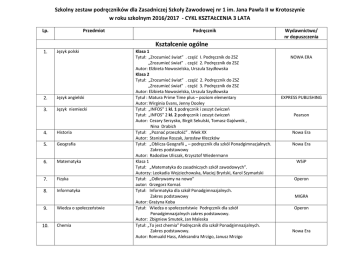 Szkolny zestaw podręczników dla Zasadniczej Szkoły Zawodowej nr 1 im. Jana Pawła II w Krotoszynie w roku szkolnym 2016/2017 - CYKL KSZTAŁCENIA 3 LATA Lp. Przedmiot Podręcznik Wydawnictwo/ nr dopuszczenia Kształcenie ogólne 1. Język polski 2. Język angielski 3. Język niemiecki 4. Historia 5. Geografia 6. Matematyka 7. Fizyka 8. Informatyka 9. Wiedza o społeczeństwie 10. Chemia Klasa 1 Tytuł: „Zrozumieć świat” . część I. Podręcznik do ZSZ „Zrozumieć świat” . część 2. Podręcznik do ZSZ Autor: Elżbieta Nowosielska, Urszula Szydłowska Klasa 2 Tytuł: „Zrozumieć świat” . część 2. Podręcznik do ZSZ „Zrozumieć świat” . część 3. Podręcznik do ZSZ Autor: Elżbieta Nowosielska, Urszula Szydłowska Tytuł : Matura Prime Time plus – poziom elementary Autor: Wirginia Evans, Jenny Dooley Tytuł: „INFOS” 1 kl. 1 podręcznik i zeszyt ćwiczeń Tytuł: „INFOS” 2 kl. 2 podręcznik i zeszyt ćwiczeń Autor: Cezary Serzysko, Birgit Sekulski, Tomasz Gajównik , Nina Drabich Tytuł: „Poznać przeszłość” . Wiek XX Autor: Stanisław Roszak, Jarosław Kłeczków Tytuł: „Oblicza Geografii „ – podręcznik dla szkól Ponadgimnazjalnych. Zakres podstawowy Autor: Radosław Uliszak, Krzysztof Wiedermann Klasa 1 Tytuł: „Matematyka do zasadniczych szkół zawodowych”. Autorzy: Leokadia Wojciechowska, Maciej Bryński, Karol Szymański Tytuł: „Odkrywamy na nowo” autor: Grzegorz Kornaś Tytuł: Informatyka dla szkół Ponadgimnazjalnych. Zakres podstawowy Autor: Grażyna Koba Tytuł: Wiedza o społeczeństwie Podręcznik dla szkół Ponadgimnazjalnych zakres podstawowy. Autor: Zbigniew Smutek, Jan Maleska Tytuł: „To jest chemia” Podręcznik dla szkół Ponadgimnazjalnych. Zakres podstawowy. Autor: Romuald Hass, Aleksandra Mrzigo, Janusz Mrzigo NOWA ERA EXPRESS PUBLISHING Pearson Nowa Era Nowa Era WSiP Operon MIGRA Operon Nowa Era Lp. 11. Biologia 12. 13. Edukacja dla bezpieczeństwa do klasy 1 i 2 Podstawy przedsiębiorczości 14. Religia Przedmiot Tytuł: Biologia na czasie dla szkół ponadgimnazjalnych. Zakres podstawowy Autor: Emilia Bonar, Weronika Krzeszowiec-Jeleń, Stanisław Czachorowski Tytuł: Żyję i działam bezpiecznie Autor: Jarosław Słoma Tytuł: „Podstawy przedsiębiorczości” Ciekawi świata Autor: Piotr Krzyszczyk Kl.1 Tytuł: „W Blasku Bożej Prawdy” Autor: Tadeusz Śmiech, Elżbieta Kondrak Kl.2 Tytuł: „Na Drogach Wiary” Autor: Jarosław Czerkawski, Elżbieta Kondrak, Bogusław Nosek Kl.3 Tytuł: „ Za Progiem Nadziei” Autor: Sławomir Mazur, Bogusław Nosek, Kamila Rokosz Podręcznik Wydawnictwo/ nr dopuszczenia Kształcenie zawodowe Fryzjer 1. Materiały fryzjerskie Kl.1,2,3 2. Higiena Kl.1,2,3 3. Stylizacja 4. Technologia fryzjerstwa tytuł: Nowoczesne fryzjerstwo – chemia technologia techniki autor: I. Suligowska, M. Suligowska, Z. Sumirska, M. Kostrzewska Tytuł: Higiena. Podręcznik przeznaczony do nauki zawodu fryzjer w zasadniczej szkole zawodowej i szkole policealnej Tytuł: Bezpieczeństwo i higiena pracy w zawodzie fryzjer Autor: Zuzana Sumirska Tytuł: Podstawy fryzjerskie Autor: Teresa Kulikowska-Jakubik, Małgorzata Richter tytuł: Techniki Fryzjerskie – pielęgnacja włosów ( kwalifikacja A.19. ) klasa. 1 Techniki fryzjerskie – strzyżenie włosów, formowanie fryzur, ondulowania ( kwalifikacja A.19.) klaa 2 Techniki fryzjerskie – zmiany koloru włosów ( kwalifikacja A.19. ) klasa 3 autor: Teresa Kulikowska-Jakubik, Małgorzata Richter „SUZI” REA „SUZI” WSiP „WSiP” Nowa Era Nowa Era OPERON Jedność Kielce 2012 Jedność Kielce 2013 Jedność Kielce 2014 Uwagi Kucharz 1. Podstawy żywienia Klasa 1, 2 tytuł: „Zasady żywienia” autor: Ewa Superczyńska, Melania Żylińska-Kaczmarek REA 2. Technologia gastronomiczna z towaroznawstwem Klasa 1, 2, 3 Tytuł: Sporządzanie potraw i napojów. Towaroznawstwo i przechowywanie żywności” autor: Anna Kmiołek Tytuł: Sporządzanie i ekspedycja potraw i napojów. część 1 i 2 Technologia gastronomiczna. autor: Anna Kmiołek WSiP 3. Pracownia gastronomiczna Wyposażenie zakładów gastronomicznych Klasa 1, 2, 3 Tytuł: „Pracownia gastronomiczna. Praktyczna nauka zawodu” Autor: Anna Kmiołek Tytuł: Gastronomia – tom I, „Wyposażenie i zasady bezpieczeństwa w gastronomii” Autor: Agnieszka Kasperek, Marzanna Kandratowicz Tytuł: „Sporządzanie i ekspedycja potraw i napojów” część 3. „Wyposażenie zakładów gastronomicznych” Autor: Marzanna Zienkiewicz. Tytuł: Gastronomia. Tom. III. Działalność gospodarcza w gastronomii Autor: Hanna Górska – Warsewicz, Beata Sawicka, Teresa Mikulska 4. 5. Podstawy działalności w gastronomii kl.3 WSiP WSiP Operator obrabiarek skrawających kl. 1,2,3 1. 1. Podstawy konstrukcji maszyn. 2. Maszynoznawstwo. 3.Technologia Tytuł: Rysunek zawodowy dla mechanika Autor : Tadeusz Lewandowski Tytuł: „Podstawy technologii maszyn Autor: Józef Zawora Tytuł: „Maszynoznawstwo” Autor: Jan Kijewski Tytuł: Podstawy elektrotechniki i elektroniki Autor: P. Fudowiak Tytuł: Poradnik mechanik – tom 1 i 2 Tytuł: Obróbka na obrabiarkach skrawających, Skrawania i narzędzia Autor: W.Brodowicz Tytuł: Technologia ogólna Autor: Aleksander Górecki Tytuł: Technologia mechaniczna Autor: Aleksander Górecki WSiP Sprzedawca 1. Sprzedaż towarów Kl. 1, 2, 3 tytuł: Obsługa klienta. Prowadzenie sprzedaży. tom 3 autor: Donata Andrzejczak, Agnieszka Mikina, Autor: Iwona Wielgosik 2. Towaroznawstwo 3. Podstawy działalności handlowej Tytuł: Towar jako przedmiot handlu Prowadzenie sprzedaży – tom 1 Autor: Iwona Wielgosik tytuł: Przedsiębiorca w handlu. Prowadzenie sprzedaży – Tom 4 autor: Krystyna Strzelecka – kl. 1, 2, 3 4. Pracownia sprzedaży 5. Organizacja sprzedaży Tytuł: Pracownia sprzedaży Autor: Małgorzata Pańczyk Tytuł: „Organizacja i techniki sprzedaży”. Prowadzenie sprzedaży – tom 2 Autor: Elżbieta Strzyżewska, Iwona Wielgosi