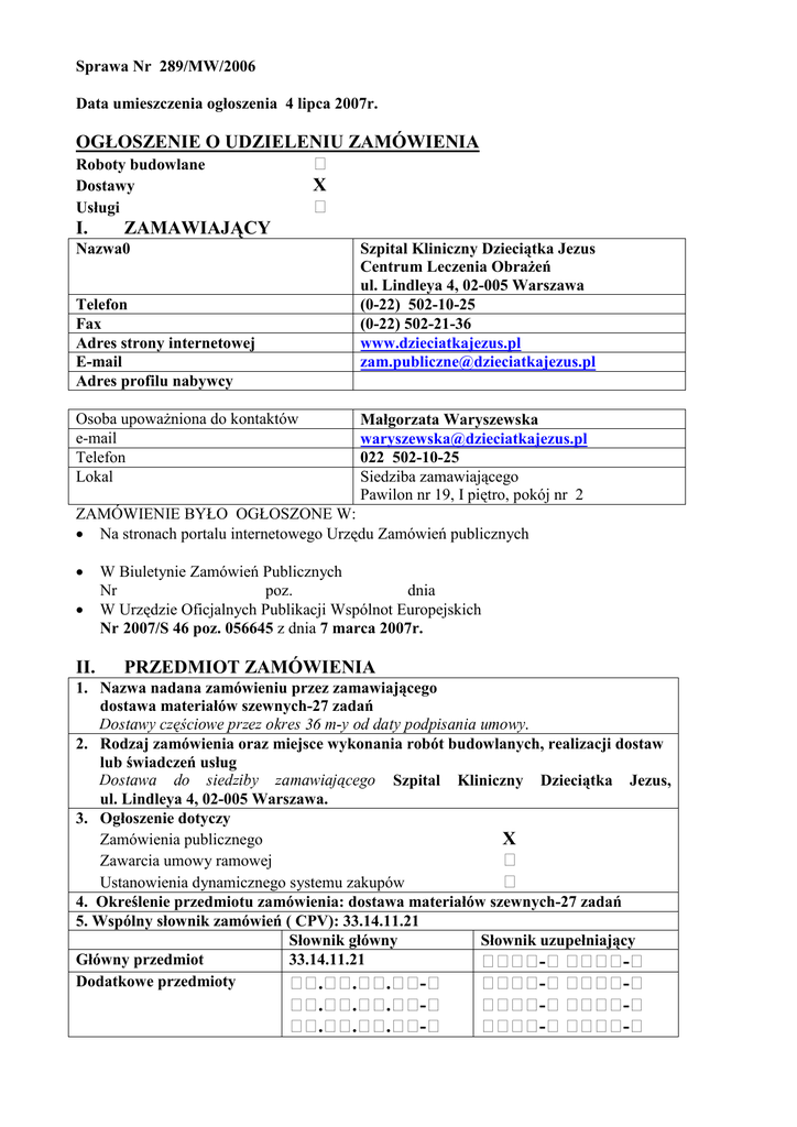 Sprawa Nr 289/MW/2006 Data umieszczenia ogłoszenia 4 lipca 2007r. OGŁOSZENIE O UDZIELENIU ZAMÓWIENIA Roboty budowlane Dostawy Usługi I. X ZAMAWIAJĄCY Nazwa0 Szpital Kliniczny Dzieciątka Jezus Centrum Leczenia Obrażeń ul. Lindleya 4, 02-005 Warszawa (0-22) 502-10-25 (0-22) 502-21-36 www.dzieciatkajezus.pl [email protected] Telefon Fax Adres strony internetowej E-mail Adres profilu nabywcy Osoba upoważniona do kontaktów e-mail Telefon Lokal Małgorzata Waryszewska [email protected] 022 502-10-25 Siedziba zamawiającego Pawilon nr 19, I piętro, pokój nr 2 ZAMÓWIENIE BYŁO OGŁOSZONE W: • Na stronach portalu internetowego Urzędu Zamówień publicznych • • W Biuletynie Zamówień Publicznych Nr poz. dnia W Urzędzie Oficjalnych Publikacji Wspólnot Europejskich Nr 2007/S 46 poz. 056645 z dnia 7 marca 2007r. II. PRZEDMIOT ZAMÓWIENIA 1. Nazwa nadana zamówieniu przez zamawiającego dostawa materiałów szewnych-27 zadań 2. Rodzaj zamówienia oraz miejsce wykonania robót budowlanych, realizacji dostaw lub świadczeń usług Szpital Kliniczny Dzieciątka Jezus, ul. Lindleya 4, 02-005 Warszawa. 3. Ogłoszenie dotyczy Zamówienia publicznego X Zawarcia umowy ramowej Ustanowienia dynamicznego systemu zakupów 4. Określenie przedmiotu zamówienia: dostawa materiałów szewnych-27 zadań 5. Wspólny słownik zamówień ( CPV): 33.14.11.21 Słownik główny Słownik uzupełniający Główny przedmiot 33.14.11.21 Dodatkowe przedmioty . . . . . . . . . - - - 2 III. PRPCEDURA TRYB UDZIELENIA ZAMÓWIENIA Rodzaj procedury Przetarg nieograniczony Przetarg ograniczony Negocjacje z ogłoszeniem Dialog konkurencyjny IV. X Negocjacje bez ogłoszenia Zamówienie z wolnej ręki Zapytanie o cenę Licytacja elektroniczna UDZIELENIE ZAMÓWIENIA CZĘŚĆ NR NAZWA 3 (pakiet nr 3) szew syntetyczny, pleciony, powlekany, wchłanialny z kwasu poliglikolowego 1. Data udzielnie zamówienia: 22/06/2007 2. Liczba otrzymanych ofert : 2 3. Nazwa i adres wykonawcy, któremu udzielono zamówienia Nazwa „TYCO POLSKA” Sp. z o.o. Adres pocztowy Al. Jerozolimskie 162 Miejscowość: Kod pocztowy: Kraj/województwo: Warszawa 02-342 Polska/mazowieckie Informacja o cenie wybranej oferty oraz o niepodlegających odrzuceniu ofertach z najtańszą i najdroższą ceną ( z VAT) Cena wybranej oferty 606.851,28 Oferta z najniższą ceną Waluta: PLN 606.851,28 Oferta z najwyższą ceną 606.851,28 CZĘŚĆ NR 4 (pakiet nr 4) NAZWA szew syntetyczny, monofilamentowy, wchłanialny 1. Data udzielnie zamówienia: 22/06/2007 2. Liczba otrzymanych ofert : 2 3. Nazwa i adres wykonawcy, któremu udzielono zamówienia Nazwa „AESCULAP CHIFA” Sp. z o.o. Adres pocztowy ul. Tysiąclecia 14 Miejscowość: Kod pocztowy: Kraj/województwo: Nowy Tomyśl 64-300 Polska/wielkopolskie Informacja o cenie wybranej oferty oraz o niepodlegających odrzuceniu ofertach z najtańszą i najdroższą ceną ( z VAT) Cena wybranej oferty 95.964,48 Oferta z najniższą ceną Waluta: PLN 95.964,48 Oferta z najwyższą ceną 95.964,48 3 5 (pakiet nr 5) szew syntetyczny, pleciony, powlekany, wchłanialny, z mieszaniny kwasu poliglikolowego i polimlekowego 1. Data udzielnie zamówienia: 22/06/2007 2. Liczba otrzymanych ofert : 1 3. Nazwa i adres wykonawcy, któremu udzielono zamówienia Nazwa „TYCO POLSKA” Sp. z o.o. Adres pocztowy Al. Jerozolimskie 162 Miejscowość: Kod pocztowy: Kraj/województwo: Warszawa 02-342 Polska/mazowieckie Informacja o cenie wybranej oferty oraz o niepodlegających odrzuceniu ofertach z najtańszą i najdroższą ceną ( z VAT) Cena wybranej oferty 221.778,00 CZĘŚĆ NR NAZWA Oferta z najniższą ceną 221.778,00 Oferta z najwyższą ceną 221.778,00 Waluta: PLN CZĘŚĆ NR 6 (pakiet nr 6) NAZWA szew syntetyczny, wchłanialny, pleciony 1. Data udzielnie zamówienia: 22/06/2007 2. Liczba otrzymanych ofert : 1 3. Nazwa i adres wykonawcy, któremu udzielono zamówienia Nazwa „AESCULAP CHIFA” Sp. z o.o. Adres pocztowy ul. Tysiąclecia 14 Miejscowość: Kod pocztowy: Kraj/województwo: Nowy Tomyśl 64-300 Polska/wielkopolskie Informacja o cenie wybranej oferty oraz o niepodlegających odrzuceniu ofertach z najtańszą i najdroższą ceną ( z VAT) Cena wybranej oferty 9.804,48 Oferta z najniższą ceną 9.804,48 Oferta z najwyższą ceną 9.804,48 Waluta: PLN CZĘŚĆ NR 7 (pakiet nr 7) NAZWA szew syntetyczny, jednowłóknowy, wchłanialny z poliglokonatu 1. Data udzielnie zamówienia: 22/06/2007 2. Liczba otrzymanych ofert : 1 3. Nazwa i adres wykonawcy, któremu udzielono zamówienia Nazwa „TYCO POLSKA” Sp. z o.o. Adres pocztowy Al. Jerozolimskie 162 Miejscowość: Kod pocztowy: Kraj/województwo: Warszawa 02-342 Polska/mazowieckie Informacja o cenie wybranej oferty oraz o niepodlegających odrzuceniu ofertach z najtańszą i najdroższą ceną ( z VAT) Cena wybranej oferty 310.045,20 Oferta z najniższą ceną Waluta: PLN 310.045,20 Oferta z najwyższą ceną 310.045,20 4 CZĘŚĆ NR 8 (pakiet nr 8) NAZWA szew syntetyczny, jednowłóknowy, wchłanialny z poliglitonu 1. Data udzielnie zamówienia: 22/06/2007 2. Liczba otrzymanych ofert : 1 3. Nazwa i adres wykonawcy, któremu udzielono zamówienia Nazwa „TYCO POLSKA” Sp. z o.o. Adres pocztowy Al. Jerozolimskie 162 Miejscowość: Kod pocztowy: Kraj/województwo: Polska/mazowieckie Warszawa 02-342 Informacja o cenie wybranej oferty oraz o niepodlegających odrzuceniu ofertach z najtańszą i najdroższą ceną ( z VAT) Cena wybranej oferty 67.446,00 Oferta z najniższą ceną 67.446,00 Oferta z najwyższą ceną 67.446,00 Waluta: PLN CZĘŚĆ NR 9 (pakiet nr 9) NAZWA szew syntetyczny, jednowłóknowy, wchłanialny z glikomeru 1. Data udzielnie zamówienia: 22/06/2007 2. Liczba otrzymanych ofert : 1 3. Nazwa i adres wykonawcy, któremu udzielono zamówienia Nazwa „TYCO POLSKA” Sp. z o.o. Adres pocztowy Al. Jerozolimskie 162 Miejscowość: Kod pocztowy: Kraj/województwo: Warszawa 02-342 Polska/mazowieckie Informacja o cenie wybranej oferty oraz o niepodlega