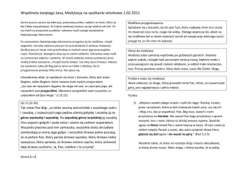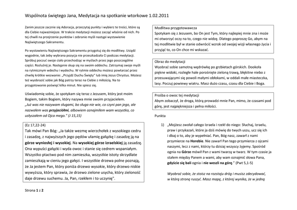 Wspólnota świętego Jana, Medytacja na spotkanie wtorkowe 1.02.2011 Zanim jeszcze zacznie się Adoracja, przeczytaj punkty i wybierz te treści, które są dla Ciebie najważniejsze. W trakcie medytacji możesz zacząć właśnie od nich. Po tej chwili na przejrzenie punktów i zebranie myśli nastąpi wystawienie Najświętszego Sakramentu. Po wystawieniu Najświętszego Sakramentu przygotuj się do modlitwy. Usiądź wygodnie, tak żeby wybrana pozycja nie przeszkadzała Ci podczas medytacji. Spróbuj poczuć swoje ciało przechodząc w myślach przez jego poszczególne części. Rozluźnij je. Następnie skup się na swoim oddechu. Zatrzymaj swoje myśli na rytmicznym wdechu i wydechu. W rytmie oddechu możesz powtarzać przez chwilę krótkie wezwanie: „Przyjdź Duchu Święty” lub imię Jezus Chrystus. Możesz też wyobrazić sobie jak Bóg patrzy teraz na Ciebie z miłością. Na to przygotowanie poświęć kilka minut. Nie spiesz się. Uświadomię sobie, że spotykam się teraz z Jezusem, który jest moim Bogiem, takim Bogiem, który nazywa mnie swoim przyjacielem. „Już was nie nazywam sługami, bo sługa nie wie, co czyni pan jego, ale nazwałem was przyjaciółmi, albowiem oznajmiłem wam wszystko, co usłyszałem od Ojca mego.” (J 15,15) (Ez 17,22-24) Tak mówi Pan Bóg: „Ja także wezmę wierzchołek z wysokiego cedru i zasadzę, z najwyższych jego pędów ułamię gałązkę i zasadzę ją na górze wyniosłej i wysokiej. Na wysokiej górze izraelskiej ją zasadzę. Ona wypuści gałązki i wyda owoc i stanie się cedrem wspaniałym. Wszystko ptactwo pod nim zamieszka, wszystkie istoty skrzydlate zamieszkają w cieniu jego gałęzi. I wszystkie drzewa polne poznają, że Ja jestem Pan, który poniża drzewo wysokie, który drzewo niskie wywyższa, który sprawia, że drzewo zielone usycha, który zieloność daje drzewu suchemu. Ja, Pan, rzekłem i to uczynię". Strona 1 z 2 Modlitwa przygotowawcza Spotykam się z Jezusem, bo On jest Tym, który najlepiej mnie zna i może mi otworzyć oczy na to, czego nie widzę. Dlatego poproszę Go, abym na tej modlitwie był w stanie odwrócić wzrok od swojej wizji własnego życia i przyjąć to, co On chce mi wskazać. Obraz do medytacji Wyobraź sobie samotną wędrówkę po grzbietach górskich. Dookoła piękne widoki, rozległe hale porośnięte zieloną trawą, błękitne niebo z przesuwającymi się powoli małymi obłokami, w oddali małe miasteczka, lasy. Poczuj powiewy wiatru. Masz dużo czasu, czasu dla Ciebie i Boga. Prośba o owoc tej medytacji Abym zobaczył, że droga, którą prowadzi mnie Pan, mimo, że czasami pod górę, jest najpiękniejsza i pełna miłości. Punkta 1) „Mojżesz zwołał całego Izraela i rzekł do niego: Słuchaj, Izraelu, praw i przykazań, które ja dziś mówię do twych uszu, ucz się ich i dbaj o to, aby je wypełniać. Pan, Bóg nasz, zawarł z nami przymierze na Horebie. Nie zawarł Pan tego przymierza z ojcami naszymi, lecz z nami, którzy tu dzisiaj wszyscy żyjemy. Spośród ognia na Górze mówił Pan z wami twarzą w twarz. W tym czasie ja stałem między Panem a wami, aby wam oznajmić słowa Pana, gdyście się bali ognia i nie weszli na górę.” (Pwt 5,1-5) Wyobraź sobie, że stoisz na rozstaju dróg i musisz zdecydować, w którą stronę ruszyć. Masz mapę, z której wynika, że w jedną Wspólnota świętego Jana, Medytacja na spotkanie wtorkowe 1.02.2011 stronę będzie ostro pod górę natomiast w drugą stronę lekko w dół. Z mapy wynika, że trasa pod górę prowadzi do schroniska. Nie wiesz, dokąd prowadzi druga droga. Wejście na każdą górę, nawet tę najmniejszą wymaga wysiłku. Po zdobyciu szczytu radość jest jednak ogromna. Świadomość pokonania swoich słabości, ale również piękne widoki i niepowtarzalny klimat sprawiają, że zapomina się o trudach wędrówki. Analogicznie jest z przykazaniami danymi od Boga. Wybór tej drogi jest trudniejszy. Szatan kusi niekończącą się drogą w dół, a powrót staje się coraz trudniejszy. Spójrz na swoje życiowe wybory. Czy przypominasz sobie takie sytuacje? W jaki sposób namawiał Cię szatan? Zobacz, w jakich miejscach najłatwiej jest Cię oszukać. Tak naprawdę Bóg wymaga tylko zrobienia pierwszego kroku pod górę, a dalej sam prowadzi. Pomyśl, jakie są Twoje oczekiwania, co do szczytu góry. 2) „Po sześciu dniach Jezus wziął z sobą Piotra, Jakuba i brata jego Jana i zaprowadził ich na górę wysoką, osobno. Tam przemienił się wobec nich: twarz Jego zajaśniała jak słońce, odzienie zaś stało się białe jak światło.” (Mt 17, 1-2) Wyobraź sobie opisaną w tym fragmencie sytuację, ale bez uczniów Jezusa. Jezus zabrał na górę tylko Ciebie. Z wysokiej góry widać więcej niż będąc u jej podnóża. Im wyżej, tym mniej jest obiektów, które mogą przesłonić widok. Wejście na górę z Jezusem pozwala na pozostawienie wszystkiego tego, co przeszkadza na Strona 2 z 2 co dzień w relacjach z Bogiem i wyjście ponad chmurę myśli w której jest się zaplątanym. Przyjrzyj się swojej relacji z Jezusem. Czy są sprawy, które przeszkadzają w niej, odciągają Cię od Jezusa? Jezus przemienia się na górze i chce żebyś również przemienił się/przemieniła się na Jego wzór. Na pewno nie uda się po jednej wędrówce na szczyt, ale każda kolejna wzmacnia Waszą więź. Gdzie powinieneś/powinnaś szukać takich wędrówek? 3) „A On sam dźwigając krzyż wyszedł na miejsce zwane Miejscem Czaszki, które po hebrajsku nazywa się Golgota. Tam Go ukrzyżowano.” (J 19,17-18) Przypomnij sobie mękę Chrystusa i drogę na Golgotę. Pójdź razem z Nim. Co widzisz na końcu tej drogi? Wejście na szczyt to często ogromny wysiłek i pokonanie własnych słabości. Żeby pokonać własne słabości trzeba je najpierw poznać. Szczyt nie oznacza końca, ale początek nowego życia. Czy znasz swoje słabości? Nie raz próbowałeś/próbowałaś z nimi wa