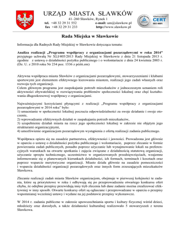 URZĄD MIASTA SŁAWKÓW 41–260 Sławków, Rynek 1 tel. +48 32 29 31 552 e-mail: [email protected] fax +48 32 29 31 233 http://www.slawkow.pl Rada Miejska w Sławkowie Informacja dla Radnych Rady Miejskiej w Sławkowie dotycząca tematu: Analiza realizacji „Programu współpracy z organizacjami pozarządowymi w roku 2014” przyjętego uchwałą Nr XLI/405/2013 Rady Miejskiej w Sławkowie z dnia 21 listopada 2013 r. zgodnie z ustawą o działalności pożytku publicznego i o wolontariacie z dnia 24 kwietnia 2003 r. (Dz. U. z 2010 roku Nr 234 poz. 1536 z późń.zm) Aktywna współpraca miasta Sławków z organizacjami pozarządowymi, stowarzyszeniami i klubami sportowymi jest elementem efektywnego kierowania miastem, realizacji jego zadań własnych oraz rozwoju tych organizacji. Celem głównym programu jest zaspokajanie potrzeb mieszkańców z jednoczesnym uznaniem roli aktywności obywatelskiej w rozwiązywaniu problemów społeczności lokalnej oraz chęć kształtowania długookresowej współpracy z organizacjami. Najważniejszymi korzyściami płynącymi z realizacji „Programu współpracy z organizacjami pozarządowymi w 2014 roku” było: 1) umacnianie w społeczności lokalnej poczucia odpowiedzialności za swoje działanie i swoje otoczenie, 2) wprowadzanie efektywnych działań w zaspakajaniu potrzeb mieszkańców, 3) uzupełnienie działań miasta na rzecz jego społeczności lokalnej w zakresie nie objętym jego strukturami organizacyjnymi, 4) umożliwienie organizacjom pozarządowym wystąpienia z ofertą realizacji zadania publicznego. Współpraca opiera się na zasadzie partnerstwa, efektywności i jawności. Prowadzona jest głównie w oparciu o ustawę o działalności pożytku publicznego i wolontariacie, poprzez zlecanie w formie powierzania zadań publicznych, ponadto poprzez użyczanie lub wynajmowanie lokali na preferencyjnych warunkach na otwarte spotkania i zajęcia związane z działalnością statutową organizacji, użyczanie sprzętu technicznego, uczestnictwo w organizowanych przedsięwzięciach, wzajemne informowanie się o planowanych kierunkach działalności, ich formach, terminach i kosztach oraz poprzez wsparcie merytoryczne organizacji. Miasto działa głównie na zasadzie pomocniczości i wsparcia działalności organizacji pozarządowych oraz innych form zrzeszających mieszkańców Sławkowa. Zlecanie realizacji zadań miasta Sławków organizacjom, obejmuje w pierwszej kolejności te zadania, które są priorytetowe w roku i odbywają się po przeprowadzeniu otwartego konkursu ofert chyba, że odrębne przepisy przewidują inny tryb zlecenia lub dane zadanie można zrealizować efektywniej w inny sposób. Otwarte konkursy ofert są ogłaszane i przeprowadzane w oparciu o przepisy wspomnianej wcześniej ustawy i wydane na jej podstawie przepisy wykonawcze. W 2014 r. zadania publiczne w zakresie upowszechniania sportu i kultury fizycznej wśród dzieci, młodzieży oraz dorosłych, a także działaności kulturalnej realizowało 5 stowarzyszeń z terenu Sławkowa. Lista zadań, stowarzyszeń oraz kwot przyznanych w drodze konkursu przez Burmistrza Miasta Sławków na rok 2014 1. Rodzaj zadania: Upowszechnianie rekreacji i kultury fizycznej na terenie miasta Sławkowa Dotację w kwocie 30 000,00 zł przyznano Klubowi Rekreacyjno-Sportowemu TKKF „Michałek” Na konkurs wpłynęła jedna oferta. 2. Rodzaj zadania: Upowszechnianie kultury fizycznej, ze szczególnym uwzględnieniem piłki nożnej wśród młodzieży i dorosłych na terenie miasta Sławkowa Dotację w kwocie 60 000,00 zł przyznano Miejskiemu Klubowi Sportowemu „Sławków” Na konkurs wpłynęła jedna oferta. 3. Rodzaj zadania: Upowszechnianie kultury fizycznej wśród dzieci na terenie miasta Sławkowa Dotację w kwocie 10 000,00 zł przyznano Uczniowskiemu Klubowi Sportowemu „Sławków” Na konkurs wpłynęła jedna oferta. 4. Rodzaj zadania: Oprawa muzyczna uroczystości państwowych w Sławkowie oraz miejskich imprez Dotację w kwocie 20 000,00 zł przyznano Orkiestrze Dętej Ochotniczej Straży Pożarnej. Na konkurs wpłynęła jedna oferta. 5. Rodzaj zadania: Wspomaganie rozwoju społeczności lokalnej miasta Sławkowa Dotację w kwocie 4 000,00 zł przyznano Towarzystwu Miłośników Sławkowa Na konkurs wpłynęła jedna oferta. Wszystkie konkursy były ogłoszone na powierzenie zadania. Klub Rekreacyjno – Sportowy TKKF „Michałek” realizował w 2014 r. zadanie publiczne w zakresie „Upowszechniania rekreacji i kultury fizycznej na terenie miasta Sławkowa”. Terenem działalności było miasto Sławków, a głównym miejscem realizacji zadania siedziba klubu. Prowadzone były zajęcia w poszczególnych sekcjach sportowych 2-3 razy w tygodniu, sekcja kulturystyki 5 razy w tygodniu. Zorganizowano następujące turnieje i rozgrywki sportowe: Turniej „5 - tek piłkarskich”, Mistrzostwa Sławkowa w Tenisie Ziemnym, Najwszechstronniejszy Zawodnik TKKF, V Turniej Tenisa Ziemnego, Turniej Mikołajkowy, Całoroczne Grand Prix (siłownia, tenis ziemny, bilard). Głównym celem realizacji zadania przez TKKF „Michałek” było podnoszenie sprawności fizycznej mieszkańców miasta Sławkowa, upowszechnianie systematycznego uprawiania rekreacji i kultury fizycznej na terenie miasta Sławkowa. Do dyspozycji członków TKKF oraz mieszkańców miasta były: boisko do gry w piłkę nożną, 2 korty do tenisa ziemnego o dwóch polach do gry, ścianka do gry w tenisa ziemnego, sala do gry w bilarda. Klub posiada salę fitness dla kobiet, salę do ćwiczeń siłowych oraz salę, w której znajdują się gry zręcznościowe. TKKF „Michałek” zrealizował zadanie publiczne w 2014 r. zgodnie z ofertą. Urząd Miasta Sławków Numer pisma: OS Data pisma: 05.03.2015 Strona 2 z 4 Miejski Klub Sportowy „Sławków” realizował w 2014 r. zadanie publiczne w zakresie „Upowszechnianie kultury fizycznej, ze szczególnym uwzględnieniem piłki nożnej wśród młodzież