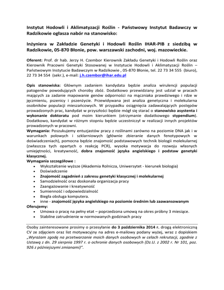 Instytut Hodowli i Aklimatyzacji Roślin - Państwowy Instytut Badawczy w Radzikowie ogłasza nabór na stanowisko: Inżyniera w Zakładzie Genetyki i Hodowli Roślin IHAR-PIB z siedzibą w Radzikowie, 05-870 Błonie, pow. warszawski zachodni, woj. mazowieckie. Oferent: Prof. dr hab. Jerzy H. Czembor Kierownik Zakładu Genetyki i Hodowli Roślin oraz Kierownik Pracowni Genetyki Stosowanej w Instytucie Hodowli i Aklimatyzacji Roślin – Państwowym Instytucie Badawczym w Radzikowie , 05-870 Błonie, tel. 22 73 34 555 (biuro), 22 73 34 554 (sekr.), e-mail: [email protected] Opis stanowiska: Głównym zadaniem kandydata będzie analiza wirulencji populacji patogenów powodujących choroby zbóż. Dodatkowo przewidziany jest udział w pracach mających za zadanie mapowanie genów odporności na mączniaka prawdziwego i rdze w jęczmieniu, pszenicy i pszenżycie. Przewidywana jest analiza genetyczna i molekularna osobników populacji mieszańcowych. W przypadku osiągnięcia zadawalających postępów prowadzonych prac, kandydat w przyszłości będzie mógł się starać o stanowisko asystenta i wykonanie doktoratu pod moim kierunkiem (otrzymanie dodatkowego stypendium). Dodatkowo, kandydat w różnym stopniu będzie uczestniczył w realizacji innych projektów prowadzonych w pracowni. Wymagania: Poszukujemy entuzjastów pracy z roślinami zarówno na poziomie DNA jak i w warunkach polowych i szklarniowych (głównie zbieranie danych fenotypowych w doświadczeniach), pomocna będzie znajomość podstawowych technik biologii molekularnej (zwłaszcza tych opartych o reakcję PCR), wysoka motywacja do rozwoju własnych umiejętności, kreatywność, dobra znajomość języka angielskiego i podstaw genetyki klasycznej. Wymagania szczegółowe : Wykształcenie wyższe (Akademia Rolnicza, Uniwersytet - kierunek biologia) Doświadczenie Znajomość zagadnień z zakresu genetyki klasycznej i molekularnej Samodzielność oraz doskonała organizacja pracy Zaangażowanie i kreatywność Sumienność i odpowiedzialność Biegła obsługa komputera. inne - znajomość języka angielskiego na poziomie średnim lub zaawansowanym Oferujemy: Umowa o pracę na pełny etat – poprzedzona umową na okres próbny 3 miesiące. Stabilne zatrudnienie w normowanych godzinach pracy Osoby zainteresowane prosimy o przesyłanie do 3 października 2014 r. drogą elektroniczną CV ze zdjęciem oraz list motywacyjny na adres e-mailowy podany wyżej, wraz z dopiskiem „Wyrażam zgodę na przetwarzanie moich danych osobowych w celach rekrutacji, zgodnie z Ustawą z dn. 29 sierpnia 1997 r. o ochronie danych osobowych (Dz.U. z 2002 r. Nr 101, poz. 926 z późniejszymi zmianami)”.