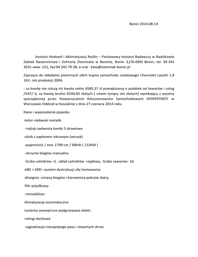 Bonin 2014.08.14 Instytut Hodowli i Aklimatyzacji Roślin – Państwowy Instytut Badawczy w Radzikowie Zakład Nasiennictwa i Ochrony Ziemniaka w Boninie, Bonin 3,(76-009) Bonin, tel. 94 342 3031 wew. 221, fax:94 342 70 28, e-mai [email protected] Zaprasza do składania pisemnych ofert kupna samochodu osobowego Chevrolet Lacetti 1.8 16V, rok produkcji 2004. - za kwotę nie niższą niż kwota netto 6585,37 zł powiększoną o podatek od towarów i usług /VAT/ tj. za kwotę brutto 8100,00 złotych ( osiem tysięcy sto złotych) wynikający z wyceny sporządzonej przez Stowarzyszenie Rzeczoznawców Samochodowych EKSPERTMOT w Warszawie Oddział w Koszalinie z dnia 27 czerwca 2014 roku. Dane i wyposażenie pojazdu: -kolor niebieski metalik - rodzaj nadwozia kombi 5 drzwiowe -silnik z zapłonem iskrowym (wtrysk) - pojemność / moc 1799 cm / 90kW ( 122KM ) - skrzynia biegów manualna - liczba cylindrów -4, układ cylindrów -rzędowy, liczba zaworów -16 -ABS + EBD –system dystrybucji siły hamowania -dźwignia zmiany biegów i kierownica pokryte skórą -filtr p/pyłkowy - immobiliser -klimatyzacja automatyczna -lusterka zewnętrzne podgrzewane elektr. -relingi dachowe - sygnalizacja niezapiętego pasa i otwartych drzwi - system p/poślizgowy przy przyspieszaniu ASR - wskaźnik temperatury zewnętrznej - wspomaganie układu kierowniczego zmienne - poduszki powietrzne kierowcy, pasażera oraz boczne przednie - radioodtwarzacz CD - zegar cyfrowy - zamek centralny zdalnie sterowany - drugi komplet kół - przebieg w pełni udokumentowany - serwisowany w autoryzowanym zakładzie Oferty z podaniem ceny nabycia i oznaczeniem oferenta /imię i nazwisko, adres, oznaczenie przedsiębiorcy, telefon / należy składać w Zakładzie Nasiennictwa i Ochrony Ziemniaka w Boninie pok. Nr 35 w terminie do dnia 10.09.2014 roku, godz. 10°° Szczegółowe informacje o przedmiocie sprzedaży można uzyskać w Zakładzie w Boninie tel.94 342 30 31 wew. 221